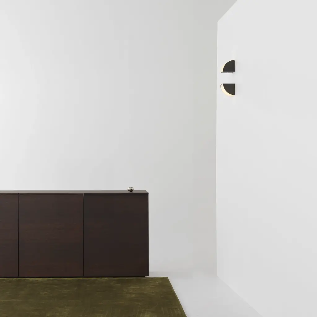 The Phase Wall Sconce, designed by Estudio Persona, is inspired by the phases of the moon, emphasizing the interplay between light and shadow. This compact sconce features a crescent shape, creating a sculptural presence on any wall. It comes in dark bronze or white finishes, with a warm LED-lit acrylic diffuser enhanced by a subtle linen-like texture. The fixture is dimmable, providing versatile ambiance control, and is intended for indoor use only. Handmade in New Zealand, the Phase Wall Sconce is part of a larger collection that includes pendants and table lights, all designed to balance aesthetics and functionality through bold yet minimal forms.