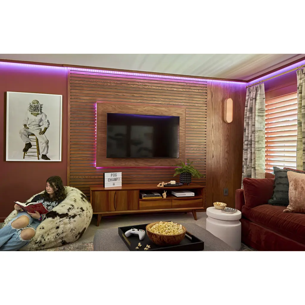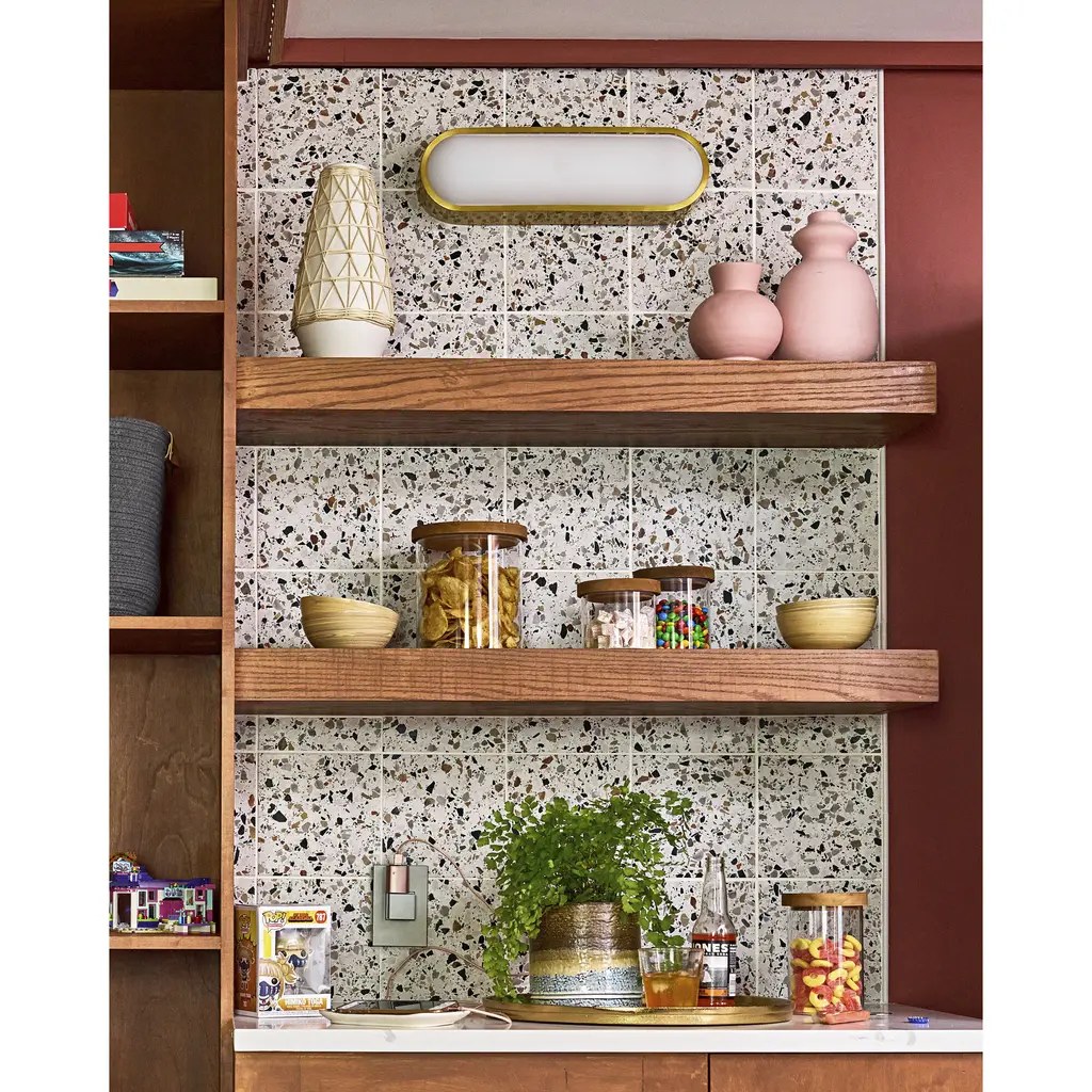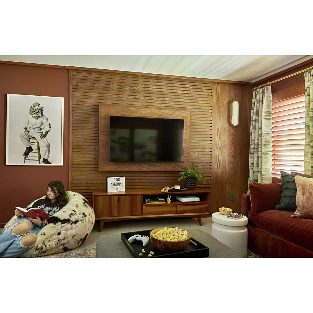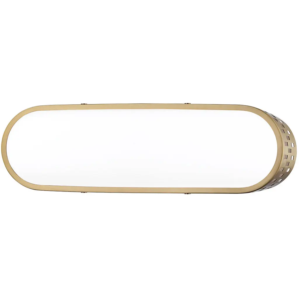 Whether in capsule-shaped sconces or pod-hatch-shaped flush mounts, Phoebe’s futuristic vibe is totally present with a pattern of square and rectangle perforations along its metal frame, which allow extra light ventilation from its sides.
