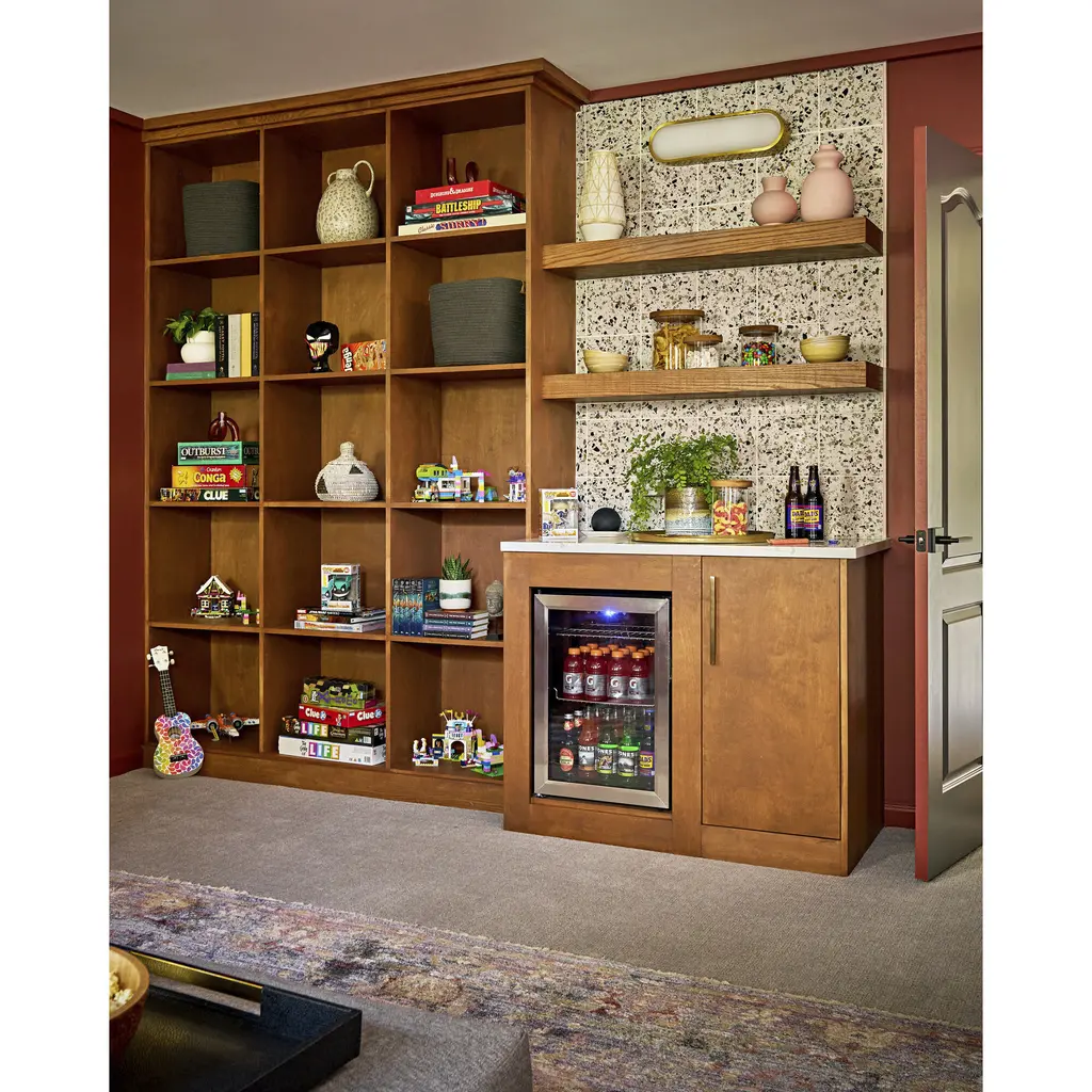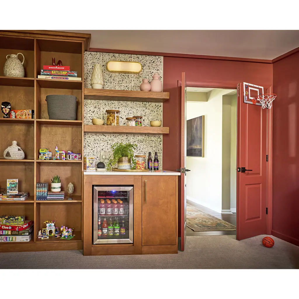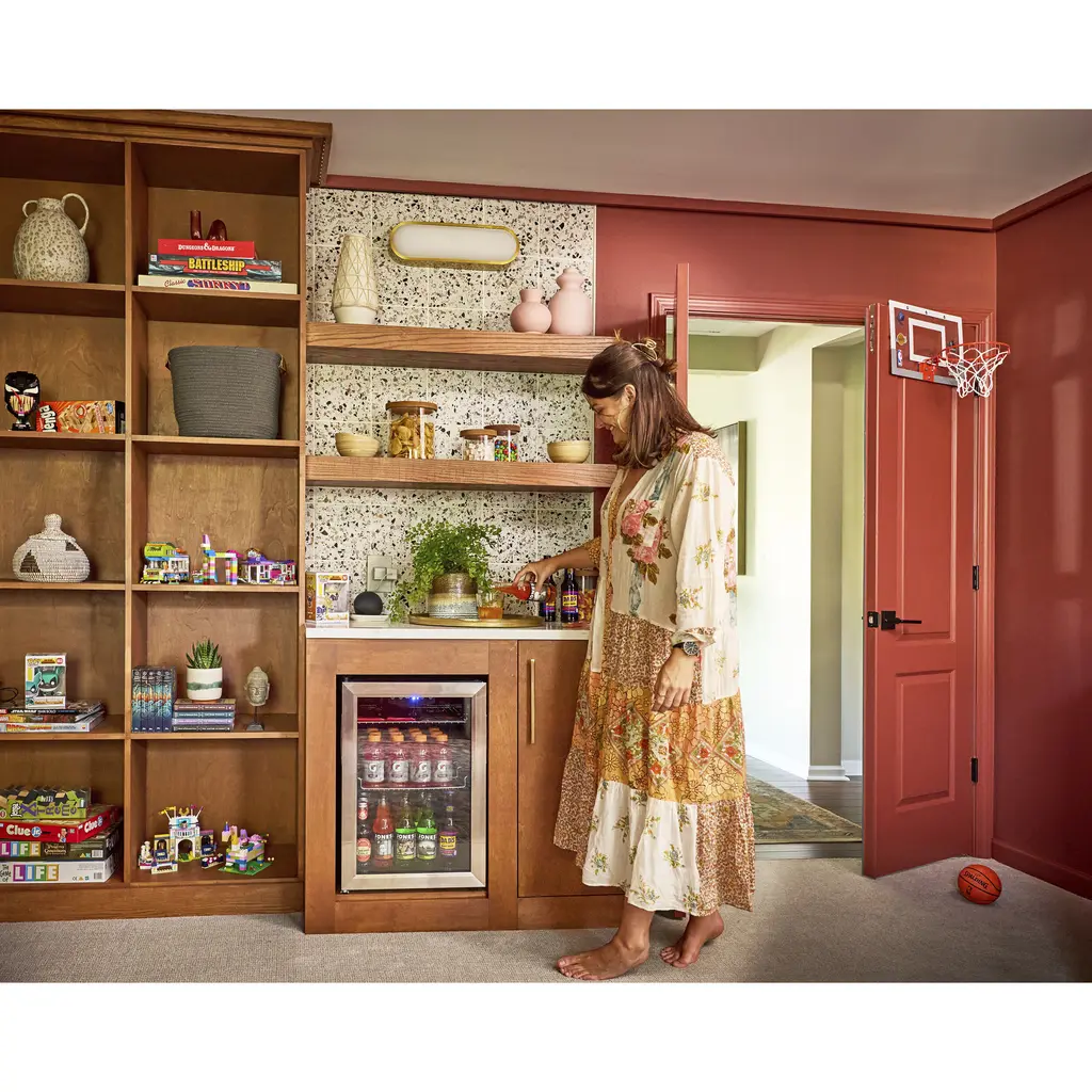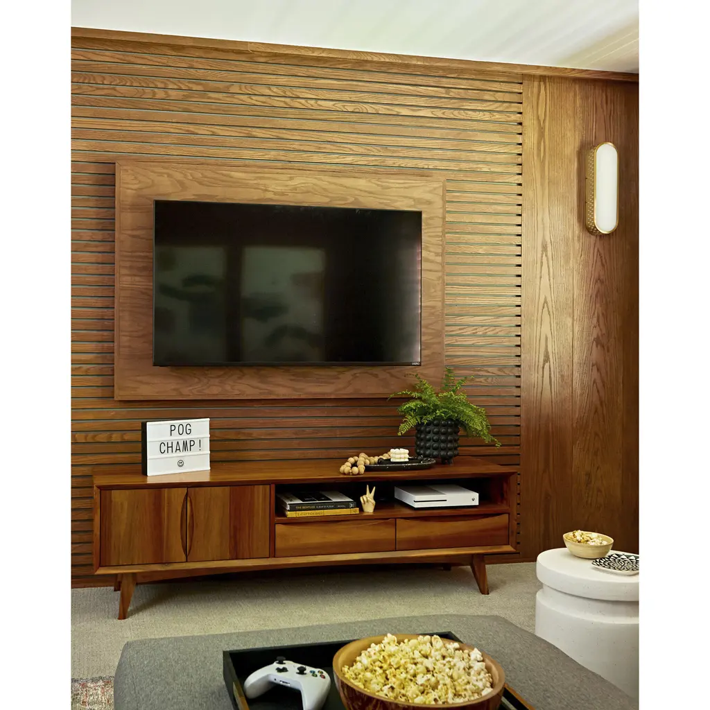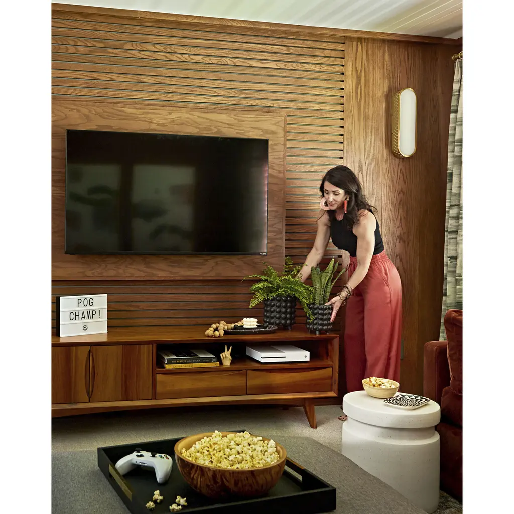 Whether in capsule-shaped sconces or pod-hatch-shaped flush mounts, Phoebe’s futuristic vibe is totally present with a pattern of square and rectangle perforations along its metal frame, which allow extra light ventilation from its sides.