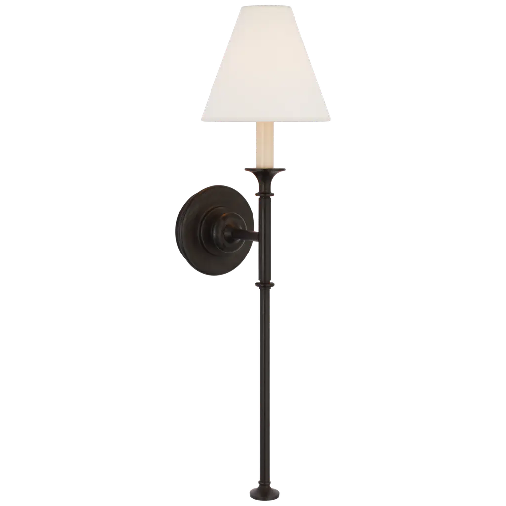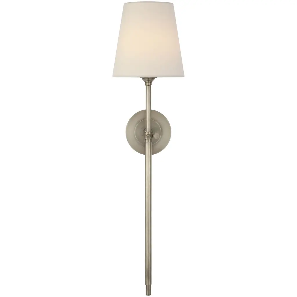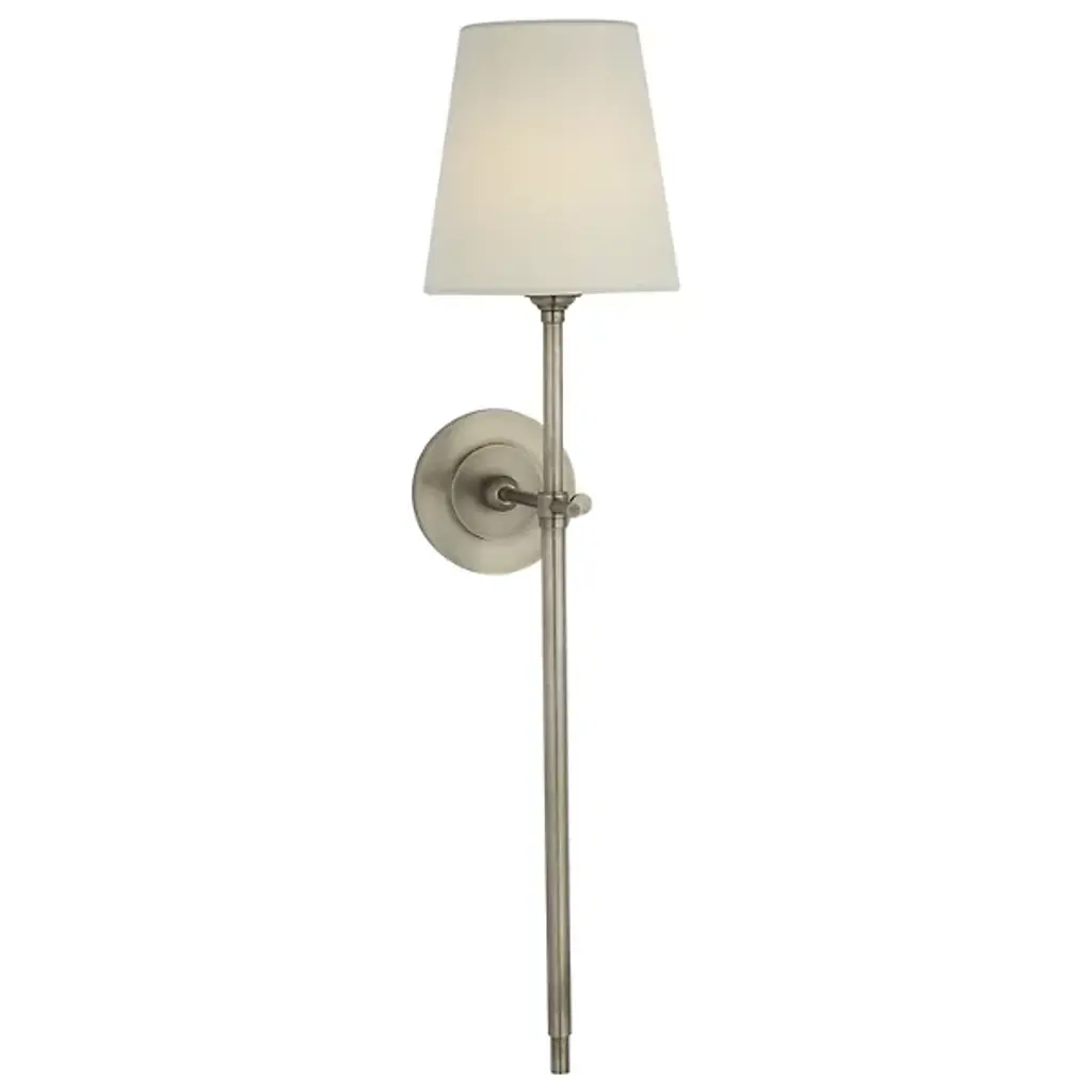 The details make the difference in the neatly styled transitional design of the Piaf Tail Wall Sconce from Visual Comfort Signature, formerly known as Visual Comfort, The sconce satisfies a range of home styles, as it possesses clean, modern lines and familiar traditional ornamentation. Its versatility continues in mounting as it sports a compact backplate that can be slotted next to an entryway or over a column. Held in front, a slender stem guides the eye to the light source with subtle rounded accents. A milky lamp holder on top evokes classic candles. The tapered linen shade protects the eyes from glare and helps create a pleasant ambiance.