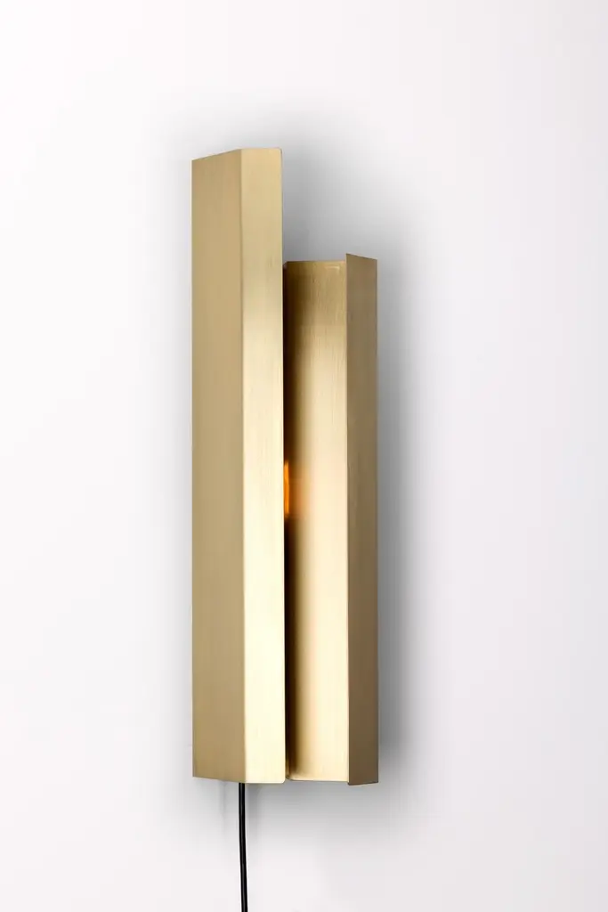 Piega wall sconce by MingardoDimensions: D15 x W18x H59 cm Materials: Satin natural brassWeight: 6 kgAlso Available in different finishes.All our lamps can be wired according to each country. If sold to the USA it will be wired for the USA for instance.Sfoglia and Piega are two bright items made of black steel and raw brass.The two wall lamps are realized with the combination of bending metal sheets. The overlapping effect of metal sheets creates a sculpted shape while inside the lamp, there is an E27 light bulb with cable and plug. It generates unique and different bright shapes on the wall, only using a small spike and using more of them you will create different light games on the house walls.Mingardo Ilario founded Mingardo Blacksmith Workshop in 1970, after over twenty years’ experience in the metal processing field.The production was initially focused on simple blacksmith works for the construction industry. Over the time, it has become more refined, enabling the company to collaborate with internationally renowned companies and architects: from the first collaborations with architect Carlo Scarpa to the more recent commissions for Museo del Novecento in Milan, Parco della Musica in Florence, and Teatro Petruzzelli in Bari.Over the years, the Workshop has achieved great results, with the production of unique metal products, all hand-wrought by a highly skilled team of specialized artisans. Nowadays, it is highly regarded in the local artisan field for its high-end refined finishing touches and details, and for its know-how.