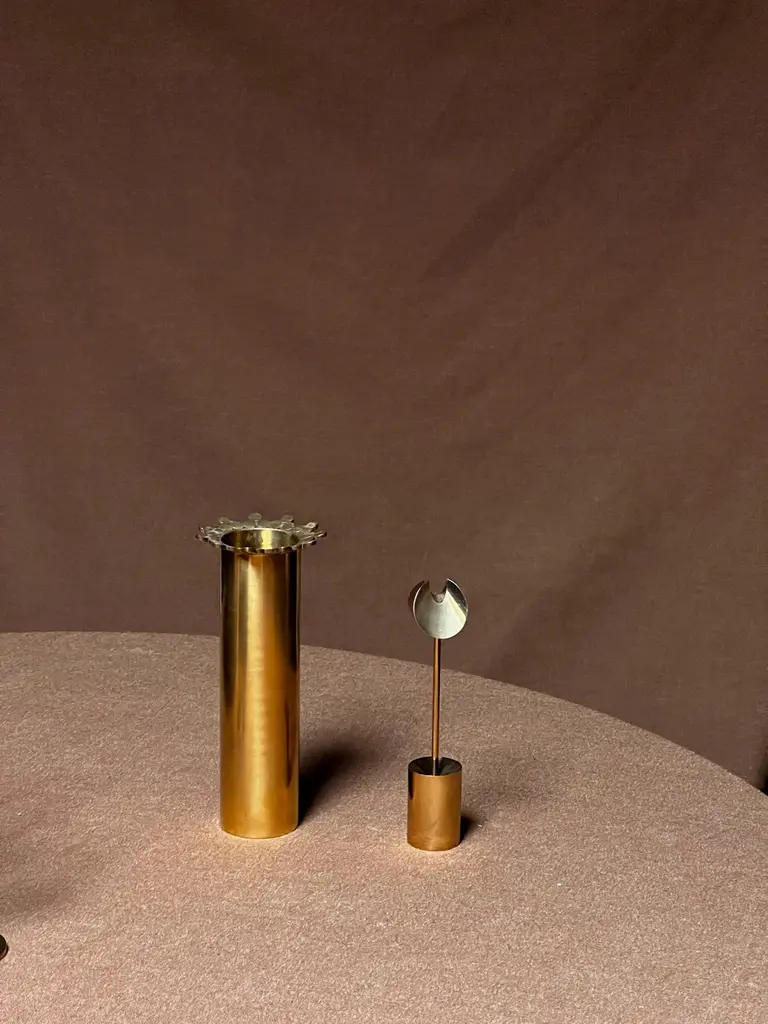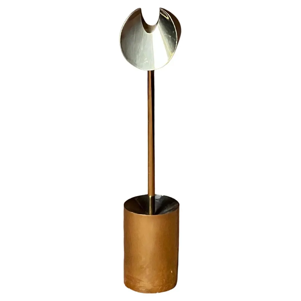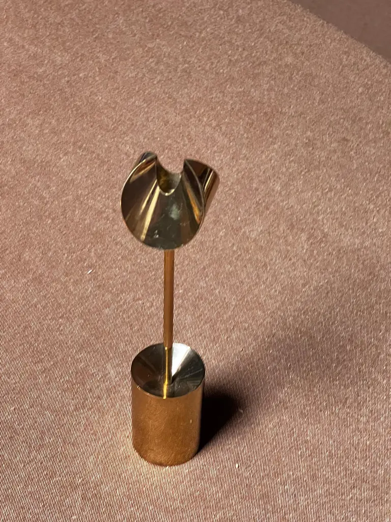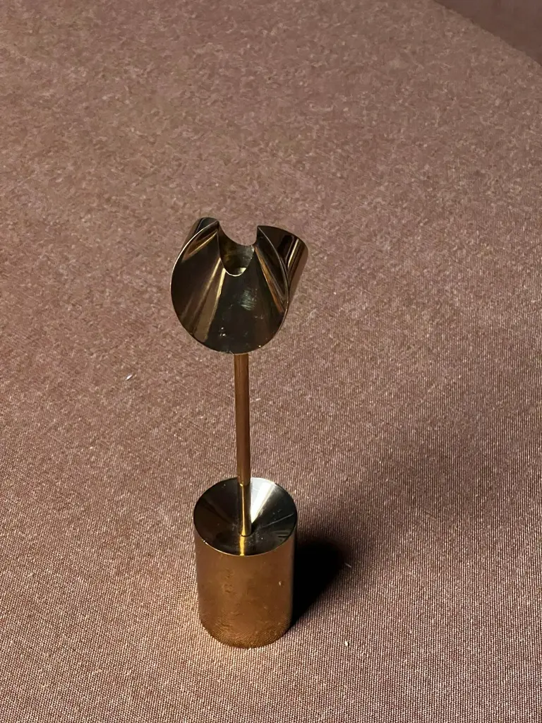 This candleholders was hand crafted in the 1970's at the Skultuna factory next to the studio were Pierre Forssell was working with he's assistant. The candleholder is made of brass. Simple, minimal and elegant at the same time. The incurved top provides some warm reflection. Pierre was inspired by Brancusi when visiting the museum in Stockholm. The size is great to be used on a table, on a buffet or on a desk. But more than a candleholder it's a sculpture. We do have more exemple in our collection. Feel free to reach out for others models. _____________________________________________________________Pierre Oskar Paul Forssell, born 1925 in Stockholm, died 2004, was a Swedish designer, craftsman and silversmith.Forssell worked for Gense 1952–1964 where he designed the Piruett swivel fork (introduced 1955 on the H55, launched 1959) and the Spectra cutlery range (1961). He also carried out work for Skultuna Messingsbruk between the years 1955 and 1986, for example the wall sconces Pendel and Reflex. He also designed sacred art in brass, such as crosses and candlesticks, for several church rooms.