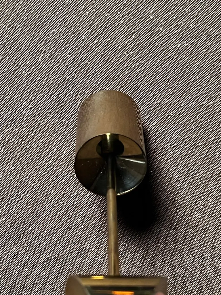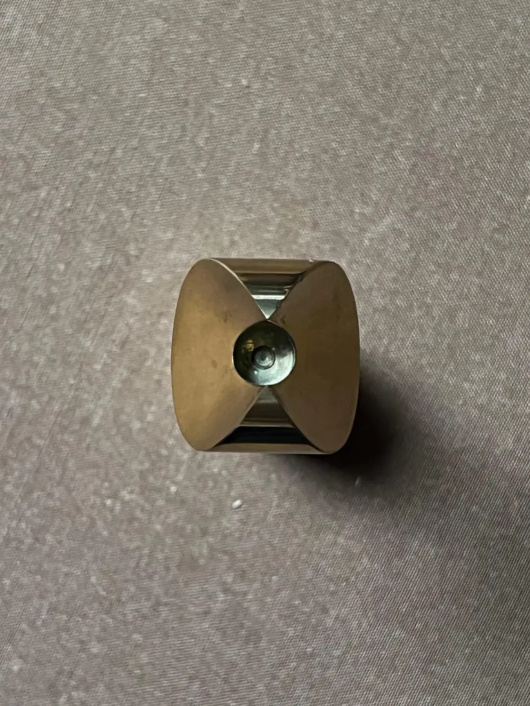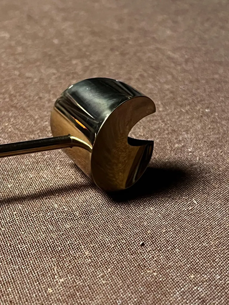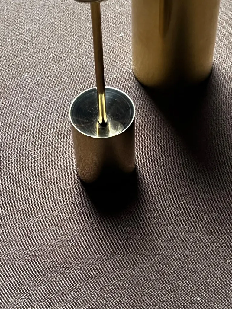 This candleholders was hand crafted in the 1970's at the Skultuna factory next to the studio were Pierre Forssell was working with he's assistant. The candleholder is made of brass. Simple, minimal and elegant at the same time. The incurved top provides some warm reflection. Pierre was inspired by Brancusi when visiting the museum in Stockholm. The size is great to be used on a table, on a buffet or on a desk. But more than a candleholder it's a sculpture. We do have more exemple in our collection. Feel free to reach out for others models. _____________________________________________________________Pierre Oskar Paul Forssell, born 1925 in Stockholm, died 2004, was a Swedish designer, craftsman and silversmith.Forssell worked for Gense 1952–1964 where he designed the Piruett swivel fork (introduced 1955 on the H55, launched 1959) and the Spectra cutlery range (1961). He also carried out work for Skultuna Messingsbruk between the years 1955 and 1986, for example the wall sconces Pendel and Reflex. He also designed sacred art in brass, such as crosses and candlesticks, for several church rooms.