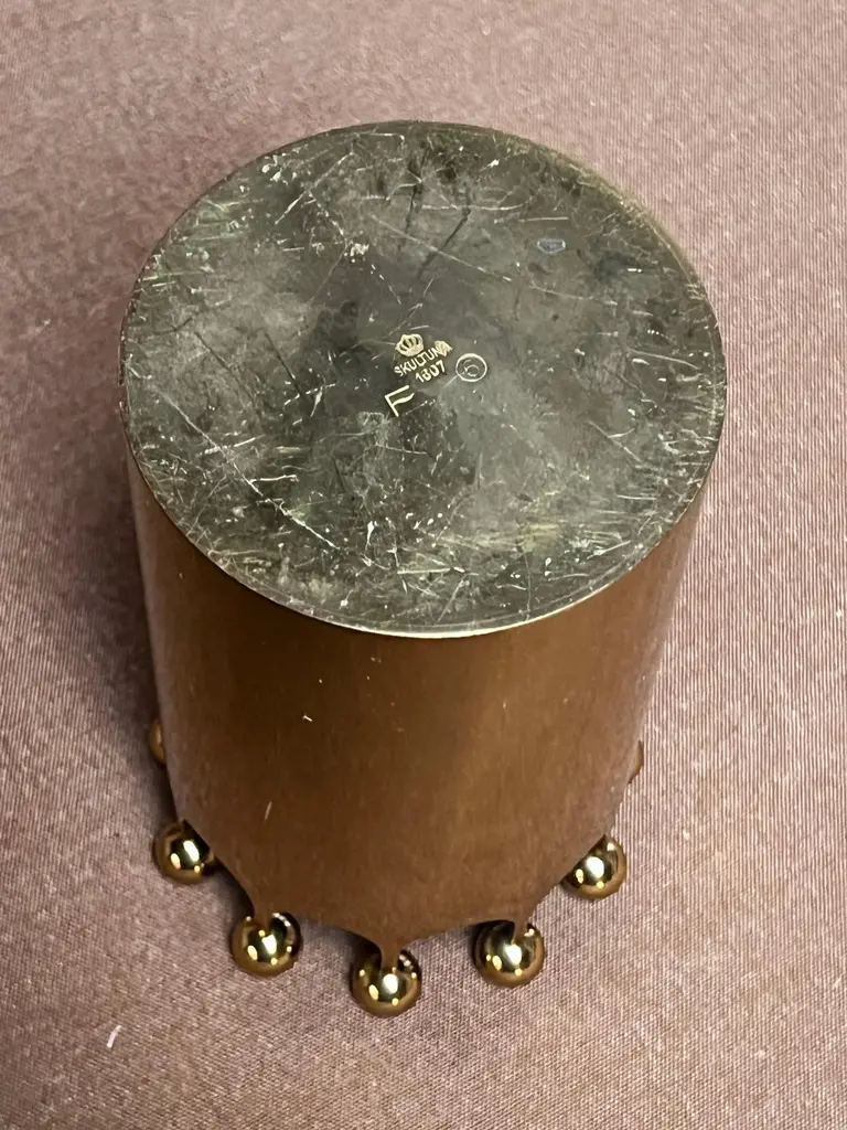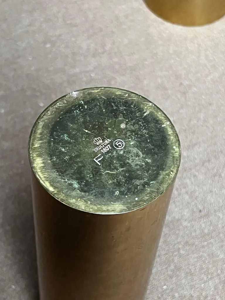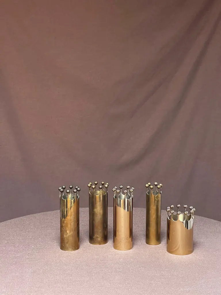 This series of Vases was hand crafted in the 1970's and 1980's at the Skultuna studio were Pierre Forssell was working with his assistant. The vases is made of brass. Simple, minimal and elegant at the same time. The small balls provides a warm and chic feeling. Pierre was inspired by Brancusi when visiting the museum in Stockholm. The size is great to be used on a table, on a buffet or on a desk. But more than a candleholder it's a sculpture. We do have more exemple in our collection. Feel free to reach out for others models. model on the left : H 24 Ø 9 cm in the middle : H 24 Ø 7 xm on the right : H 17 Ø 11 cm _____________________________________________________________Pierre Oskar Paul Forssell, born 1925 in Stockholm, died 2004, was a Swedish designer, craftsman and silversmith.Forssell worked for Gense 1952–1964 where he designed the Piruett swivel fork (introduced 1955 on the H55, launched 1959) and the Spectra cutlery range (1961). He also carried out work for Skultuna Messingsbruk between the years 1955 and 1986, for example the wall sconces Pendel and Reflex. He also designed sacred art in brass, such as crosses and candlesticks, for several church rooms.
