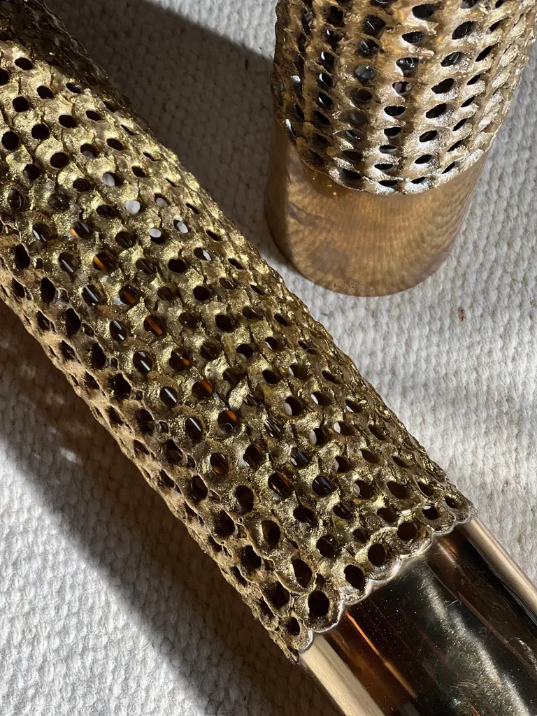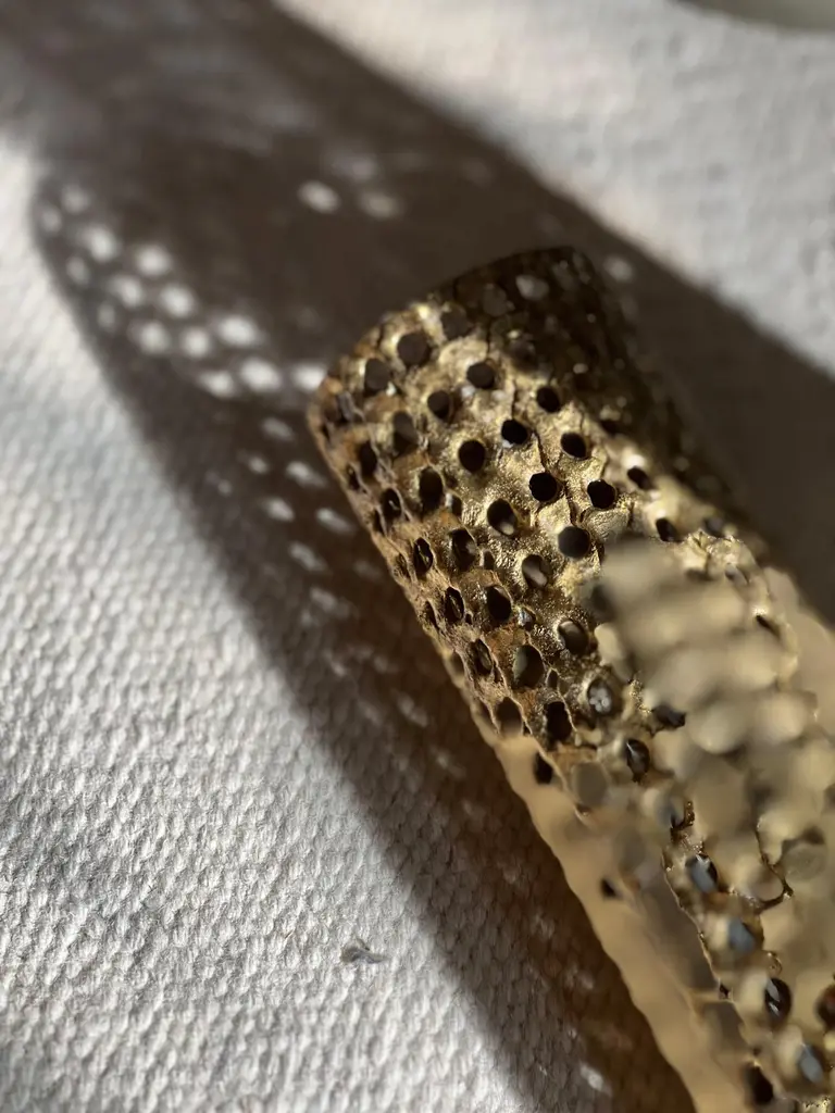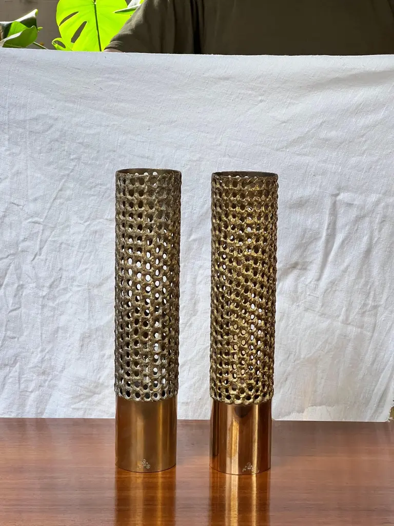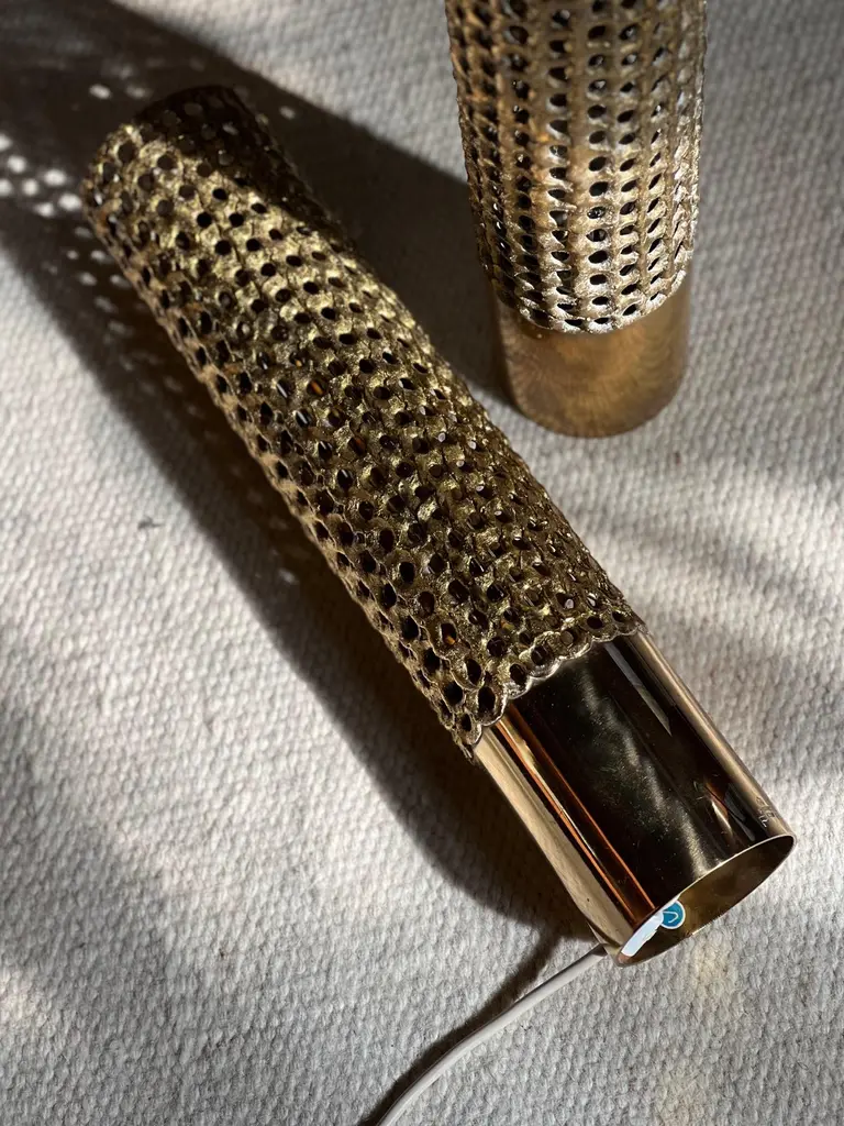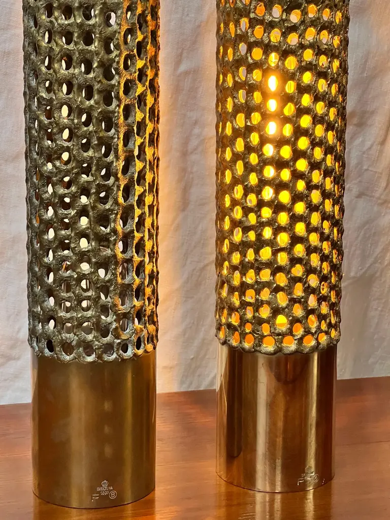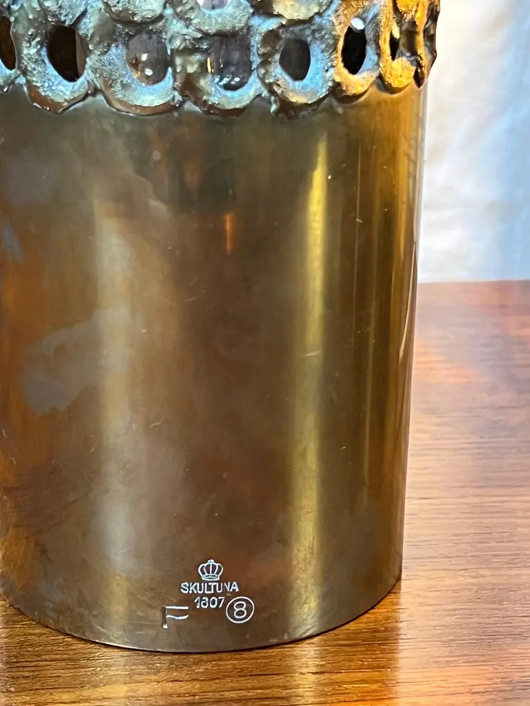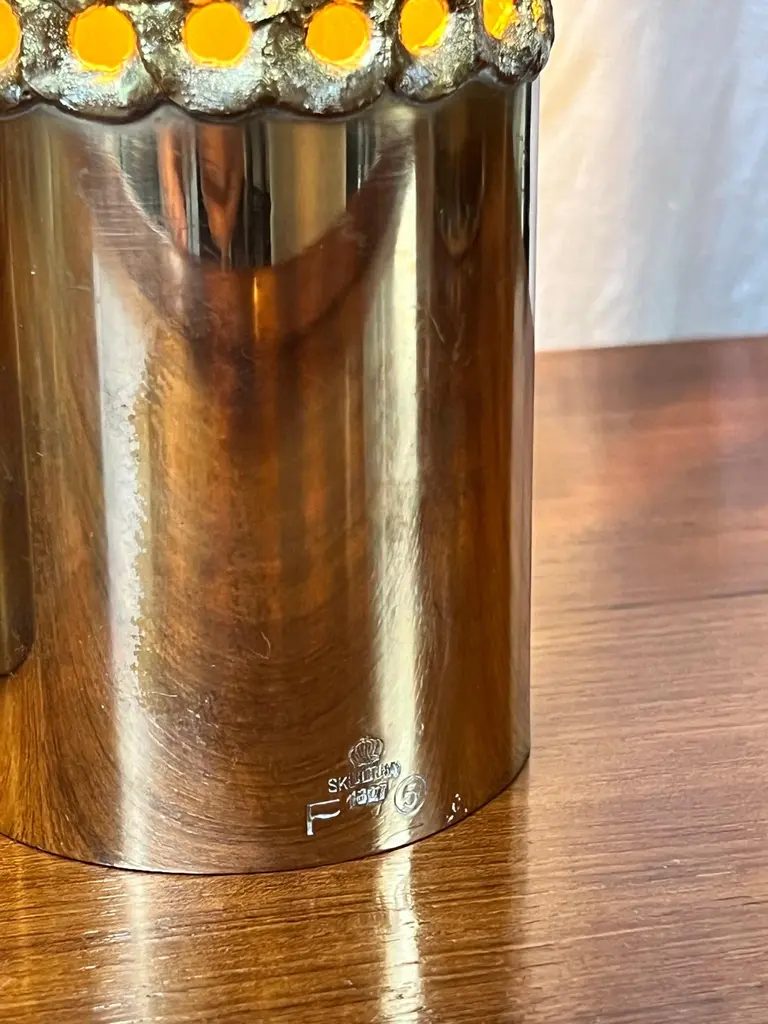 This table lamp was hand crafted in 1975 and 1978 at the Skultuna studio were Pierre Forssell was working with he's assistant. The lamp is made of a brass tube where some holes were drilled with the torch by these skilled craftsmans. Simple, minimal and elegant at the same time. The holes provides some warm atmosphere. The size is great to be used as a nightstand table, on a buffet or on a desk. Also in any other room as an entrance of the house. We do have a smaller version and suspensions in our collection. Feel free to reach out for a other models. _____________________________________________________________Pierre Oskar Paul Forssell, born 1925 in Stockholm, died 2004, was a Swedish designer, craftsman and silversmith.Forssell worked for Gense 1952–1964 where he designed the Piruett swivel fork (introduced 1955 on the H55, launched 1959) and the Spectra cutlery range (1961). He also carried out work for Skultuna Messingsbruk between the years 1955 and 1986, for example the wall sconces Pendel and Reflex. He also designed sacred art in brass, such as crosses and candlesticks, for several church rooms.