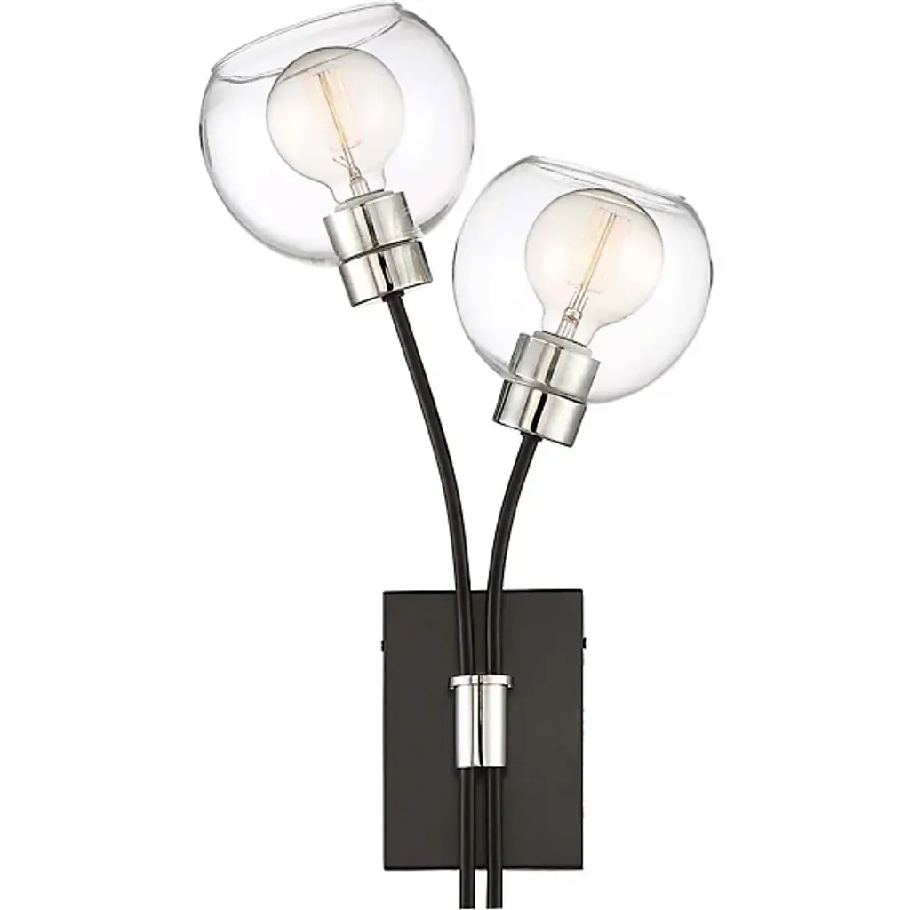 A playful approach to modern lighting, the Pierre Wall Sconce from Zeev Lighting enchants spaces with a sleek and shining display. Two vertical threaded metal rods delicately mount to a backplate by way of a crisp metal tubing that adds a complementary layer of color to the silhouette. Above the panel, the rods bend slightly as they present two fishbowl-shaped shades for a casual demonstration as if the weight of the bulbs skewed the form of the piece. Each light shines a bright, clean illumination through the clear glass.