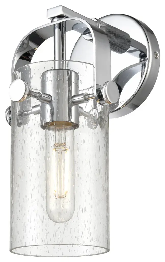 INNOVATIONS 423-1W-PC-G411-6SDY Pilaster II Cone 1 6.5 inch Sconce Polished Chrome. Style: Industrial, Farmhouse, Restoration-Vintage. Collection Name: Downtown Urban. Metal Finish(Body): Polished Chrome. Material: Steel, Cast Brass, Glass. Dimension(in): 10.125(H) x 6.5(W) x 7.625(Ext). Bulb: (1)6W LED(Included). Voltage: 120. Dimmable: Yes. Color Temperature (Kelvin): 2700. Color Rendering Index (CRI): 90. Lumens: 750. Life Expectancy (Hours): 15000. Glass Shade Description: Seedy Pilaster II Cone. Glass Type: Seeded. Shade Shape: Cone. Glass or Metal Shade Color: Seedy. Shade Material: Glass. Shade Dimension(in): 6.5(W) x 7(H). ADA Compliant: No. California Proposition 65 Warning Required: Yes. UL/ETL Certification Type: Damp Location.