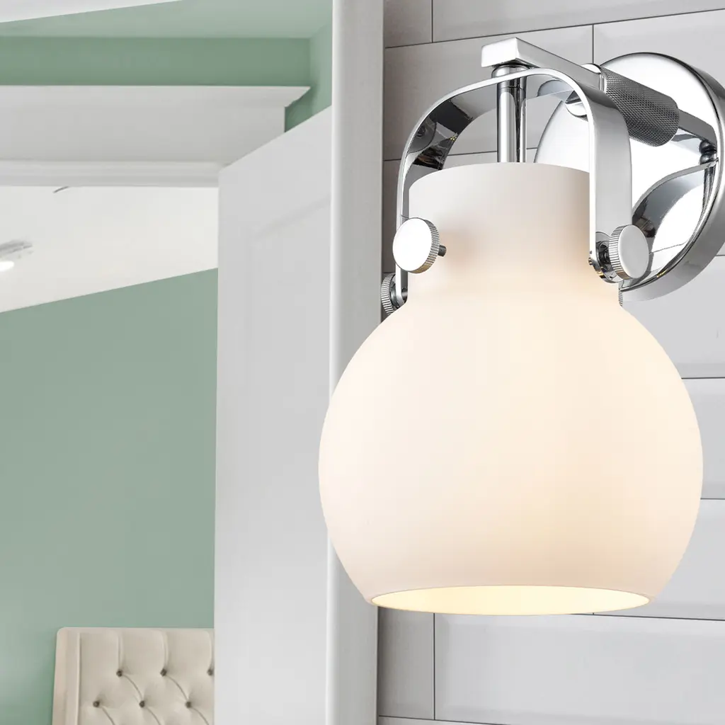 Pilaster Ii Sphere Sconce Wall Light In Polished Chrome, Matte White Glass