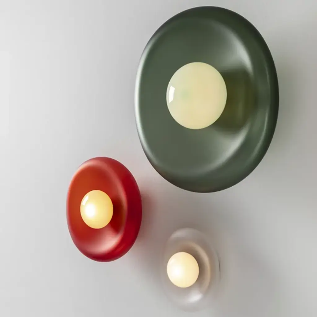The Pillow Wall / Flushmount from SkLO features a captivating design where glowing glass spheres rest inside the curving recess of a larger frosted glass "pillow." This blend of soft, organic geometry introduces a whimsical yet sophisticated touch to any room. The contrast between the smooth, smaller glass spheres and the concave frosted outer glass creates an intriguing visual complexity, drawing attention to its unique design. Perfect for adding charm and elegance, this sconce elevates any space with its artful, playful appeal.