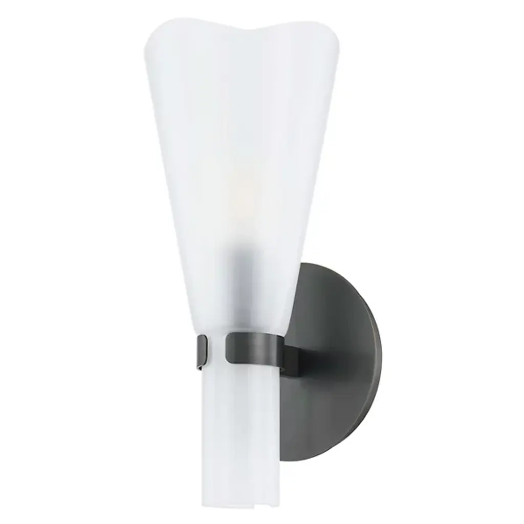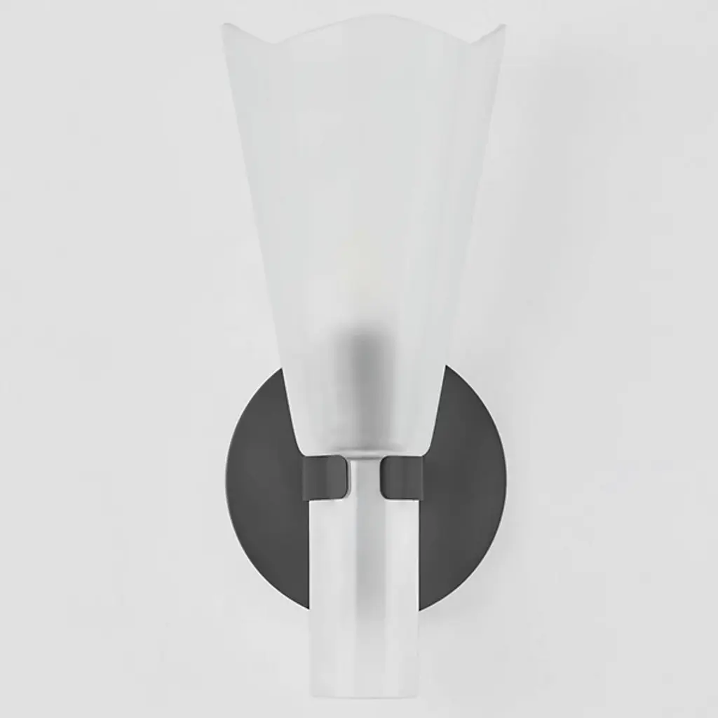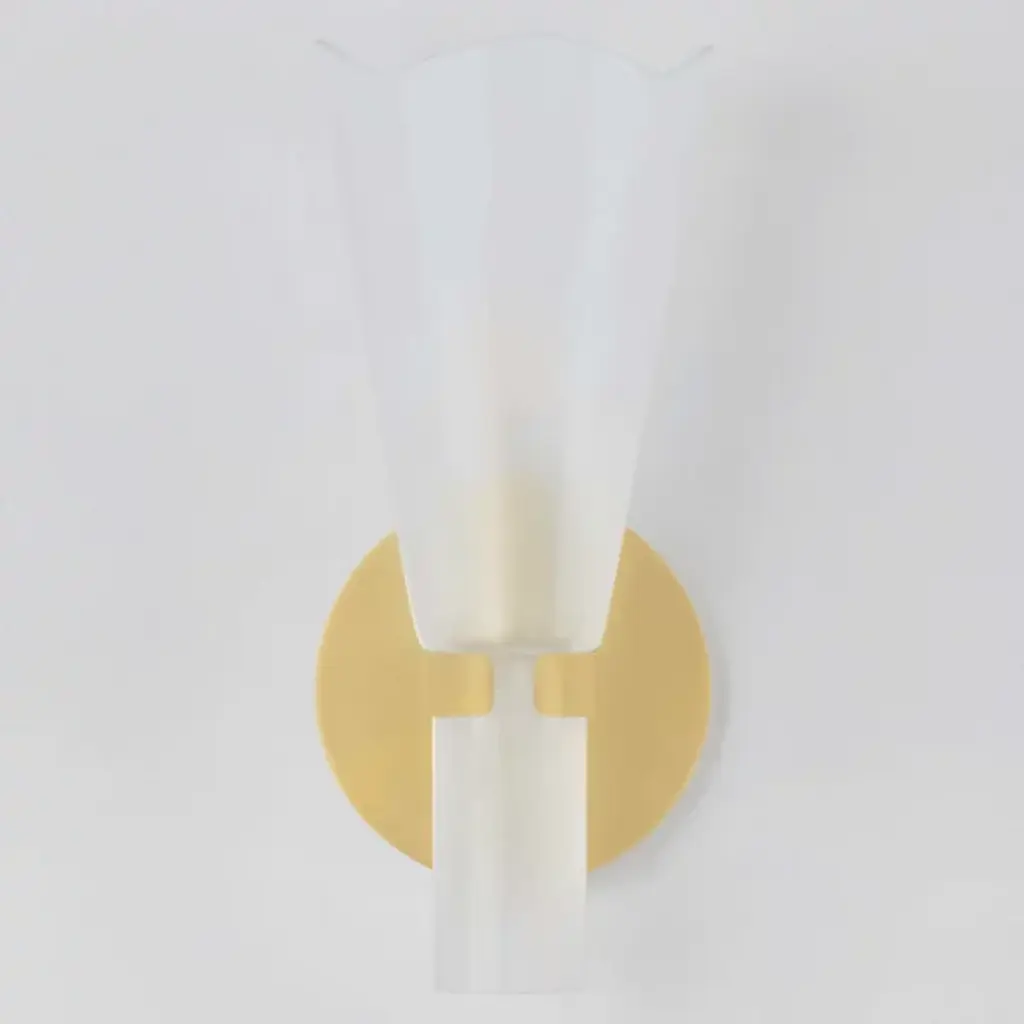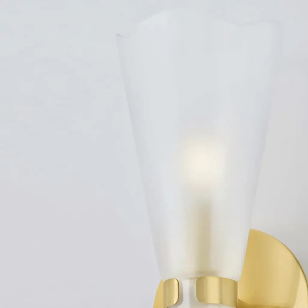 The Pine Island Wall Sconce from Hudson Valley Lighting captures floral grace in etched glass. The shade's top edge ripples like petals in the breeze while precise grooves anchor it securely to its mount. When lit, the etched pattern diffuses light with slight delicacy. A restrained metal frame lets the artistry of the glass take prominence. This sconce brings garden-inspired radiance to powder rooms and hallways, taking over the space.