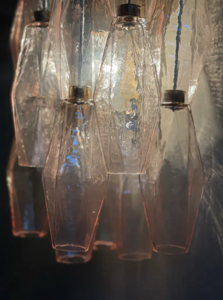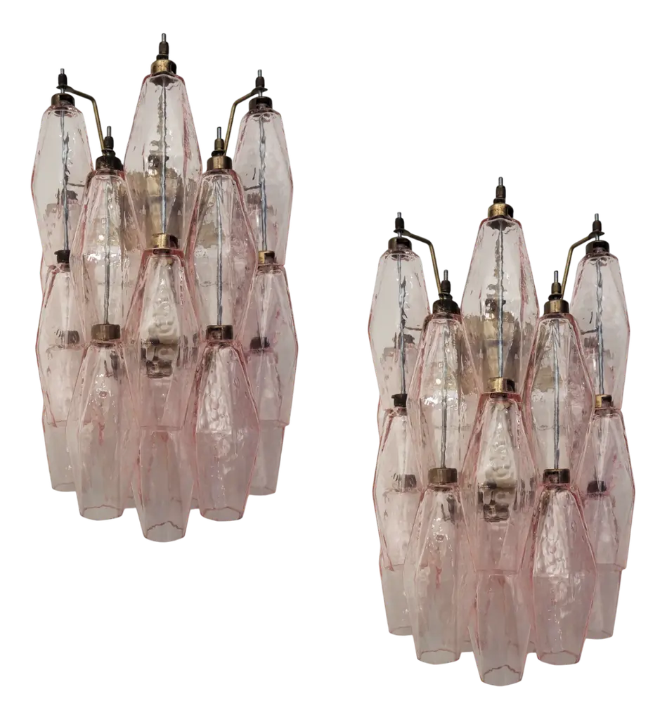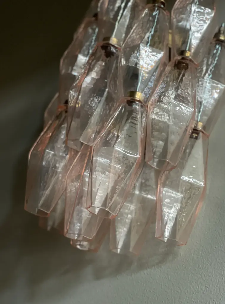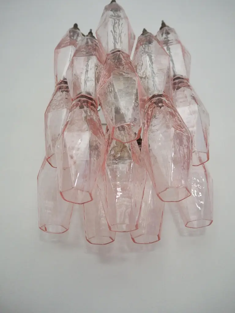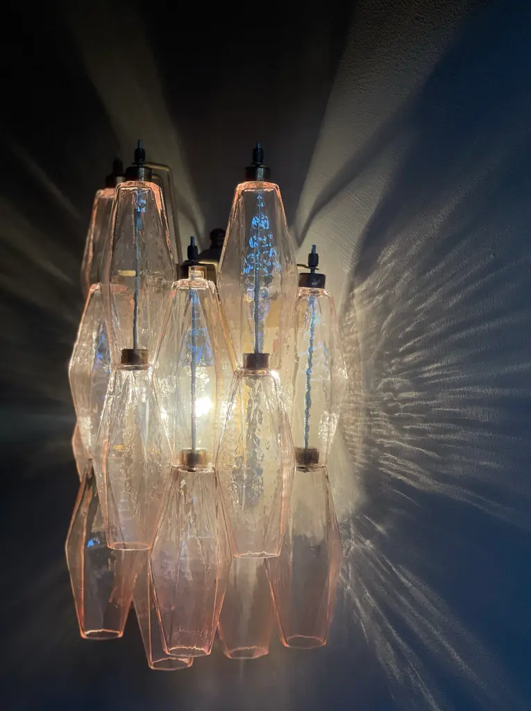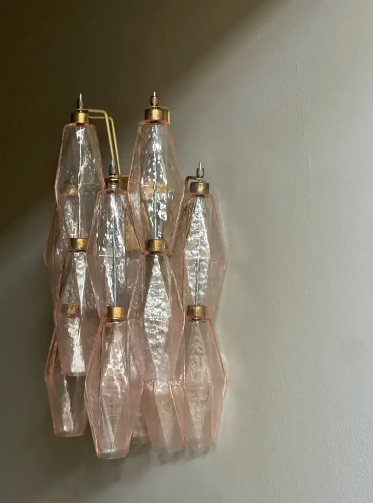Pink murano wall lamp consisting of sixteen handmade, pink colored crystal prisms with finishes and fittings painted in gold. Glass from the italian murano district. Traditional italian mid-century style, produced in italy during the 21th century. One e14 bulb. Excellent condition. Dimensions: h 40 cm x w 25 cm x d 15 cm h 15.7in. X w 9.8 in. X d 5.9 in complimentary rewiring to us electrical standard. european plug (up to 250v).the wiring of this item may be original and might need replacement, if not specified otherwise.