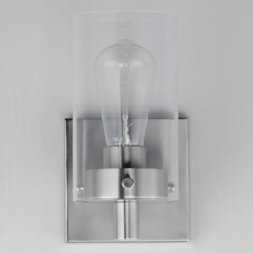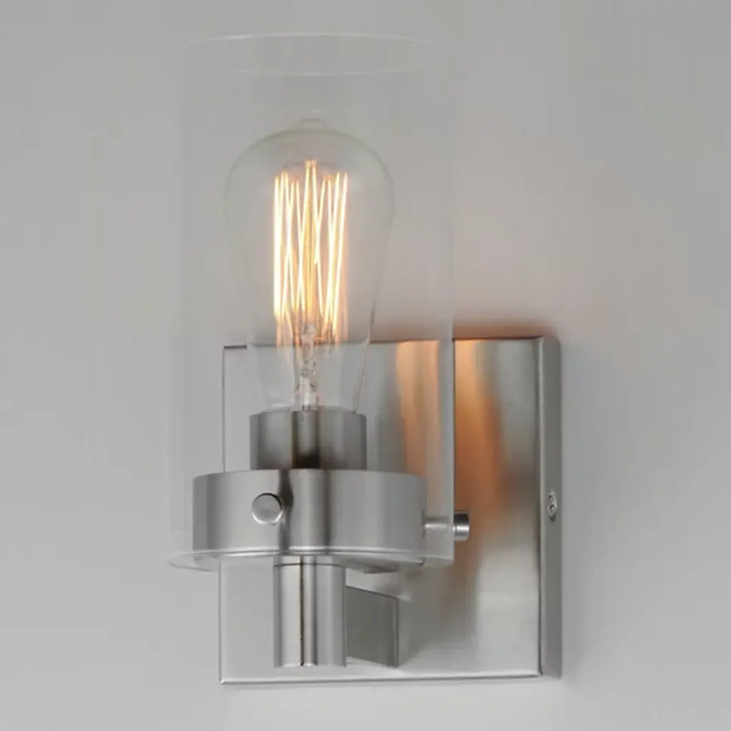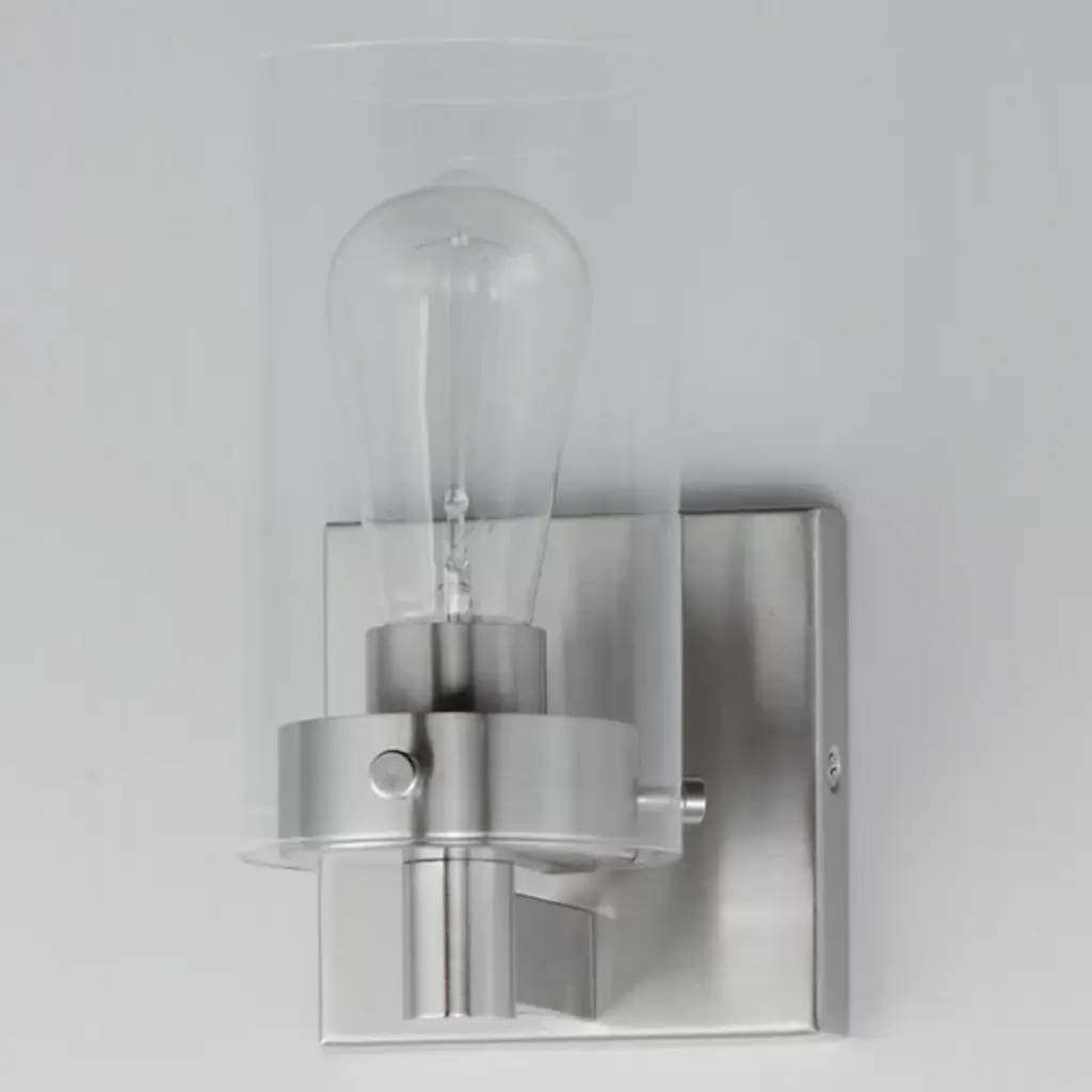 Presented by Maxim Lighting, the Pinn Bath Sconce is a transitionally styled luxury light furnishing. A simple, clear glass cylinder is secured by decorative thumb screws for an industrial-style influence. It is both neutral in design and suitable for damp applications. Display the Pinn as a solo piece or in multiples to complete your lighting design vision.