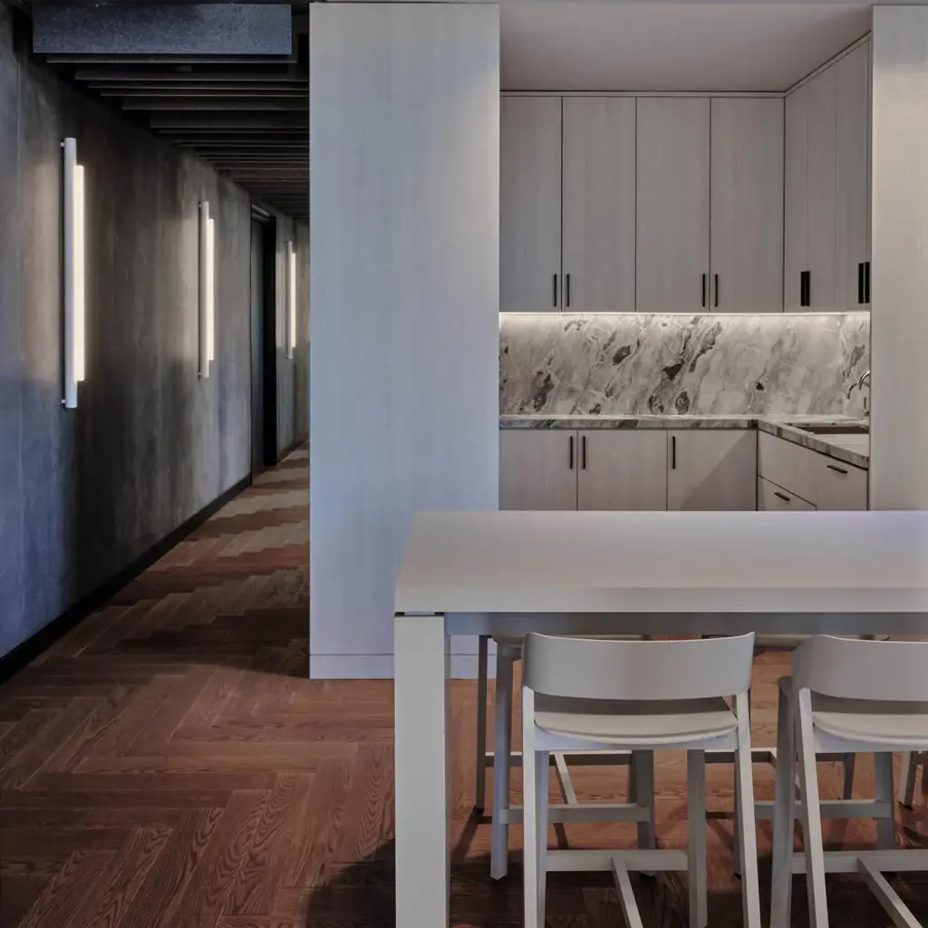 A longer version of Pipeline’s surface-mounted LED boasts an attractively slim design that also suits the technical challenges of limited spaces. The fixture’s linear look melds with its interior setting, readily adaptable to lower ceilings, tight corners and narrow corridors, a glowing band of warmly diffused illumination in a sleek casing.
