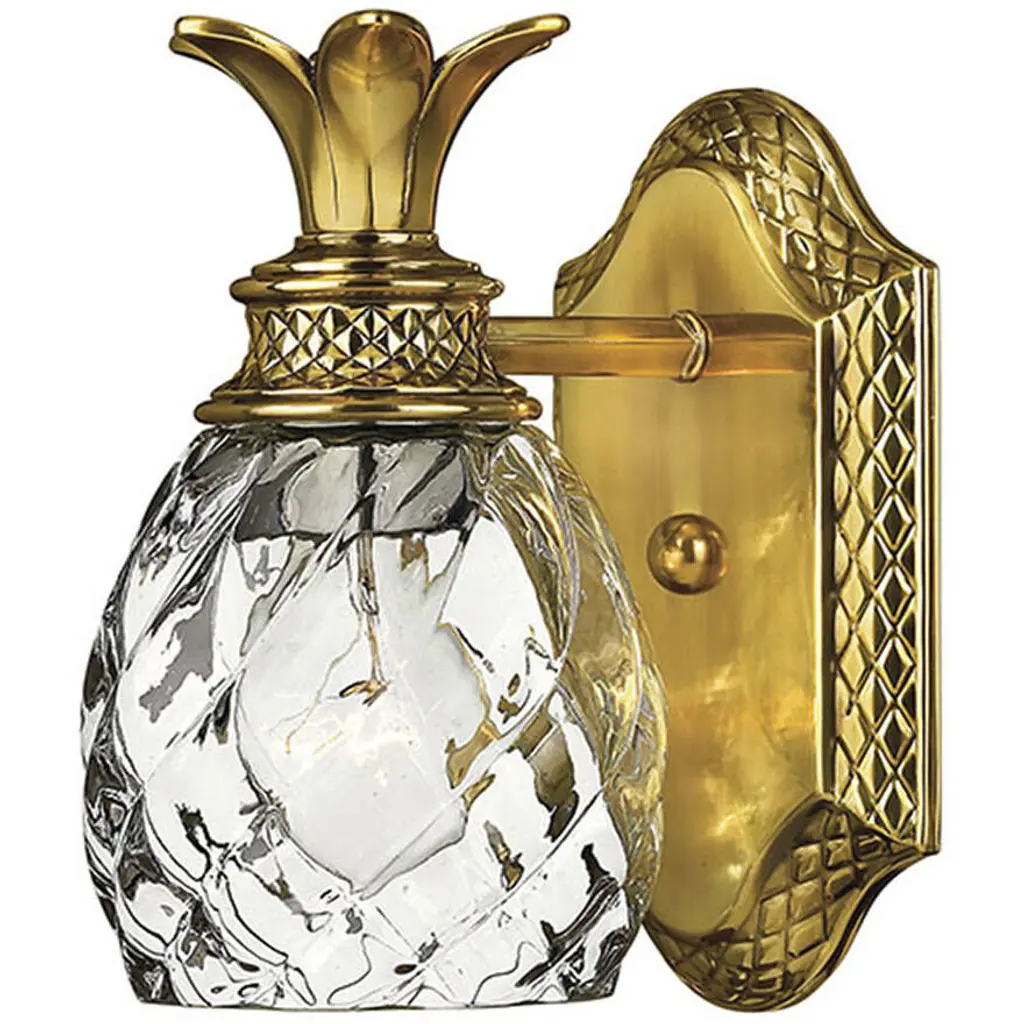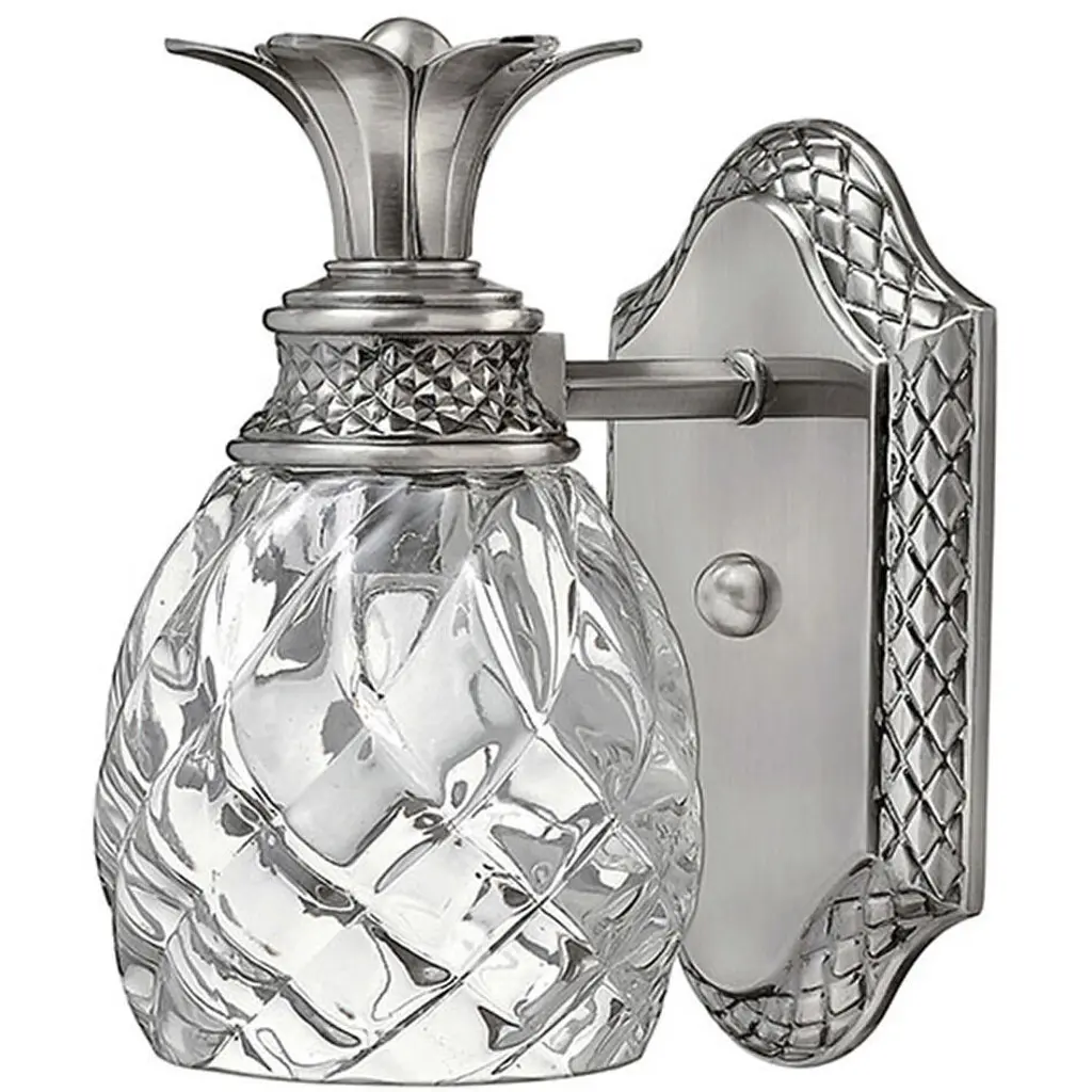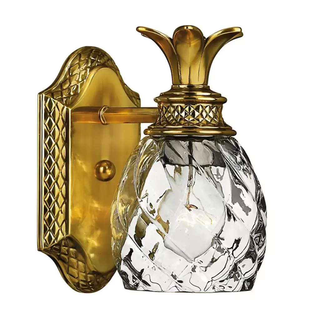 The Hinkley Lighting Plantation Bath Wall Sconce distinctively tropical, delightfully transitional. This Hinkley sconce includes a handblown clear optic glass shade with metal foliage accents and stamped detailing on the wall plate. This pineapple-shaped downlight is an eye-catching sconce that will enhance a variety of unique spaces, including bedrooms, foyers, dens and kitchens. Pairs beautifully with the Hinkley Plantation pineapple pendants and chandeliers.