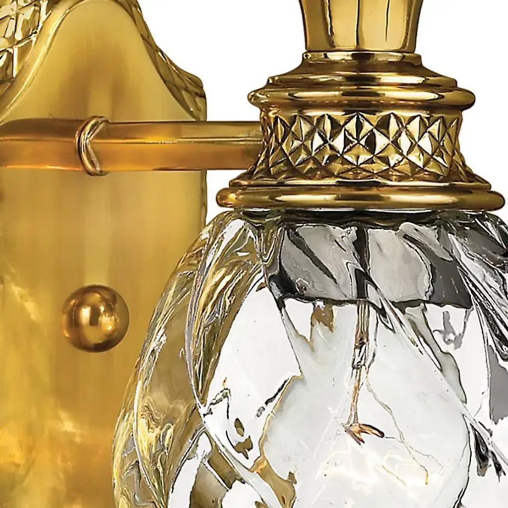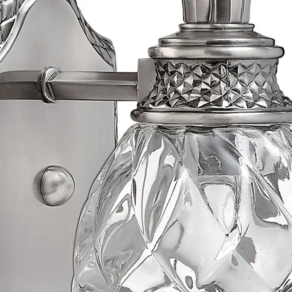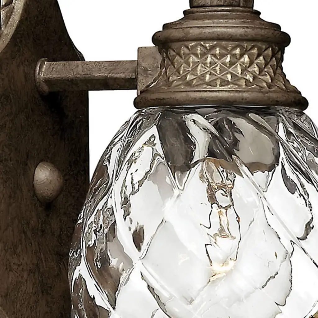 The Hinkley Lighting Plantation Bath Wall Sconce distinctively tropical, delightfully transitional. This Hinkley sconce includes a handblown clear optic glass shade with metal foliage accents and stamped detailing on the wall plate. This pineapple-shaped downlight is an eye-catching sconce that will enhance a variety of unique spaces, including bedrooms, foyers, dens and kitchens. Pairs beautifully with the Hinkley Plantation pineapple pendants and chandeliers.