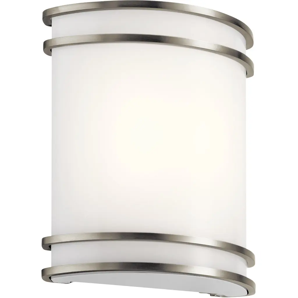 A versatile lighting design for spaces transitional or contemporary. The Plaza Wall Sconce by AFX Lighting features a curved Glass shade within a Steel frame. The frame is both protective and decorative with the strategic metal bands across the front. This wall sconce is wide—allowing for a broad wash of ambient light—but shallow, which allows it to fit into narrower spaces as needed. That makes it a great choice for hallways or small bathrooms.
