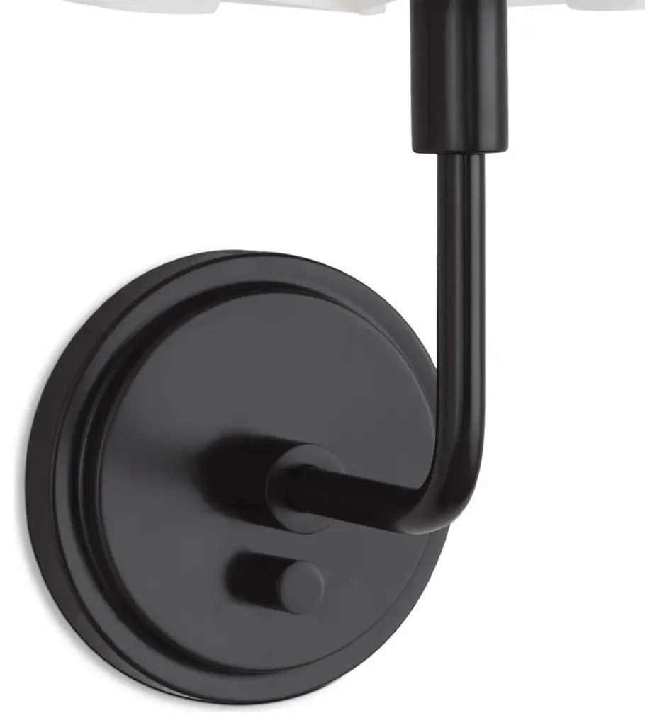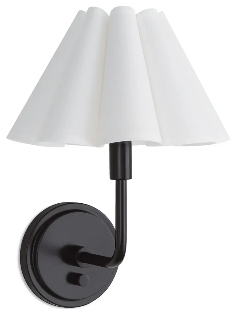 The Polly Wall Sconce brings an air of refined elegance with its single white scalloped shade, casting a warm and comforting glow on any wall and brightening the space with its crisp, clean hue. The gently curved arm adds a touch of classic sophistication, blending seamlessly with both modern and traditional styles to enhance any space with grace and style. Regina Andrew Polly Sconce Single (Blackened Brass with White Scalloped Shade); Dimensions 9.75W x 13.75H x 10.25D; Uses one maximum 60 Watt E12 Base Bulb (Not Included); Dry; Hard Wire; ETL/CETL
