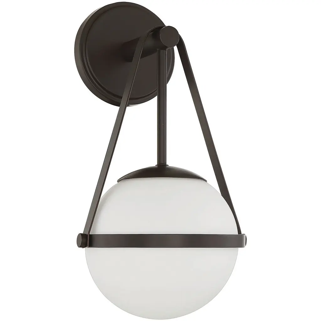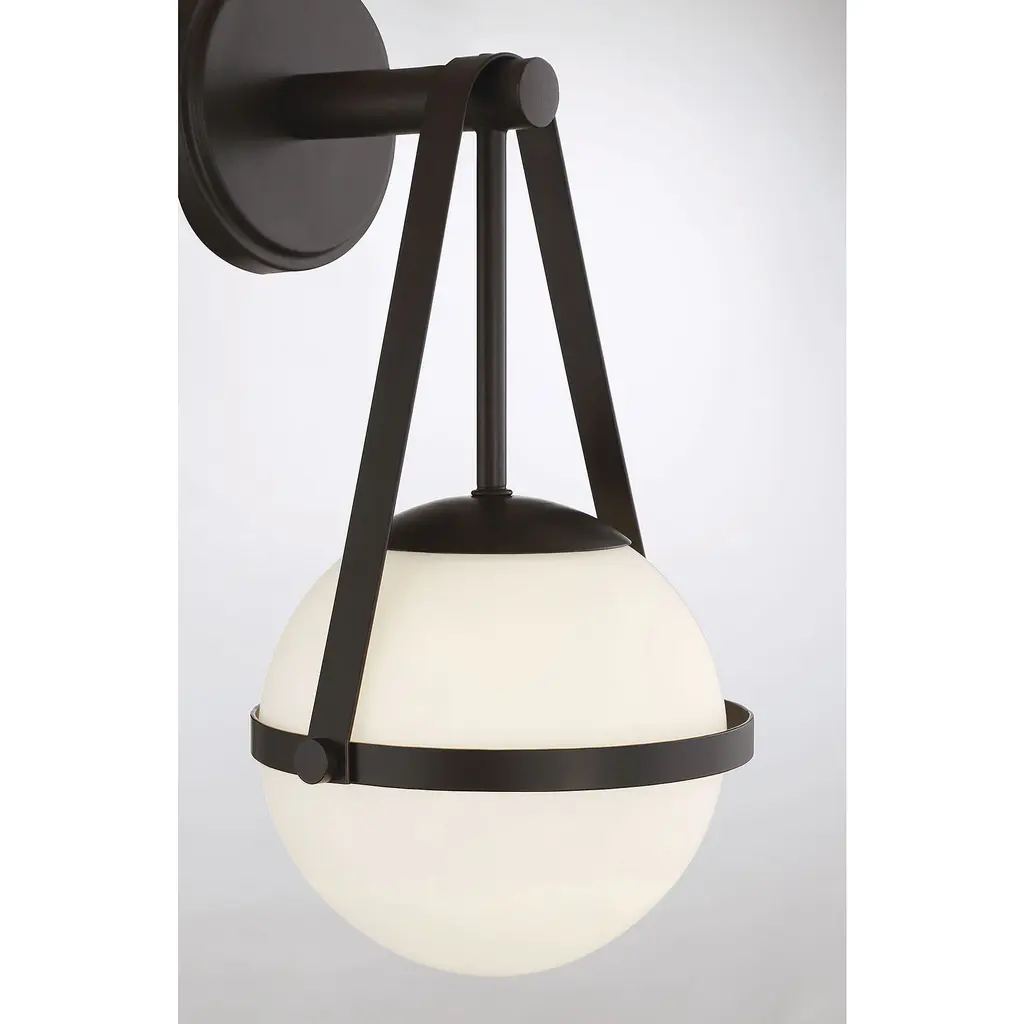 This Savoy House Polson 1-light wall sconce showcases a chic take on midcentury modern style inspiration. Its opal etched glass orb is held in place by a slender rod as well as a central band and metal strap around the arm. Finished in matte black. Polson is 15.5" in height, 8" in width and extends 8" from the wall. It uses one standard size bulb of up to 60 watts. Damp area rated.