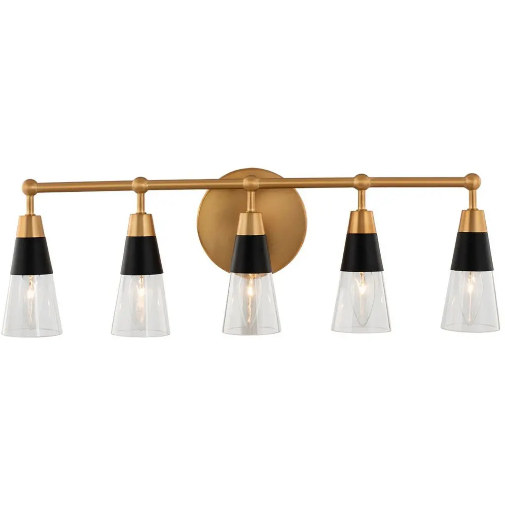 Introducing the Ponti 5 Light ADA Bath fixture, a masterpiece of Mid-Century Modern design that offers both style and substance for your home. This exquisite light fixture, crafted from high-quality steel and glass, is finished in an alluring matte black with new brass accents, providing a fresh twist on a classic look. The fixture is equipped with five E12 candelabra bulbs, each capable of a powerful 40W output. These bulbs are complemented by cone-shaped glass diffusers, distributing light evenly and delicately throughout the room. The Ponti Bath Light isn"™t just about aesthetics; it''s a highly functional piece designed for safety and performance in damp conditions, bearing a cETL certification. Its design is thoughtful and space-efficient, measuring 8 inches in height and 24 inches in width, with a 6-inch backplate for secure mounting. The Ponti Bath Fixture is ideal for both modern and traditional interiors, bringing a touch of elegance and a warm glow to your personal sanctuary. - Dimensions: 8H 24W 4D; Backplate: 6H 6W 1L - Condition: New and Damp Rated, cETL-Listed - Color: Matte Black and New Brass - Material: Steel with Glass Diffusers - Mid-Century Modern Design, Cone Shape - Bulb Base Type: E12 Candelabra - Bulb Quantity: 5; Bulb Wattage: 40W - Suitable for indoor use