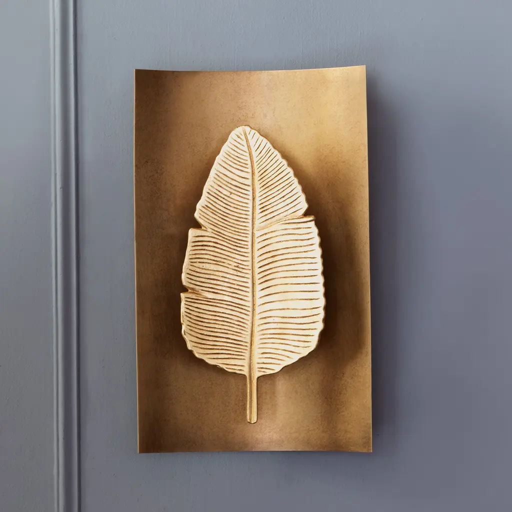 Biscayne is our sculptural and modern tropical inspired banana leaf wall sconce. Made from cast iron, the leaf is hand finished in gold leaf. The reflective curved back plate is made from steel; finished in contrast aged brass. Sconce is mounted on a aged brass wall box. Cast iron banana leaf measures: 14.5"H x 7"W. 2