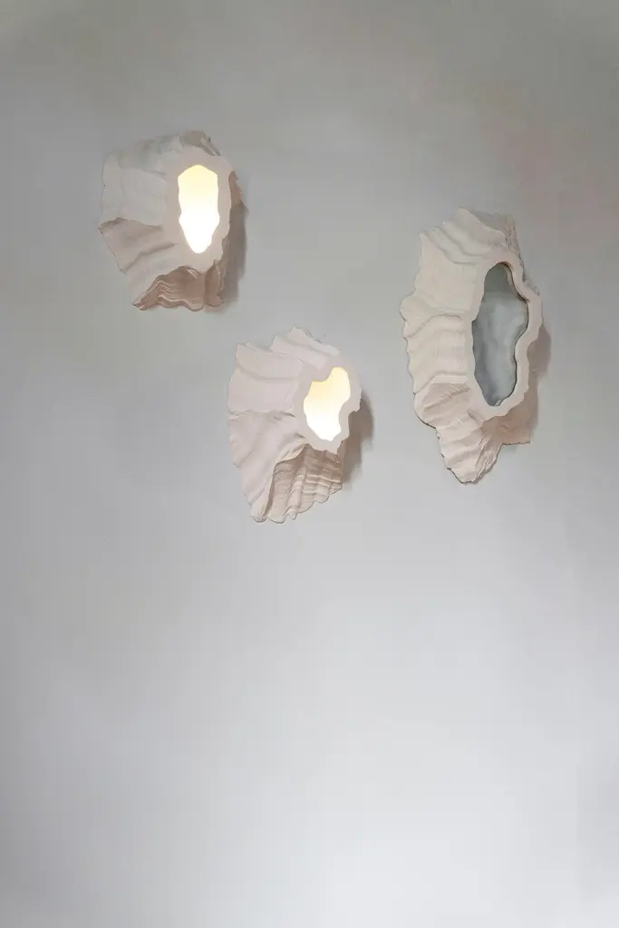 The Portals are a collection of wall mounted ceramic pieces, either illuminated or reflective. The irregular and highly textured objects evoke bleached coral, lava scars or even barnacles. The collection includes the four first versions of an ongoing series. Either emitting a warm and gradient glow, or reflecting the external, the works are both sculptural and ghostlike. Portals can be combined into sets that resemble groupings of family portraits, alone as curiosities, or used as you would any kind of sconce.MATERIALS & CONSTRUCTIONWhite Stoneware, Electric Parts and Polycarbonate