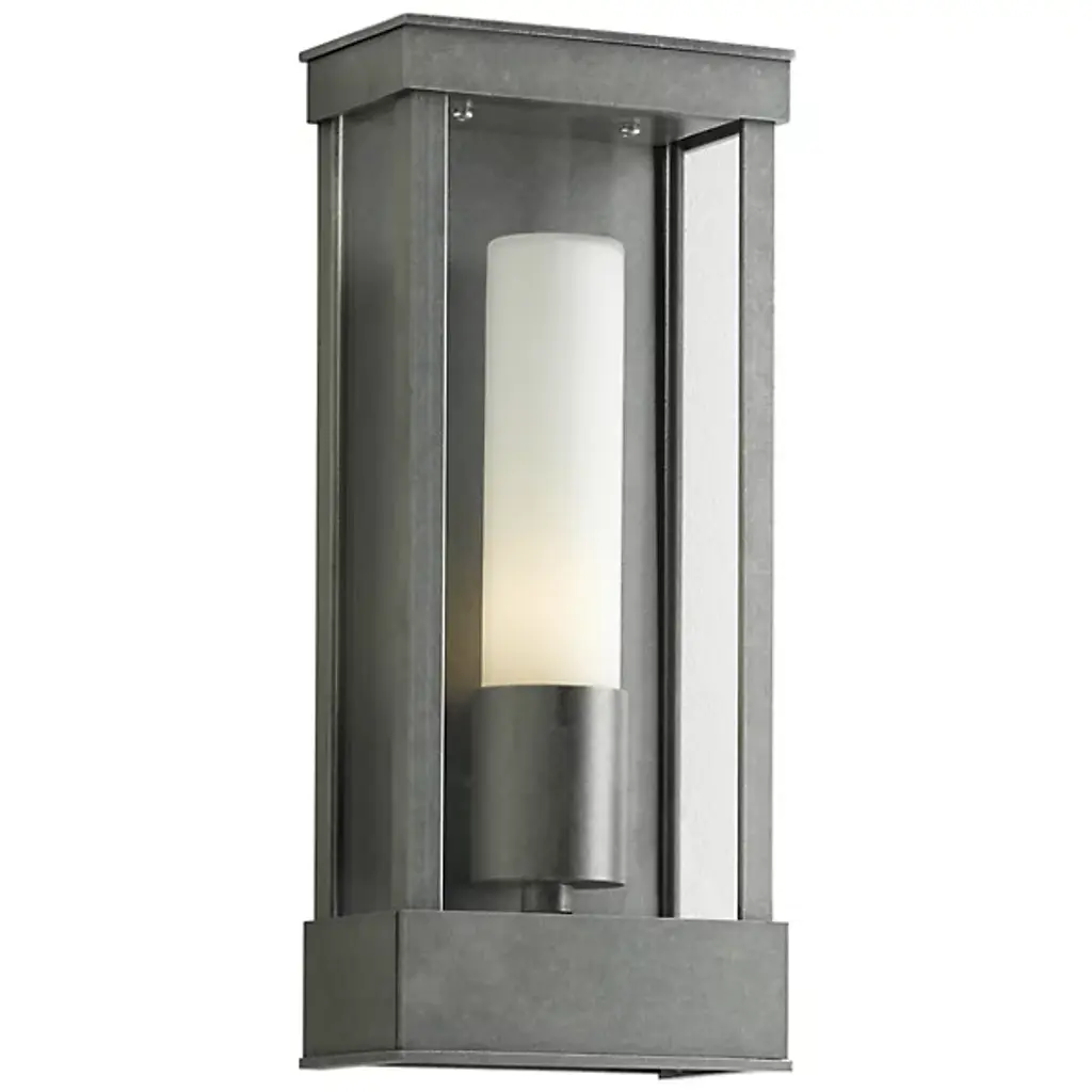A minimalist take on a classic style. The Portico Outdoor Wall Sconce by Hubbardton Forge is the perfect blend of traditional form and modern function. The cylindrical glass diffuser inside a rectangular metal and glass casing resembles a simple candle holder to induce timeless glam. Handcrafted from durable aluminum for corrosion resistance, it is coated with Coastal Outdoor finish to endure high-humid outdoor conditions. Grace your entryways, garden, patio, or backyard with a warm mood by installing this luminaire.
