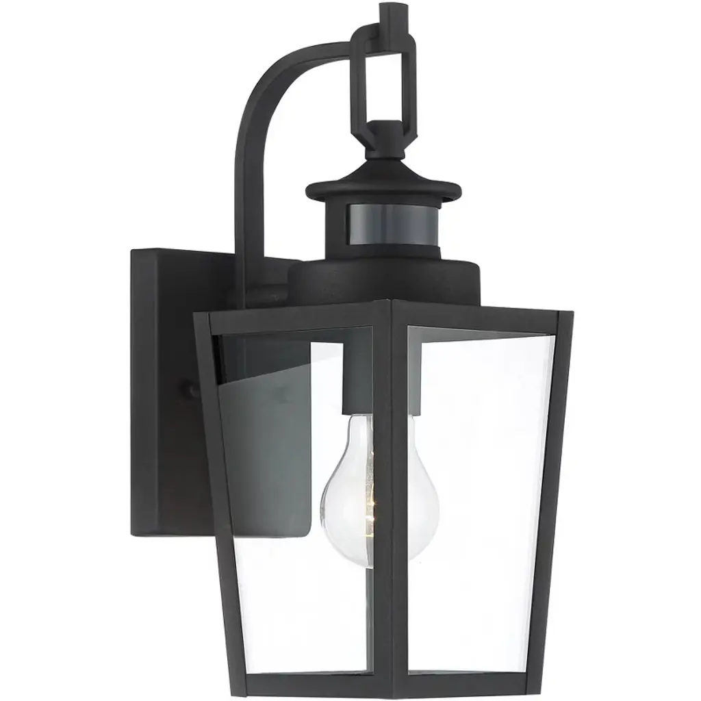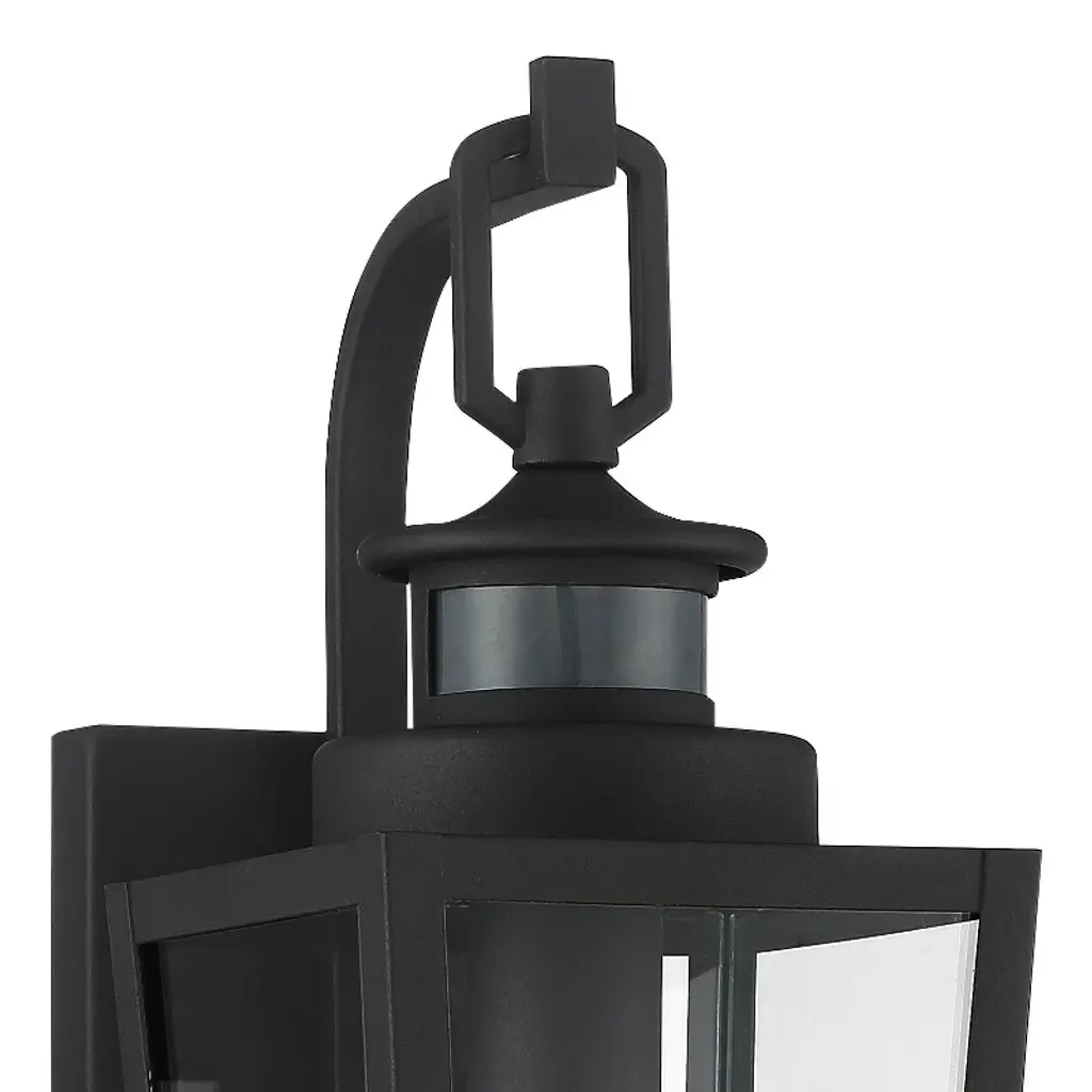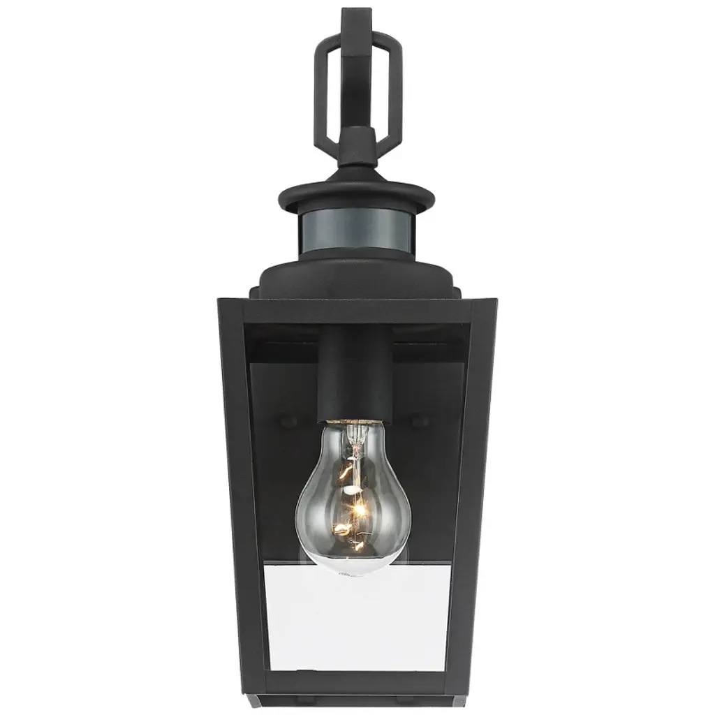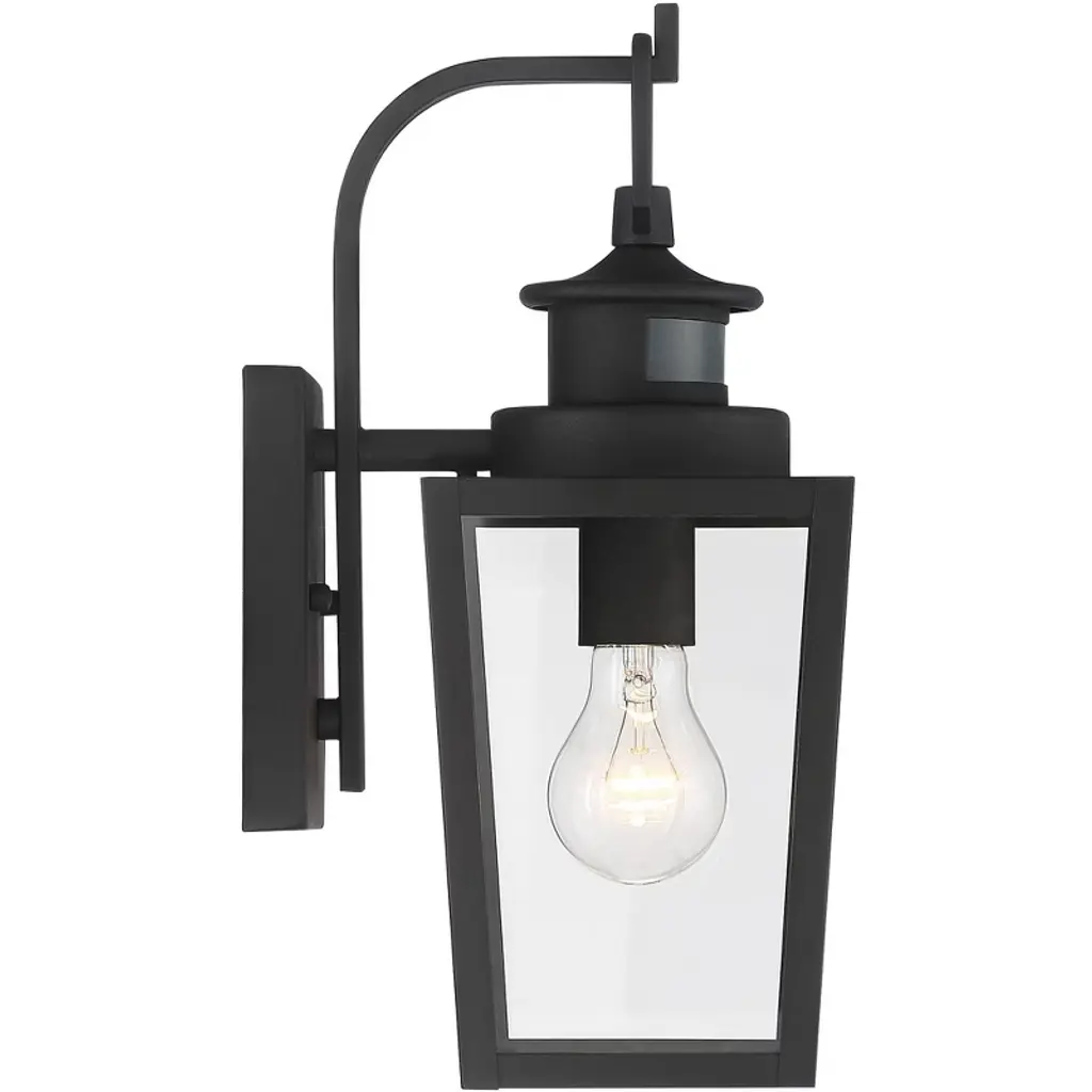 A tapered rectangular framework lends itself to modernist appeal with this intriguing modern outdoor wall light. A black finish and clear glass create a simplified and refined look. The motion sensor feature adds security and functionality to an already stunning design. Dual-Bright design means the light turns on at 25% brightness and goes to 100% when motion is detected. Two minutes after motion is no longer detected, the light will revert to low-level brightness.