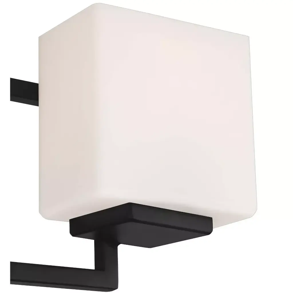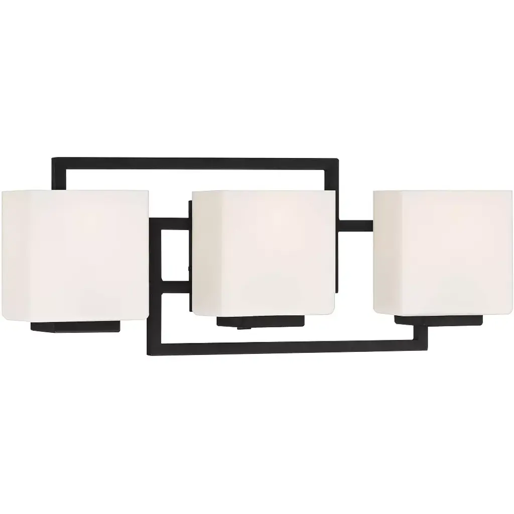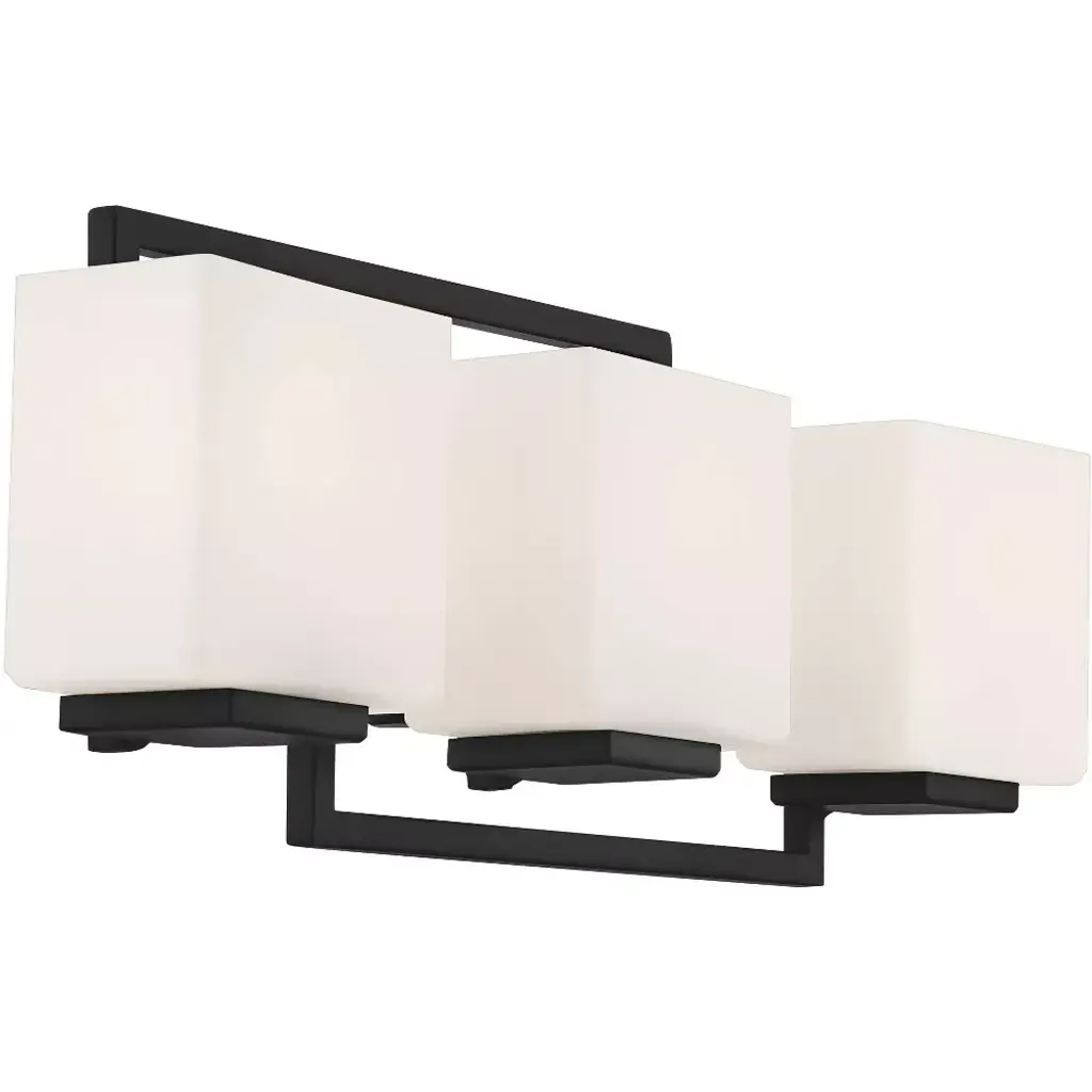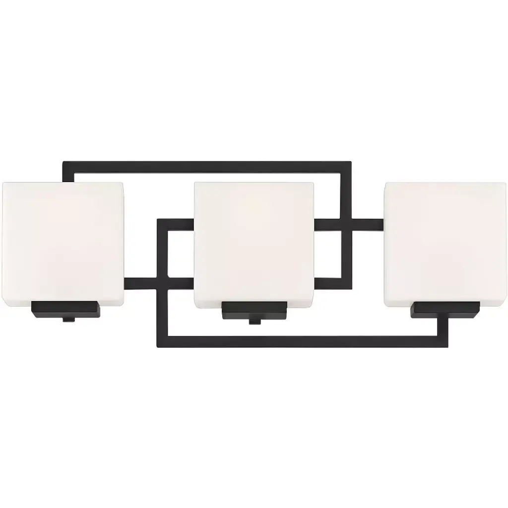 This three-light bathroom wall light features sleek lines for a contemporary appeal. The rectangular shades of opal glass are positioned to complement the geometric, black finish form of this design. A great modern update for your stylish bath. This is an ADA-compliant bath light.
