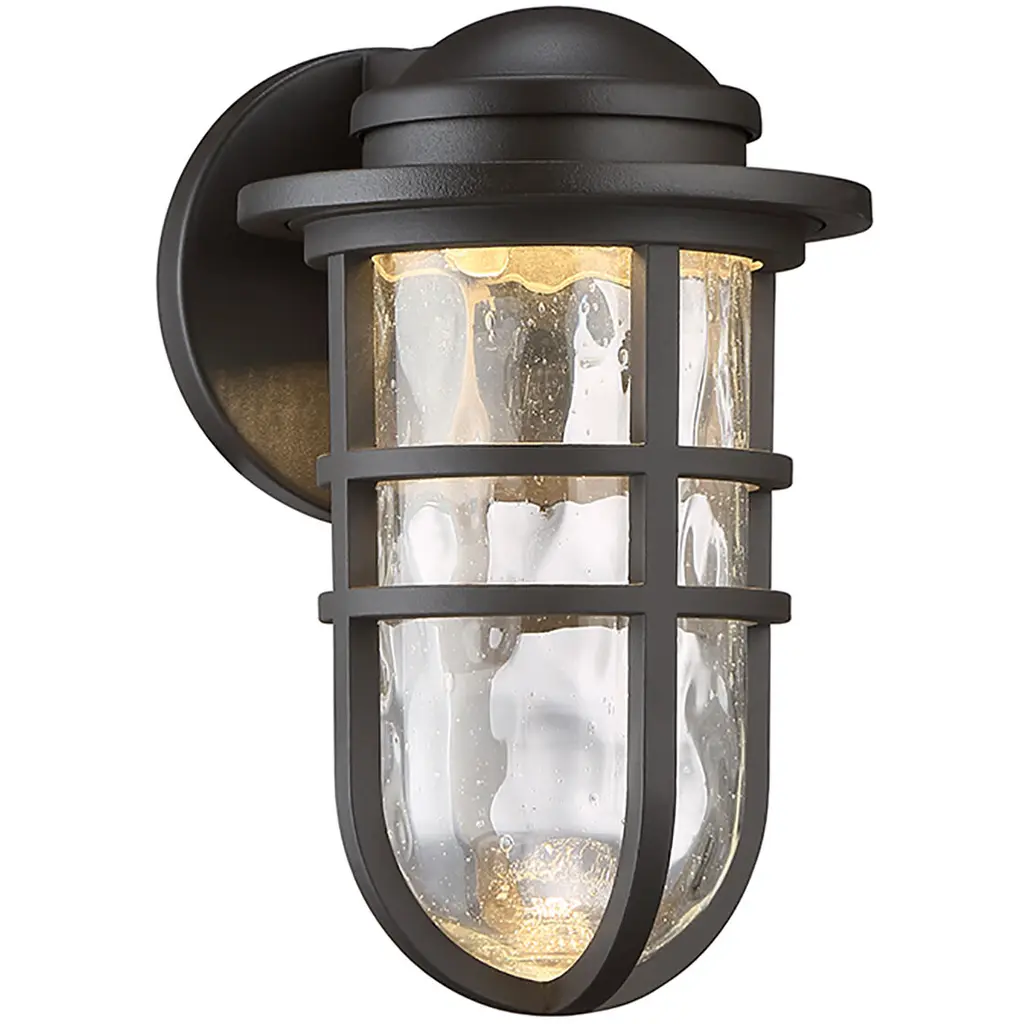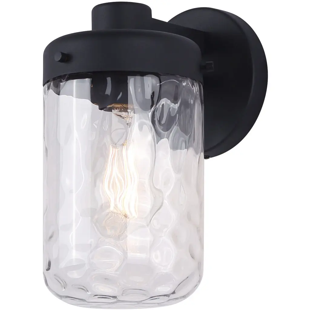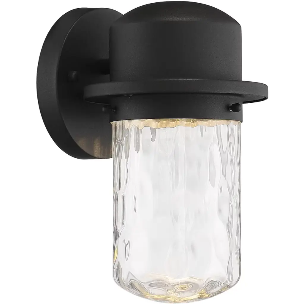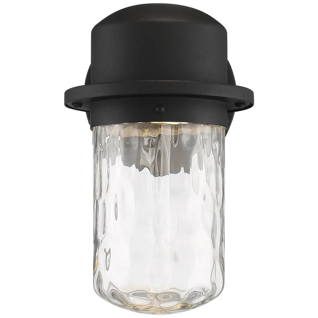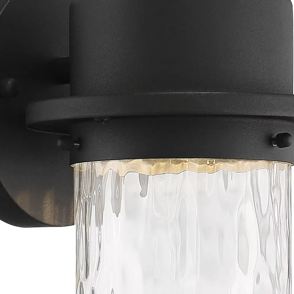 This energy-efficient LED outdoor wall light from Possini Euro Design® adds dazzling illumination while saving on energy costs. The simple rounded cylinder silhouette makes it a perfect fit for a variety of spaces, such as garages or porches. The clear hammered glass and textured black finish complement each other and provide a touch of modernism to the look.