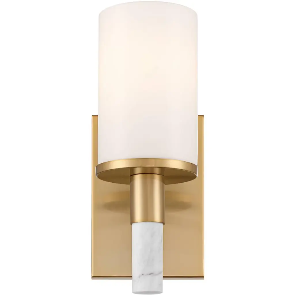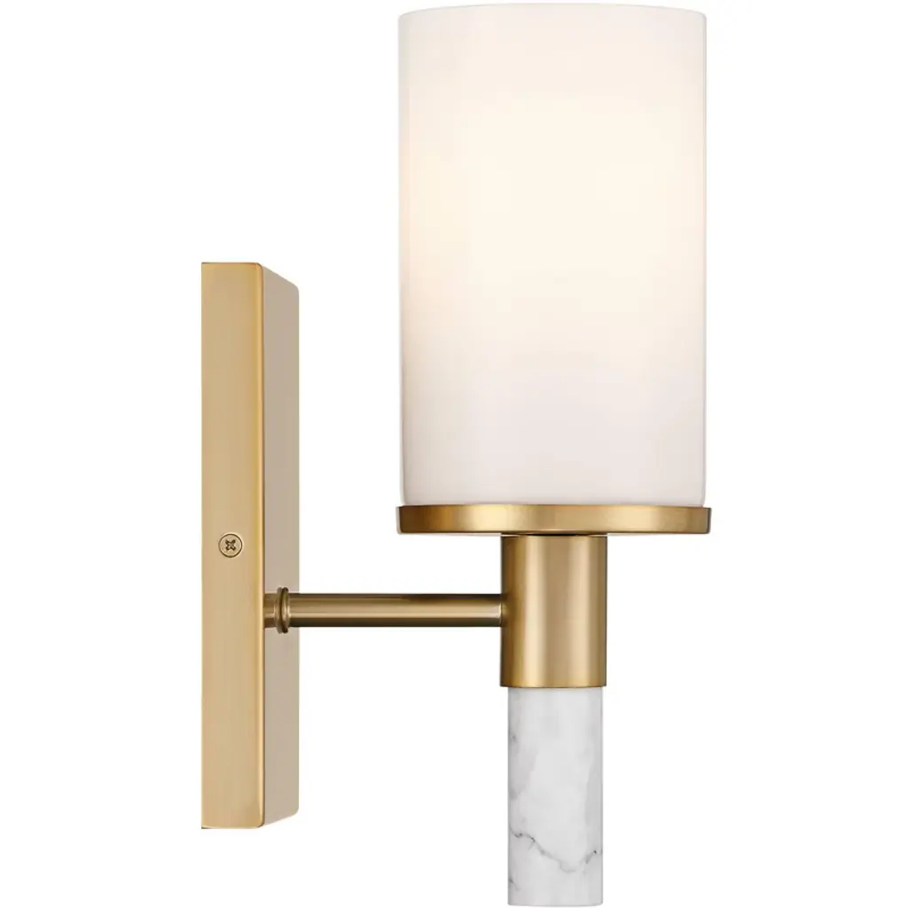 With easy style and glamorous appeal, the Lucius wall sconce from the Possini Euro Design® brand arrives with aplomb. A white glass shade perches gracefully, surrounding the three bulb. The overall look and feel is enhanced by the soft gold finish. A white marble accent hangs from the stem, completing the glam - luxe elegance.