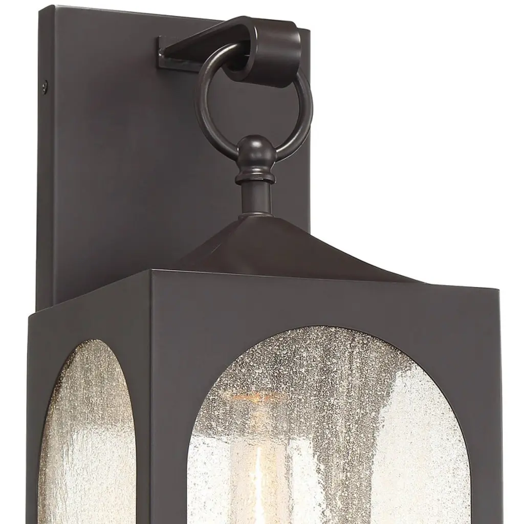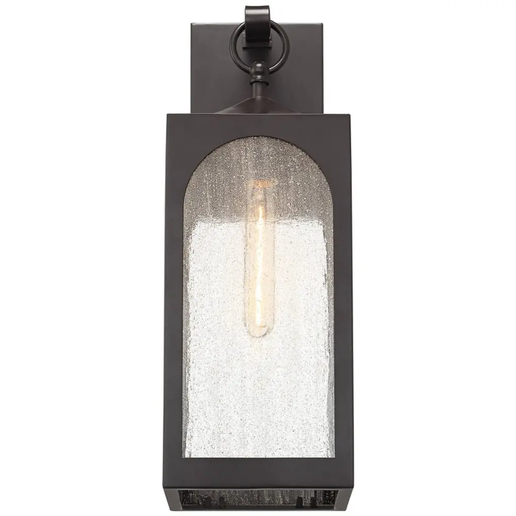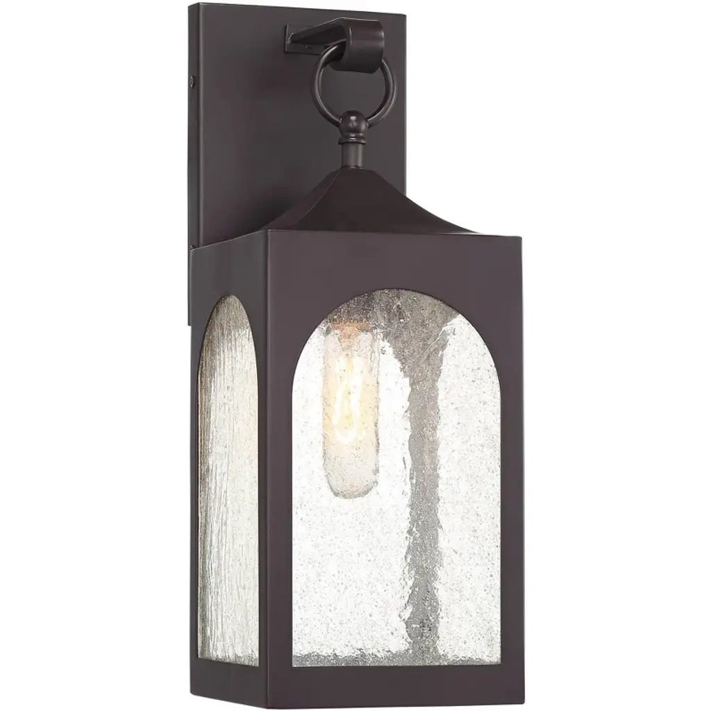 A geometric shape with gentle curves creates the silhouette of this charming outdoor wall light. A bronze finish and seedy glass create a look that seems weathered, but provides a contemporary feel. The illumination from a single bulb is gently diffused, perfect for flanking the sides of an entryway or enhancing a patio space.
