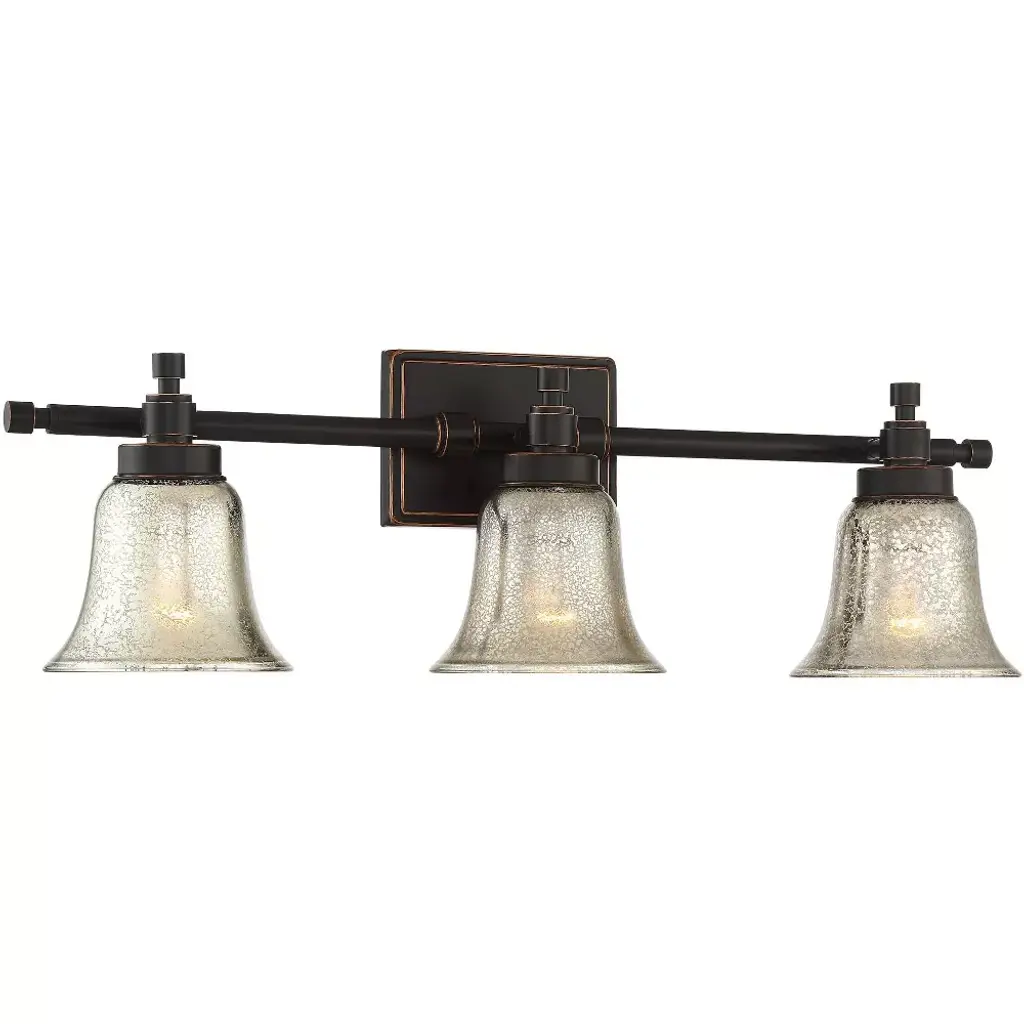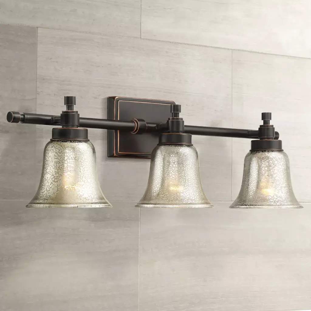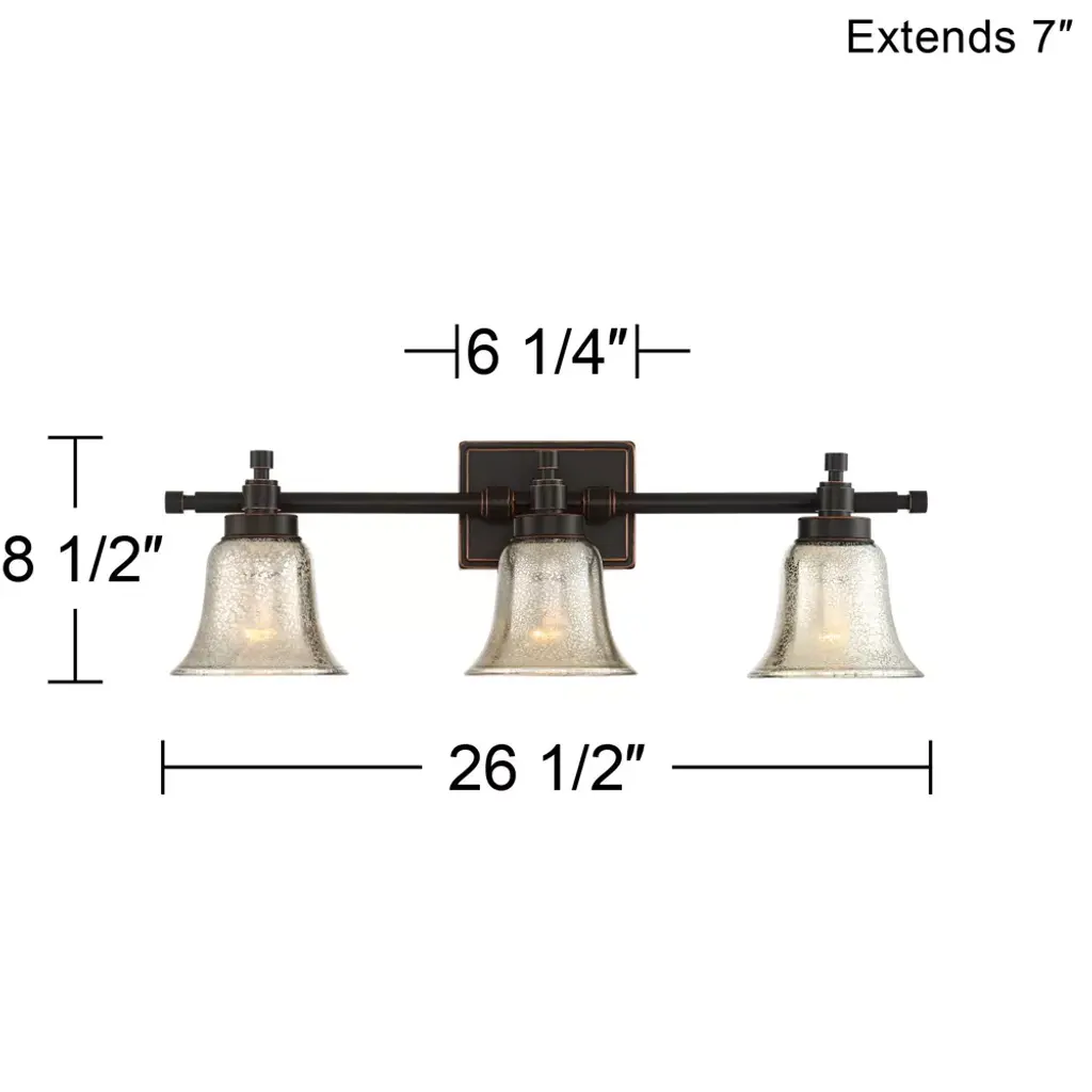 Three beautiful Mercury glass finish bell shades are the centerpiece of this elegant transitional bathroom vanity light. A straight metal rod, decorative connector accents and a rectangular wall plate in a handsome bronze finish complete the design. This fixture can be installed with the lights pointing up or down.