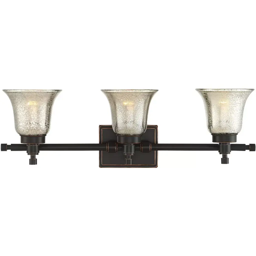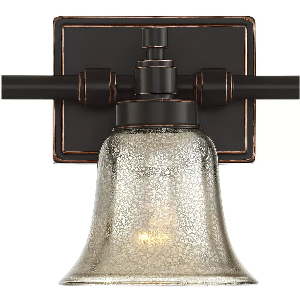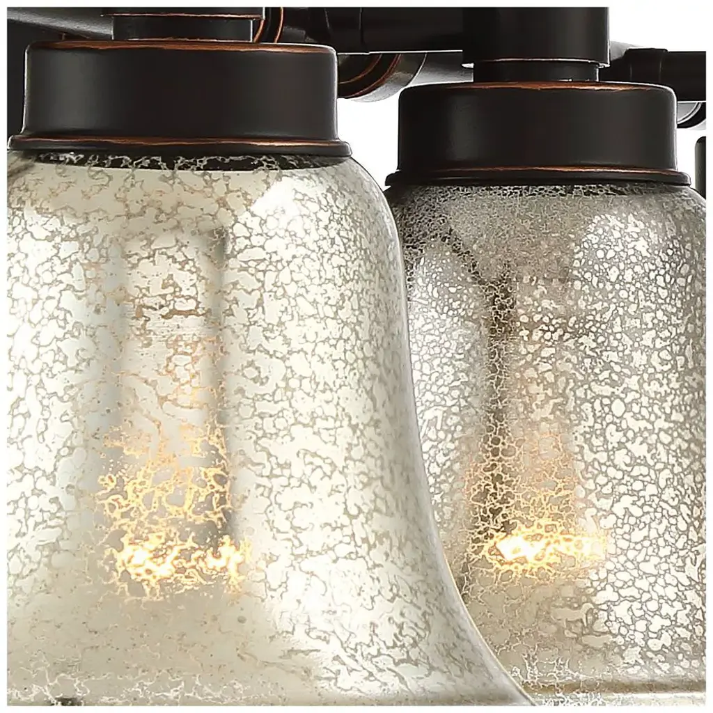 Three beautiful Mercury glass finish bell shades are the centerpiece of this elegant transitional bathroom vanity light. A straight metal rod, decorative connector accents and a rectangular wall plate in a handsome bronze finish complete the design. This fixture can be installed with the lights pointing up or down.