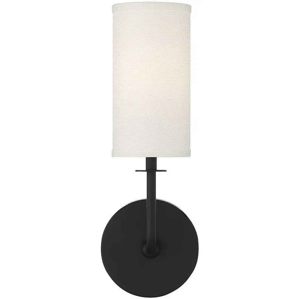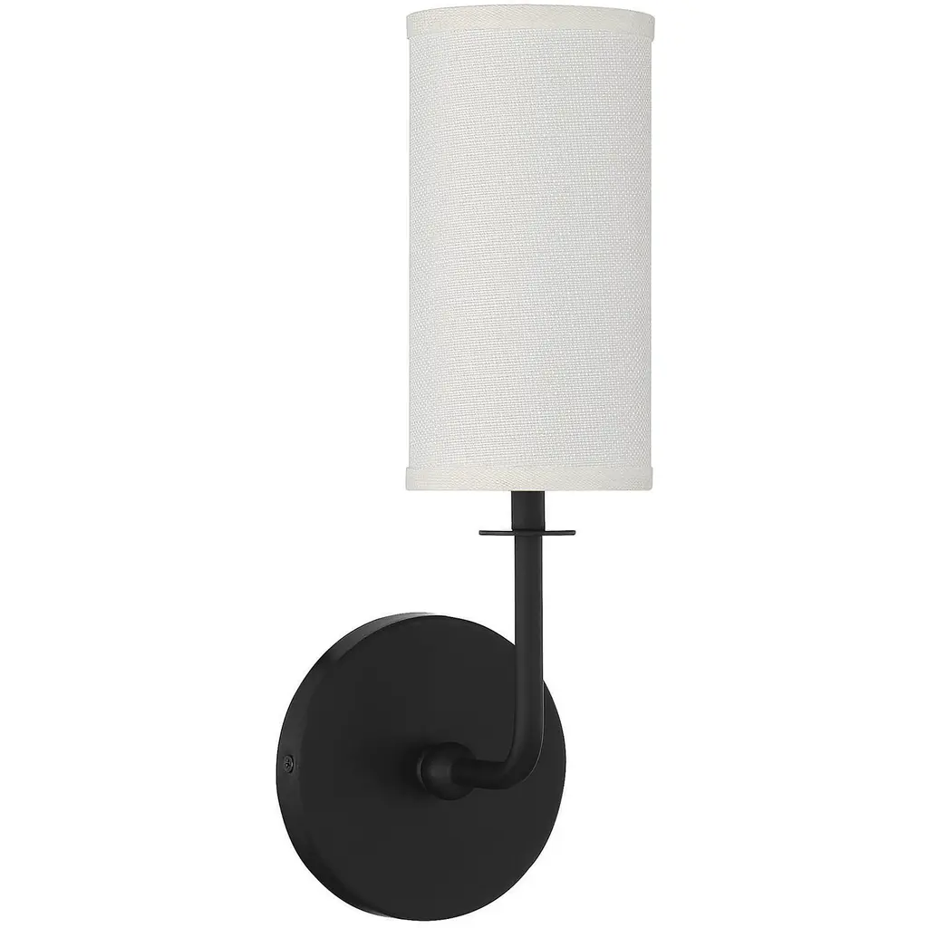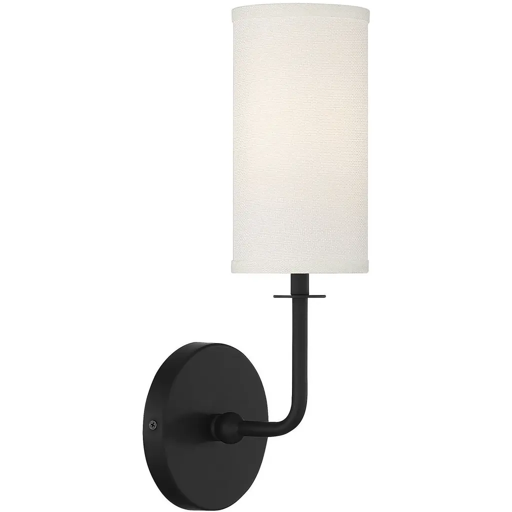 With the Savoy House Powell 1-light sconce, get simply chic lighting that will add a touch of brightness in any room. Use Powell solo or in groupings to meet any accent lighting need throughout the house The tall cylindrical shade of white fabric pairs nicely with the effortlessly curving arm and matte black finish. Powell is 15" in height, 5" in width and extends 5.5" from the wall. It uses one candelabra size bulb of up to 60 watts. Damp area rated.