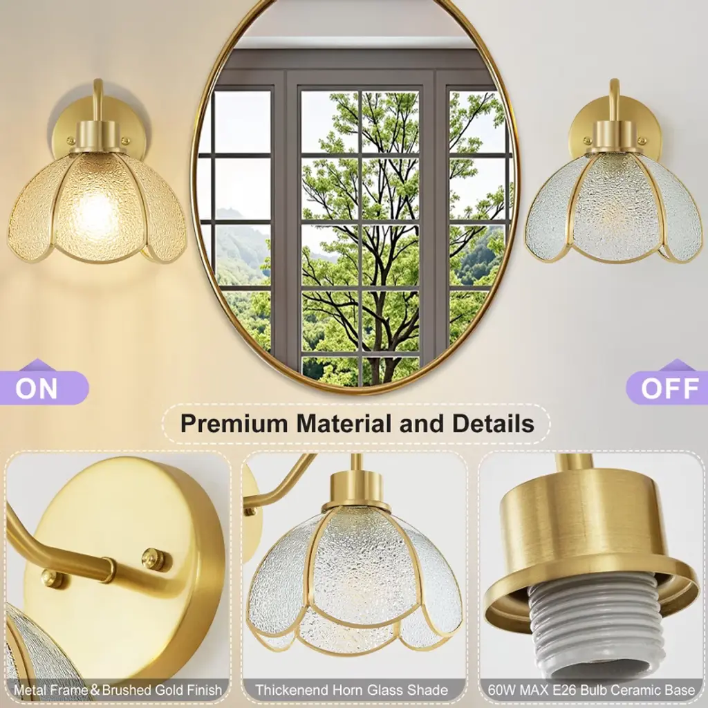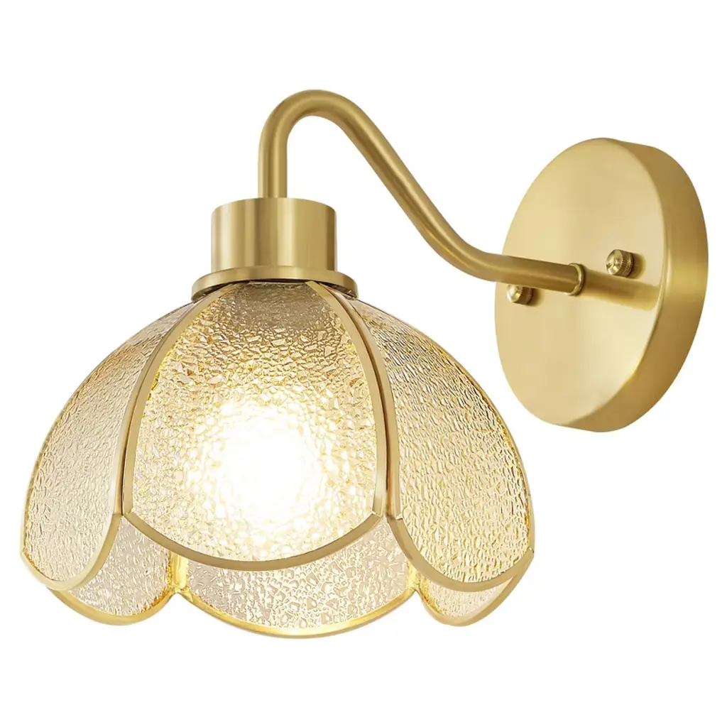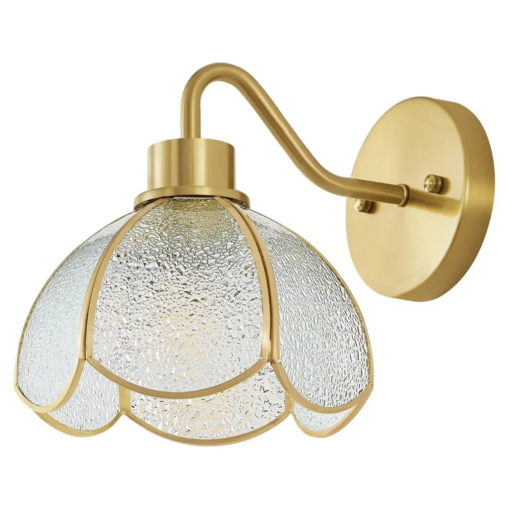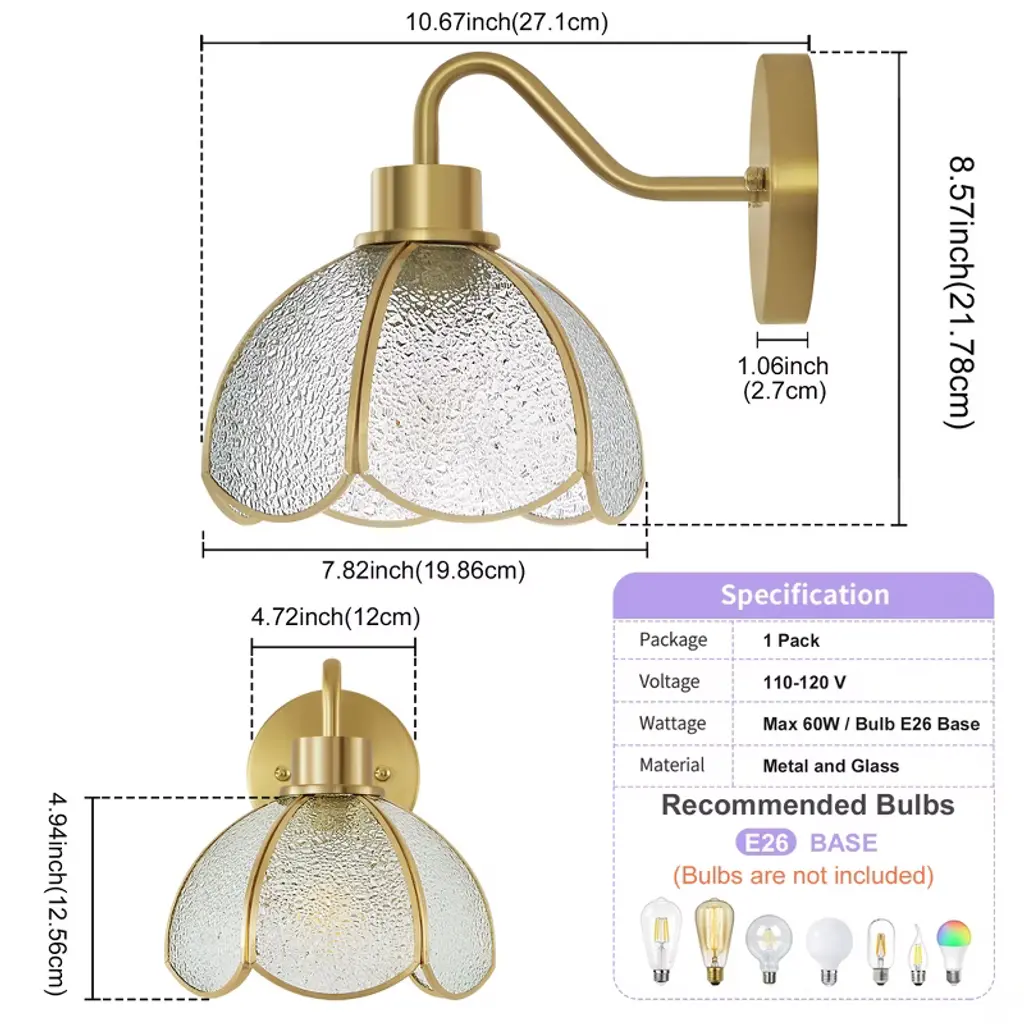 Add timeless charm to your space with this elegantly crafted wall sconce. This vintage floral shape wall sconce is made of high quality metal, which makes it a strong support, as well as moisture-proof and rust-proof, durable and oxidation-resistant, this piece combines durability with delicate beauty. It is paired with a unique thickened raindrop shaped glass shade that creates a unique floral shape. The transparent textured glass shade refracts the purest color of light, perfectly presenting various colors of light, perfect for creating a warm, inviting glow in any room.