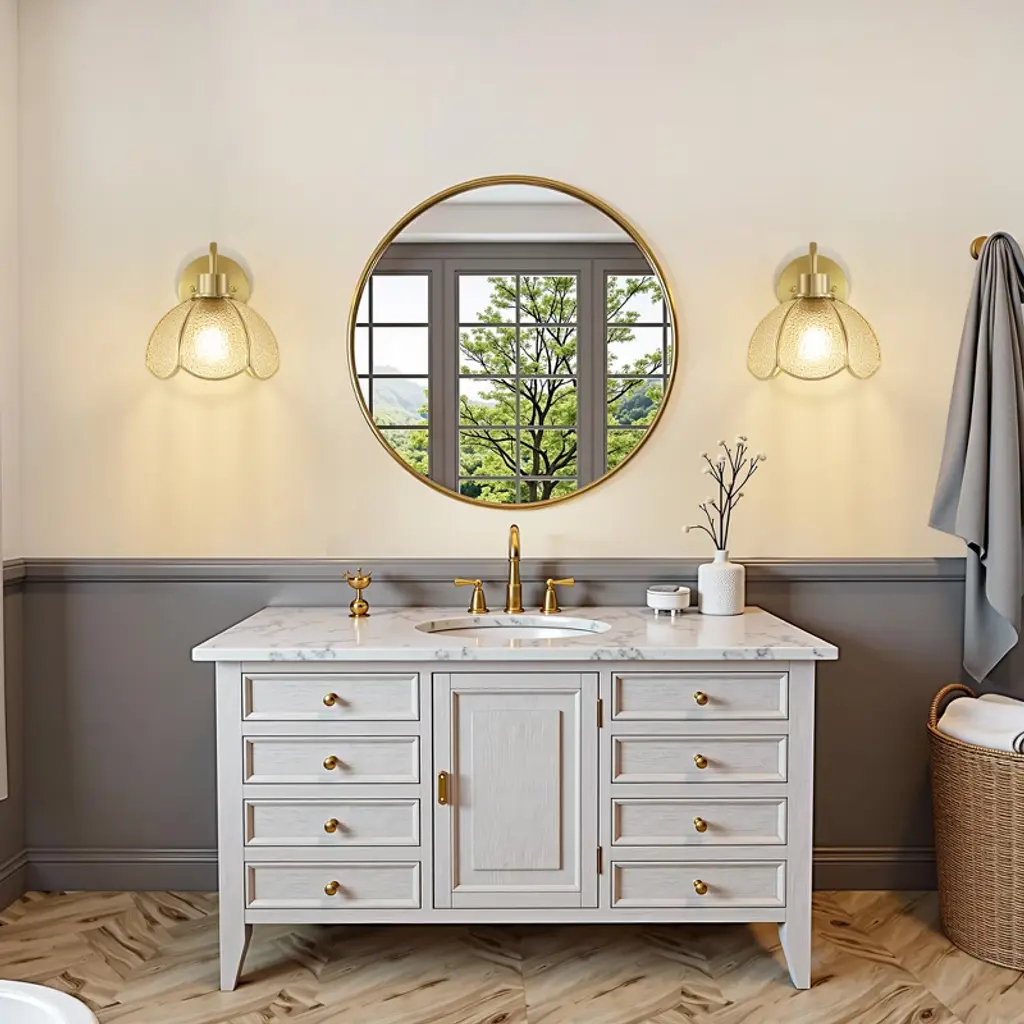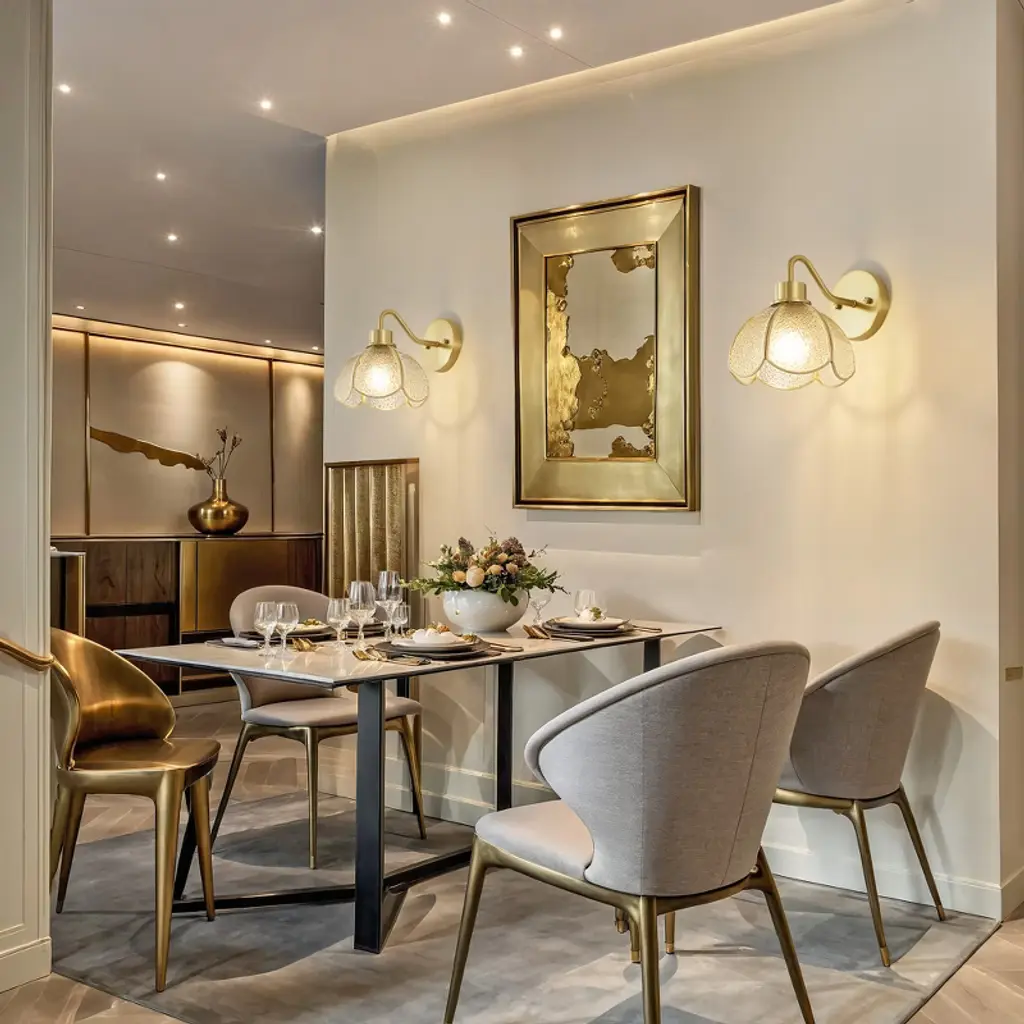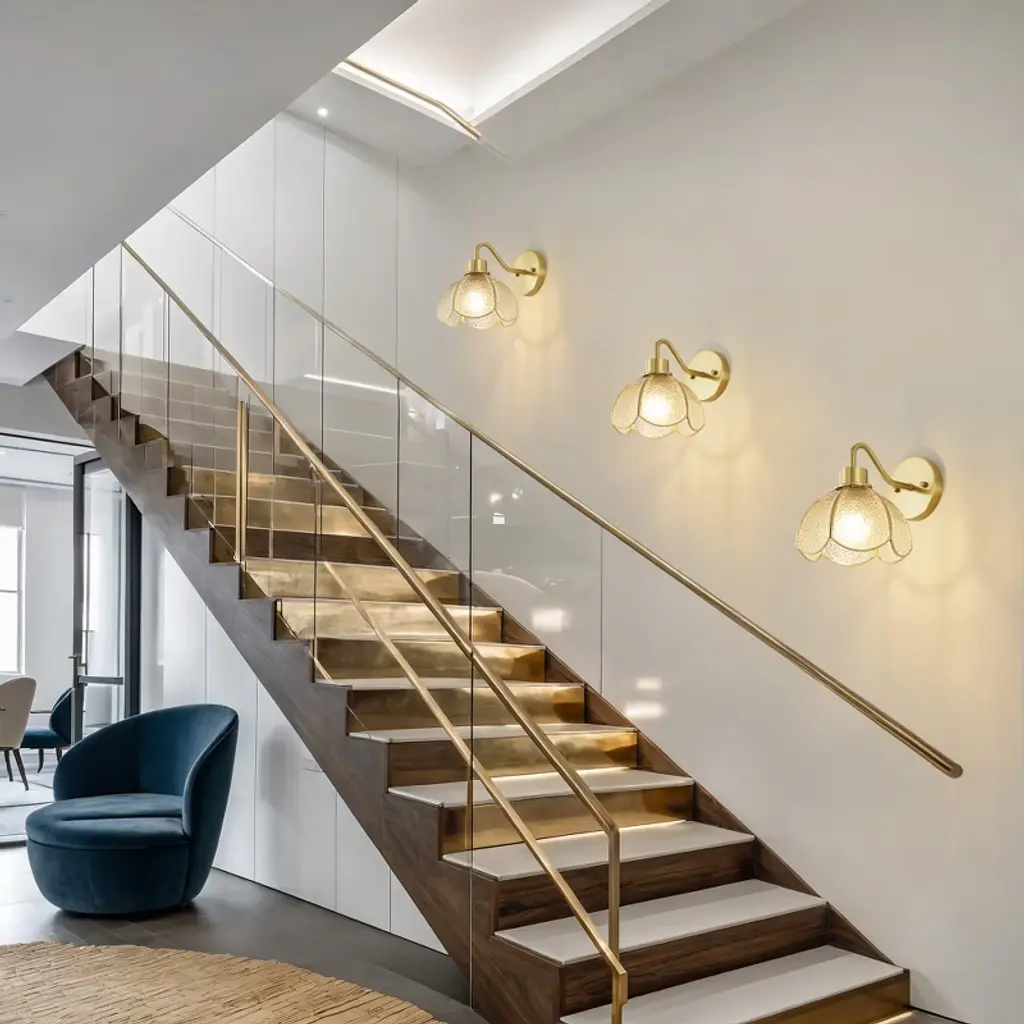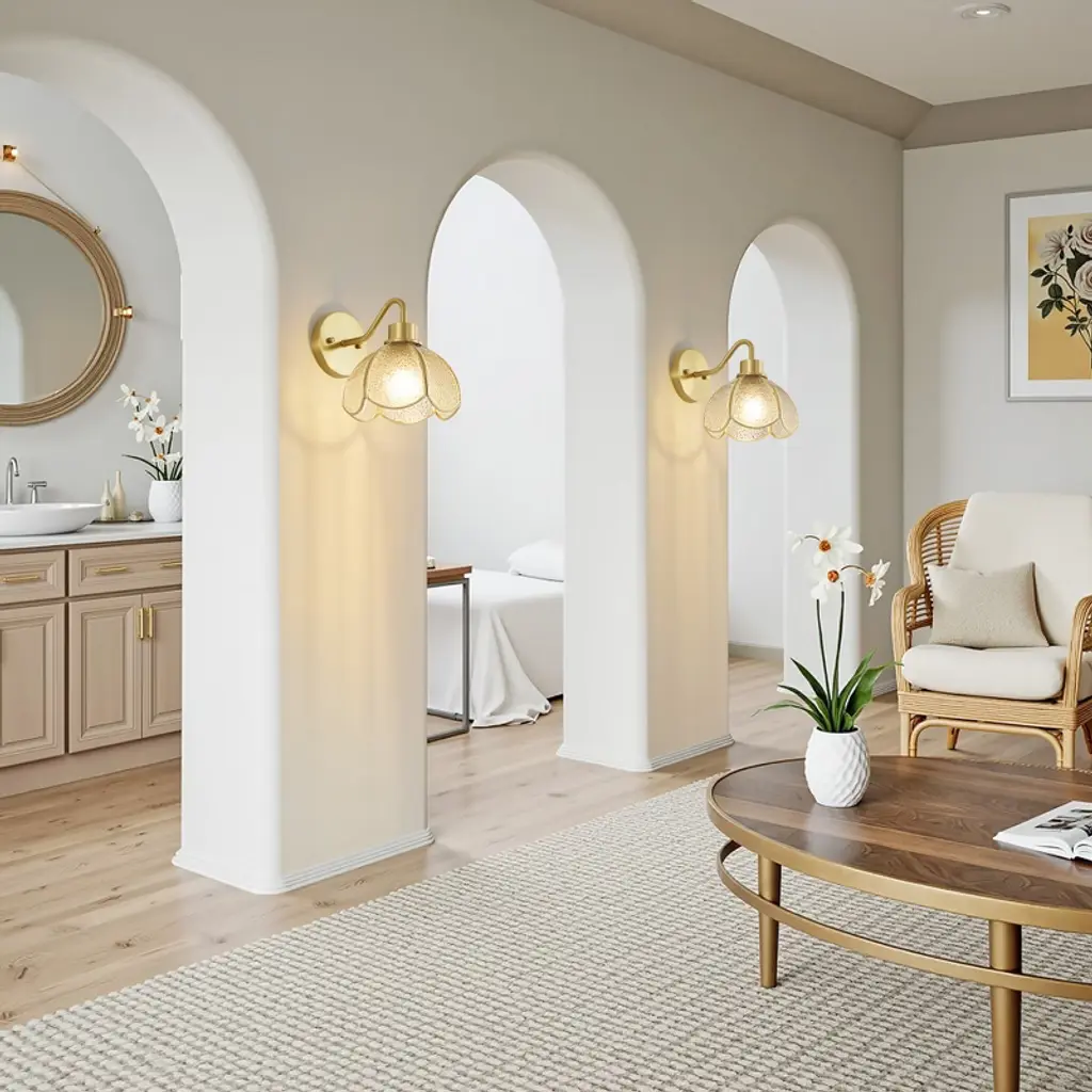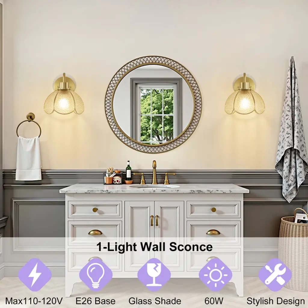 Add timeless charm to your space with this elegantly crafted wall sconce. This vintage floral shape wall sconce is made of high quality metal, which makes it a strong support, as well as moisture-proof and rust-proof, durable and oxidation-resistant, this piece combines durability with delicate beauty. It is paired with a unique thickened raindrop shaped glass shade that creates a unique floral shape. The transparent textured glass shade refracts the purest color of light, perfectly presenting various colors of light, perfect for creating a warm, inviting glow in any room.