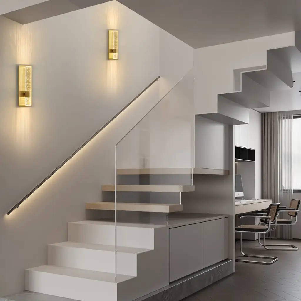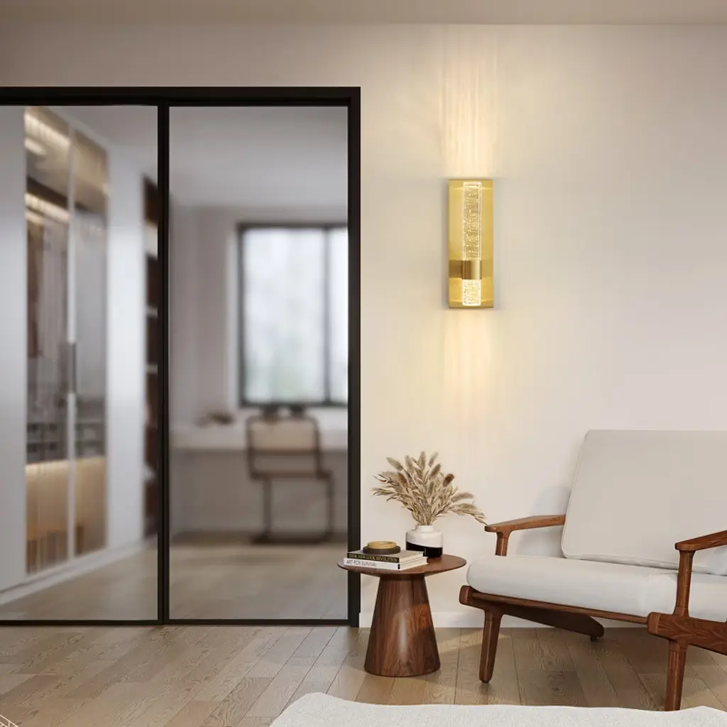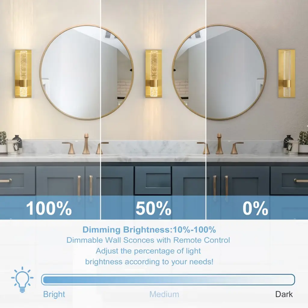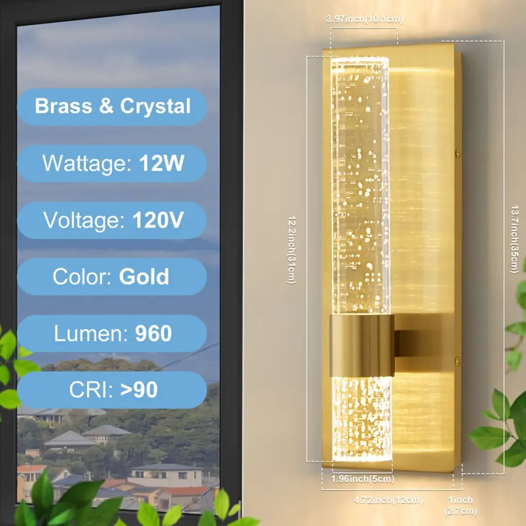 This elegant wall light combines crystal and brass materials to create a luxurious lighting fixture. The hexagonal crystal lamp post embedded with fine bubbles produces beautiful light refraction, while the gold-plated surfaces add a touch of sophistication to any space. Featuring a 12W, 120V LED system with 960 lumens (CRI>90), this sconce delivers bright, warm 3000K lighting that's both energy-efficient and eye-catching. The included remote control allows seamless dimming adjustment from 10% to 100% brightness, suitable for soft lighting in the bathroom, bedroom, or decorative embellishments in the living room, corridor, doorway. With beautiful design and exquisite craftsmanship, this crystal LED wall sconce is a blend of modern, industrial and luxury decorative styles, ideal for lighting up your space and enhancing your taste.