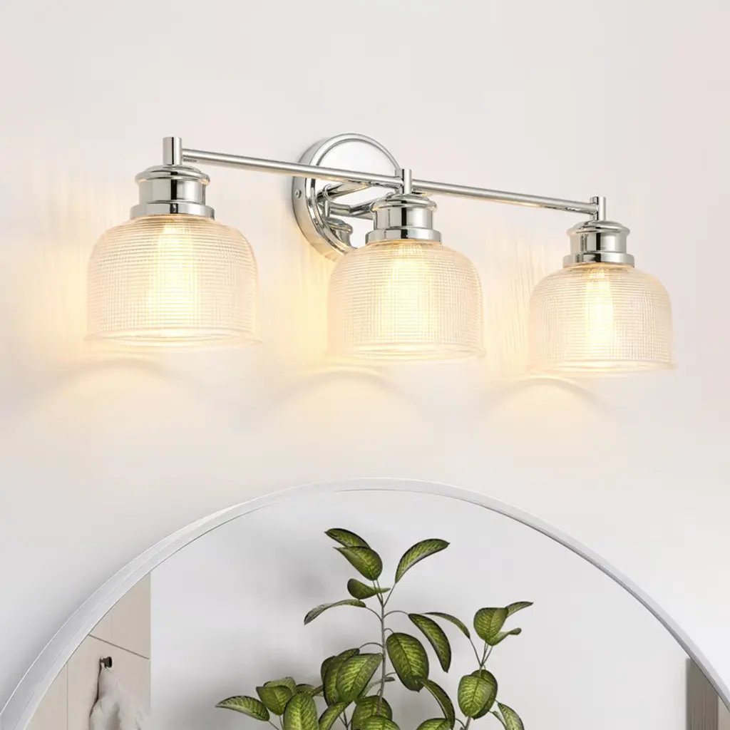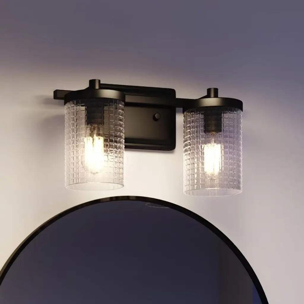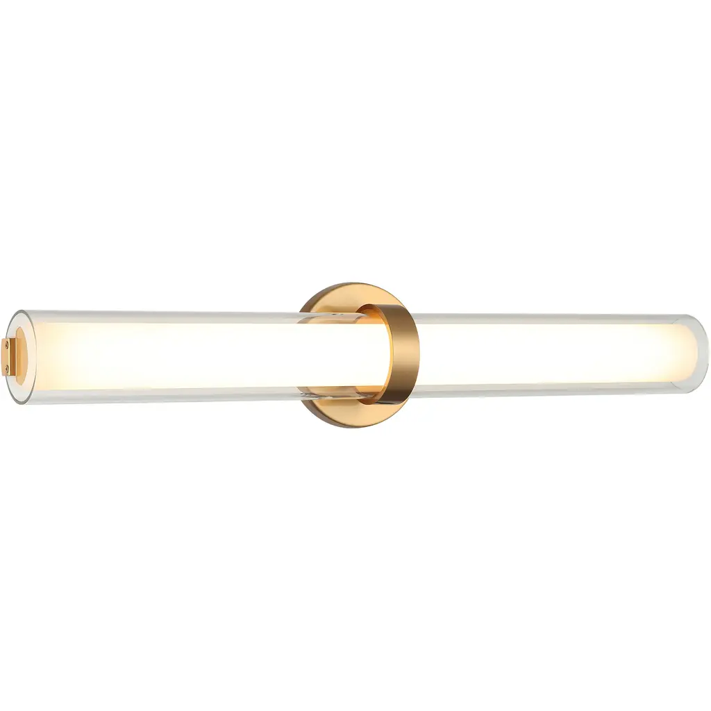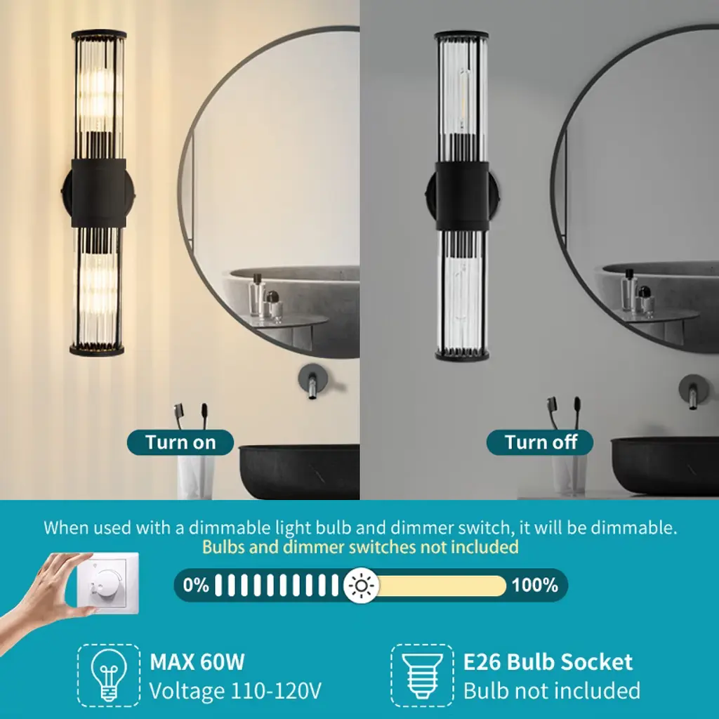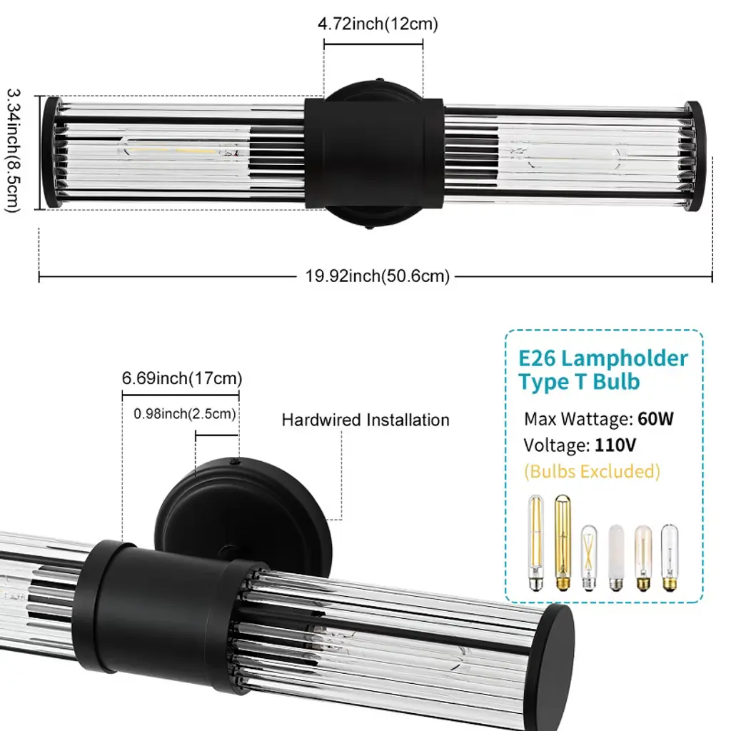 Make a stylish statement with this unique modern wall sconce featuring an eye-catching design. The elegant glass rods surround a composition glass shade, creating beautiful light diffusion with ice-like texture and premium clarity. Its sleek gold finish and sculptural design complement any decor, doubling as decorative wall art even when not illuminated. Perfect for bedrooms, entryways, or bathrooms, this hardwired fixture includes 2 E26 sockets (Type T bulbs, max 60W each, 110V) and is dimmable for adjustable ambiance. Bulbs not included.