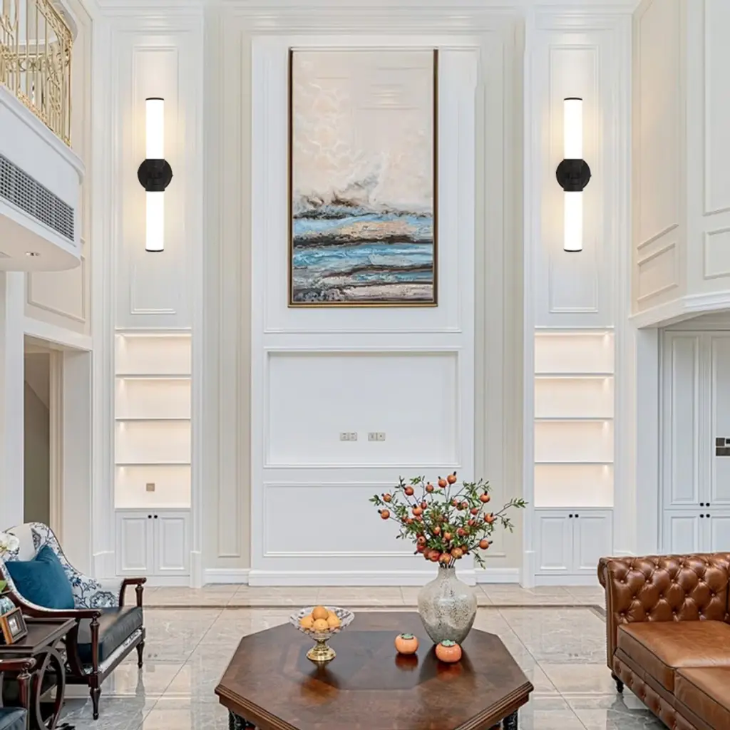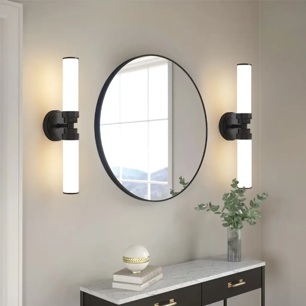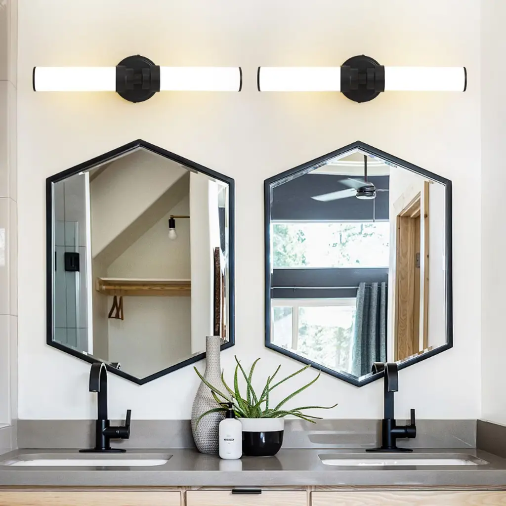 Elevate your space with this elegantly simple wall light, blending industrial charm and modern elegance. The sleek metal frame paired with milky white glass shades creates a versatile design that functions as both ambient lighting and decorative art. Perfect for placement beside mirrors, in bathrooms (vanity/powder rooms), bedrooms, entryways, or hallways. Includes 2 E26 sockets (Type T bulbs, 60W max each, 110V) with heat-resistant safety design. Dimmable for adjustable ambiance. Bulbs not included.