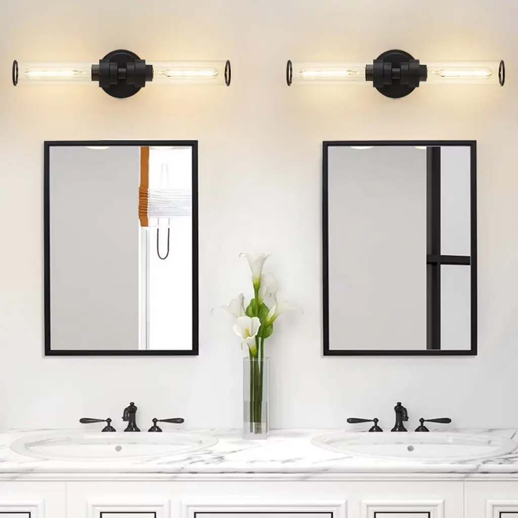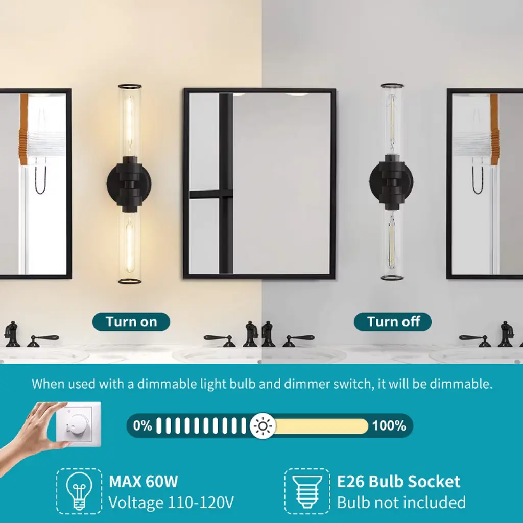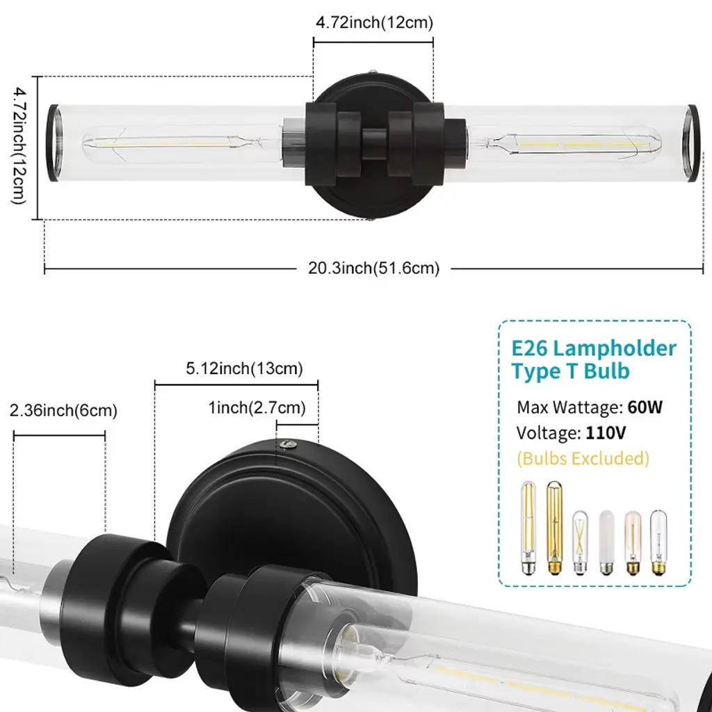 Elevate your space with this elegantly simple wall light, blending industrial charm and modern elegance. The sleek metal frame paired with transparent glass shades creates a versatile design that functions as both ambient lighting and decorative art. Perfect for placement beside mirrors, in bathrooms (vanity/powder rooms), bedrooms, entryways, or hallways. Includes 2 E26 sockets (Type T bulbs, 60W max each, 110V) with heat-resistant safety design. Dimmable for adjustable ambiance. Bulbs not included.