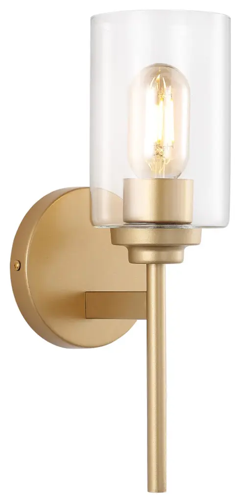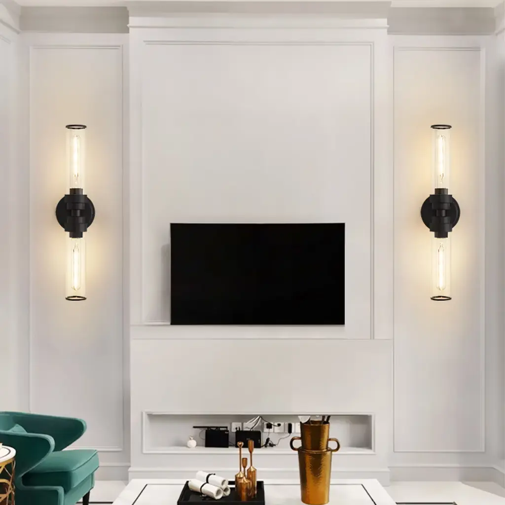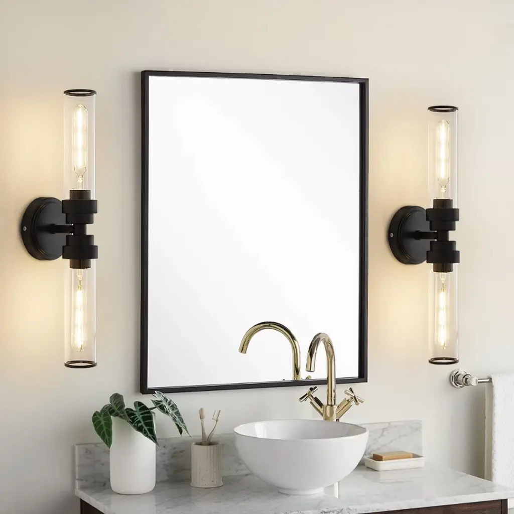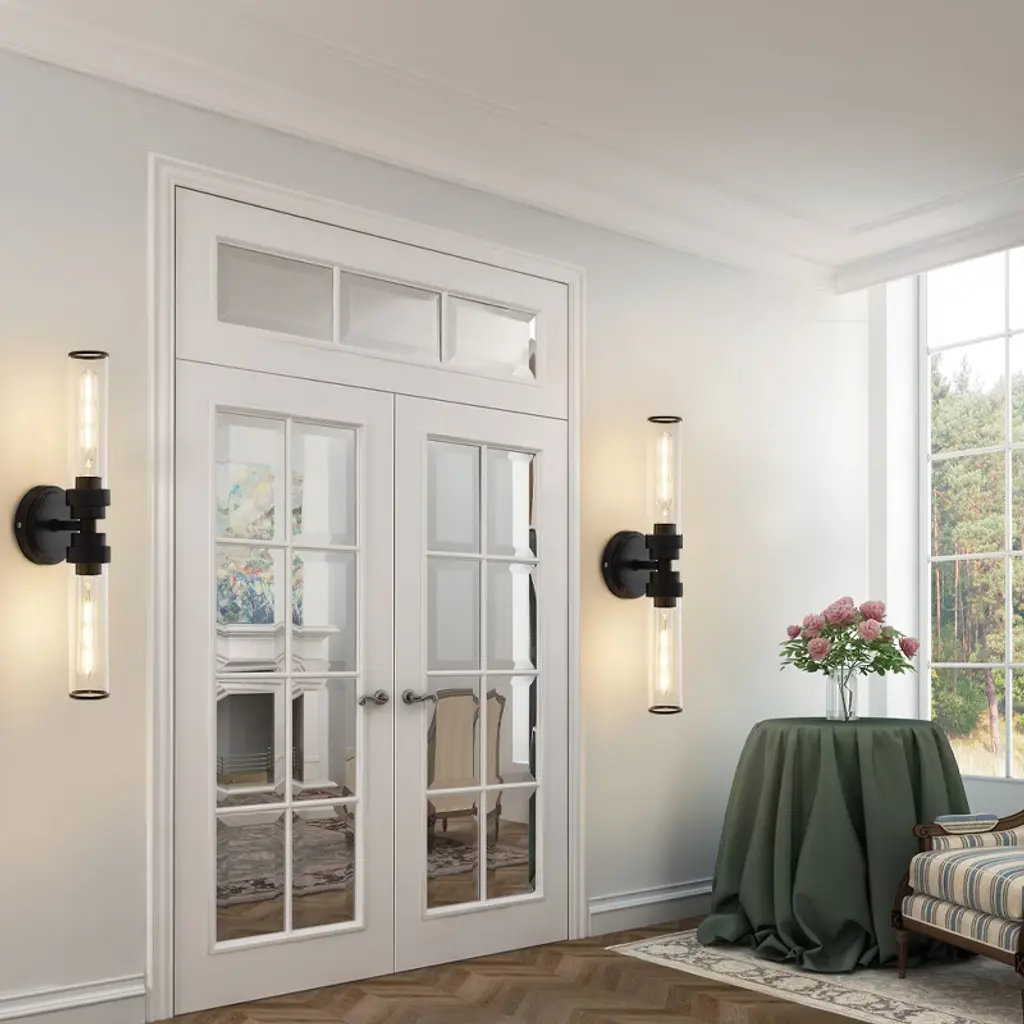 Elevate your space with this elegantly simple wall light, blending industrial charm and modern elegance. The sleek metal frame paired with transparent glass shades creates a versatile design that functions as both ambient lighting and decorative art. Perfect for placement beside mirrors, in bathrooms (vanity/powder rooms), bedrooms, entryways, or hallways. Includes 2 E26 sockets (Type T bulbs, 60W max each, 110V) with heat-resistant safety design. Dimmable for adjustable ambiance. Bulbs not included.