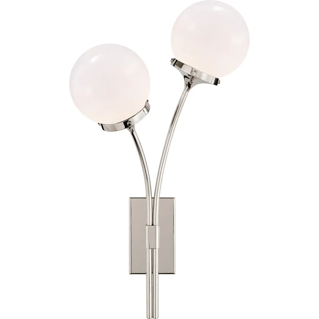 Fixed to a polished nickel backplate with two arcing arms and glass globe shades, we love this sconce for flanking either side of the bed. Hardwired.
