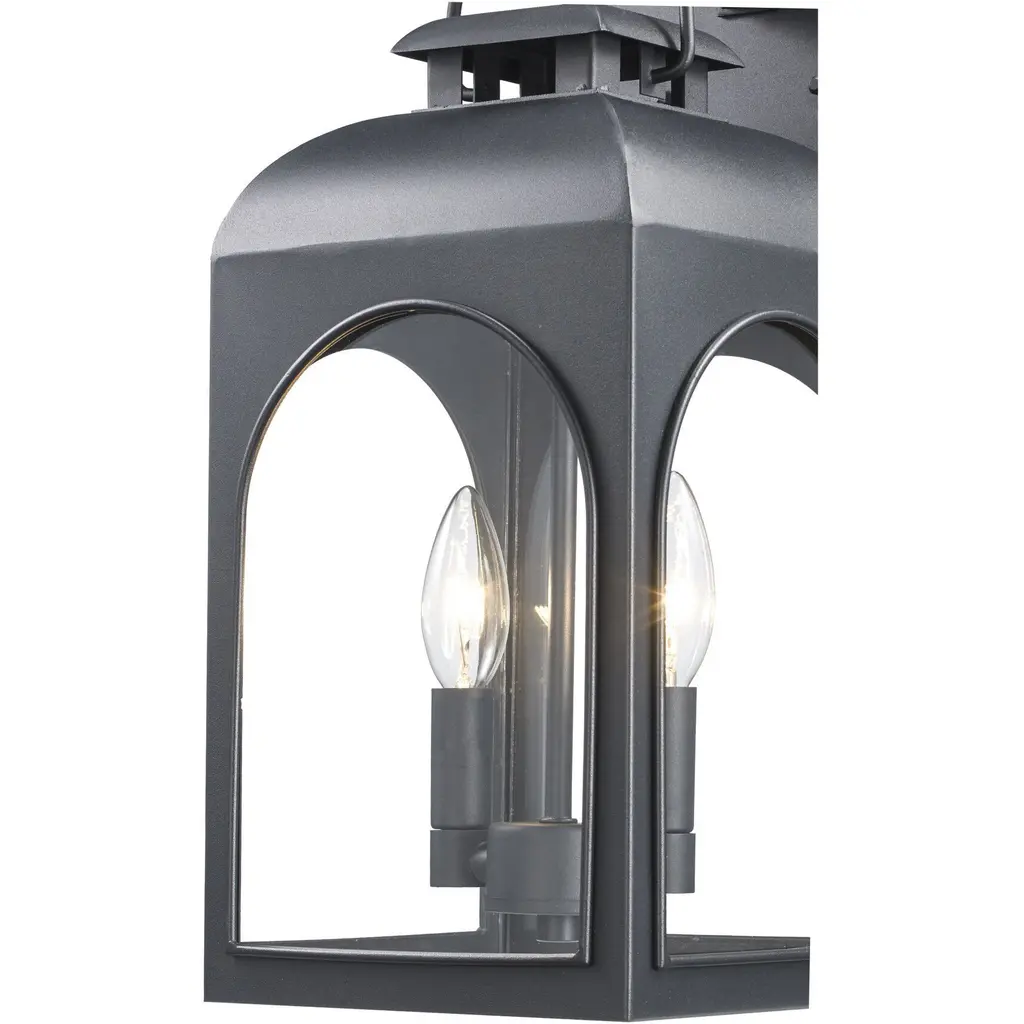 Our Presence Collection of Colonial, coach style lantern light fixtures feature an arched metal body, a decorative carriage handle on top and clear glass sides. The clear glass windows allow for maximum illumination from 2-light bulbs. A wet, outdoor rating provides the confidence to install this 2-light, armed wall lantern on any house, garage, or barn wall. A matching squared, metal wall plate, all hardware and installation material are included. Two candle style light bulbs are required, and sold separately, not included with this outdoor wall sconce fixture. The Presence Collection offers a complete selection of fixtures to fit nearly any outdoor application or requirement.