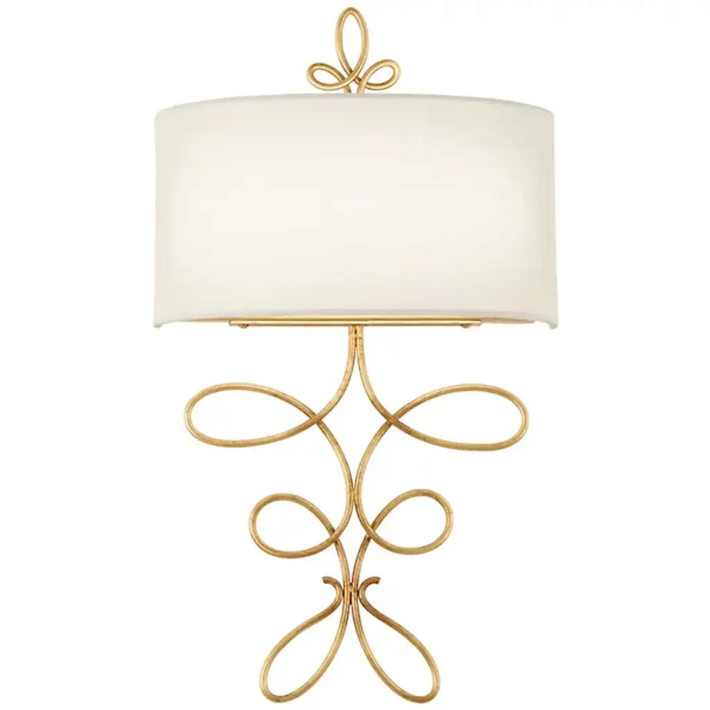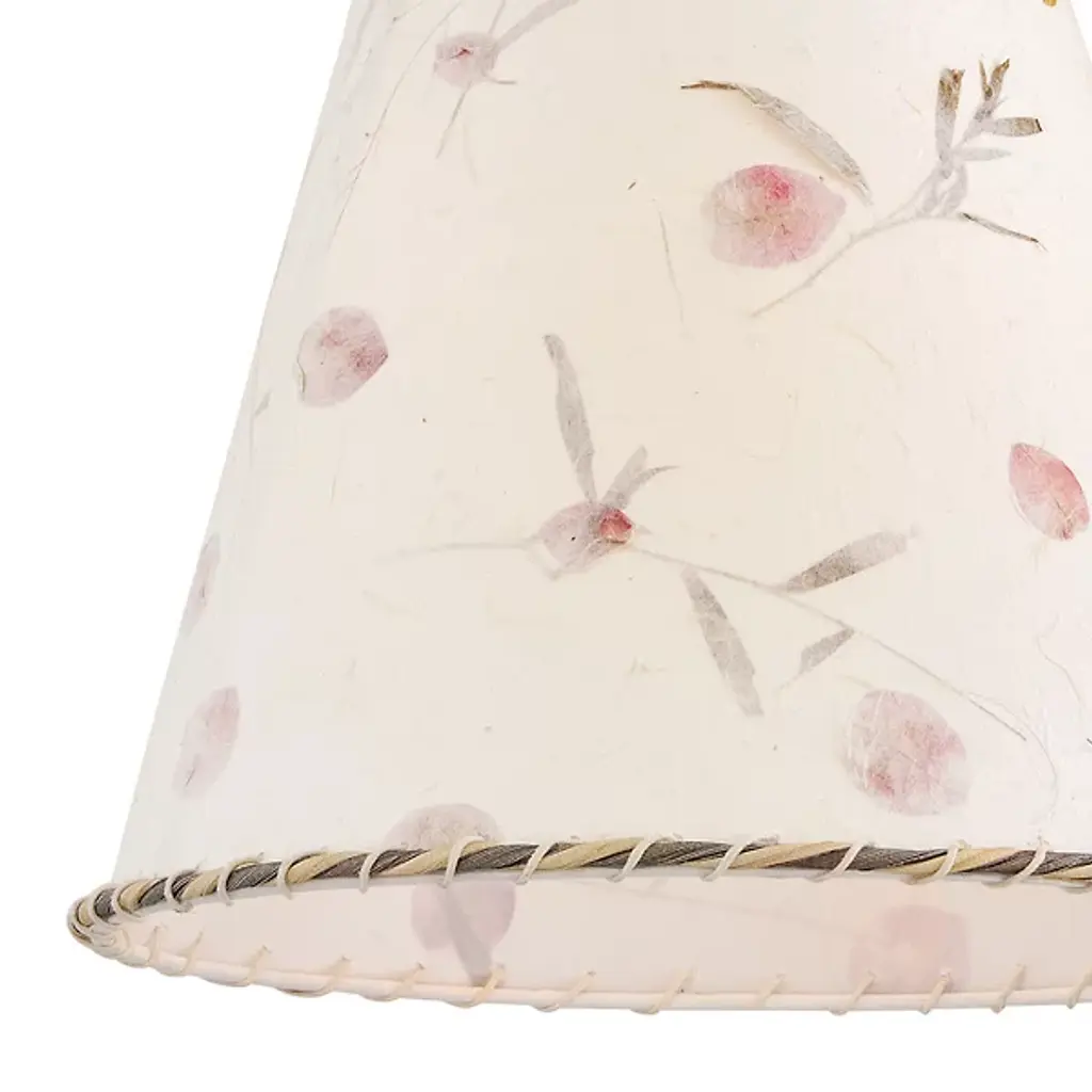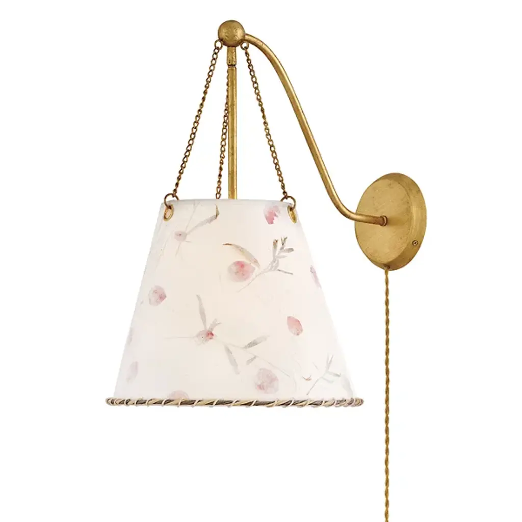 The Primrose Wall Sconce from Hinkley brings thoughtful detail and transitional charm to interiors. A beveled disc wall plate anchors the entire design, from which a slender steel arm extends, accented by a small globe detail. The focal point is a flared shade made from handcrafted paper embedded with real pressed flowers, suspended with delicate chains and casting a warm, textured glow. A twisted rope trim around the base of the shade adds a more rustic tone, making this unique sconce unique and softly atmospheric.