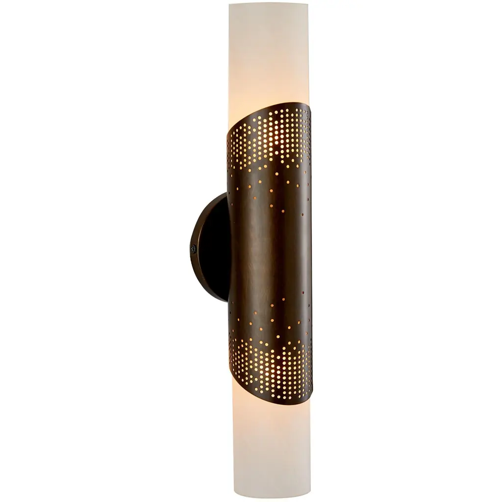 Guide the eyes from one space to the other with the elegantly silhouetted Profiles LED Cylindrical Wall Sconce from Ultralights. The tight, compact form of this piece makes near any wall a great candidate. Handcrafted in Tucson, Arizona, sharp metal rounds in a two-part cylinder, one side with a flat surface and the other with an elegant ornamental pattern. The fine pattern jumps from the wall as an LED ambient light shines behind it to create a radiant background.