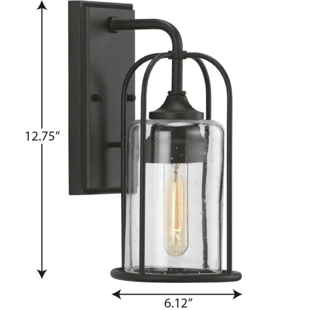Introducing the Progress Lighting Watch Hill Collection 1-Light Textured Black Clear Seeded Glass Farmhouse Outdoor Small Wall Lantern Light. Crafted from durable aluminum with a timeless textured black finish, this small wall lantern measures 7.37" in width, 12.75" in height, and 6.12" in length. The elongated cage design and gracefully curving slender arms evoke a Victorian-era gaslight aesthetic, while the clear seeded glass shade adds a touch of elegance. This wet-rated outdoor light fixture accommodates 1 incandescent bulb with a maximum wattage of 60 watts, making it both stylish and functional for your outdoor space. With a backplate height of 9.00" and a width of 4.50", this lantern is a perfect addition to any home style.