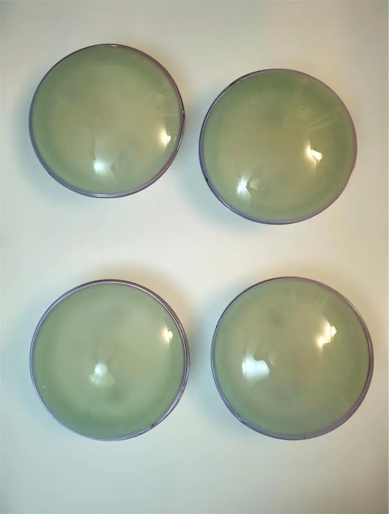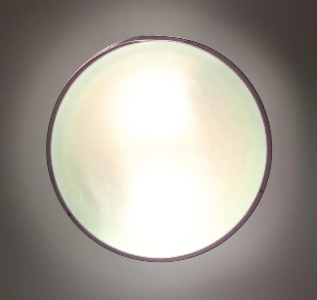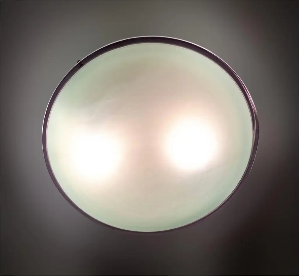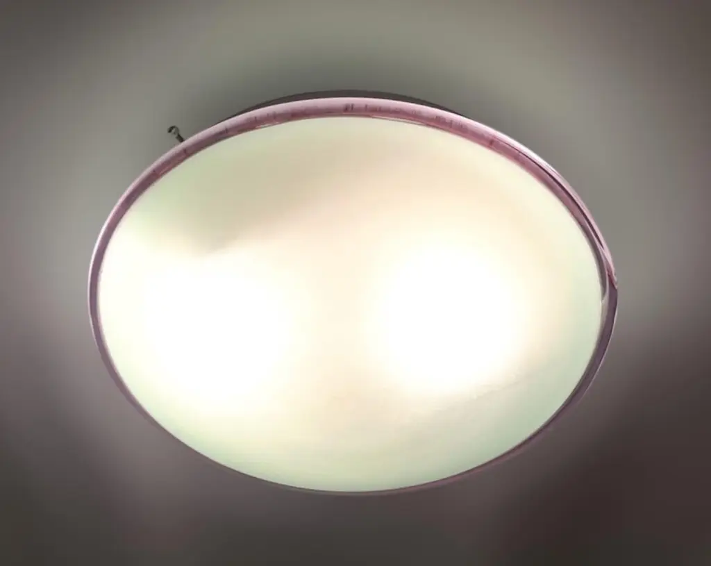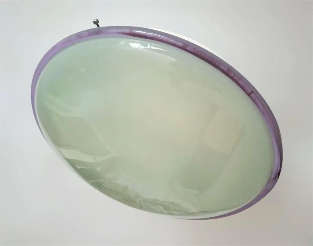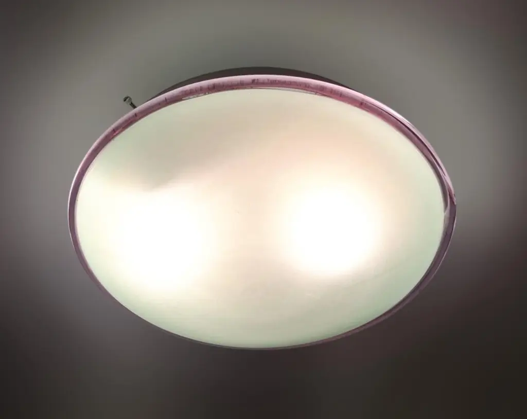 Vintage Italian flush mount or wall light with a frosted light gray green Murano glass shade enclosed in purple border / Made in Italy in the style of Venini, circa 1960sMeasures: diameter 16 inches, height 5.5 inches2 lights / E26 or E27 type / max 60W each4 available in stock in Italy, price listed is for each itemOrder reference #: FABIOLTD L3