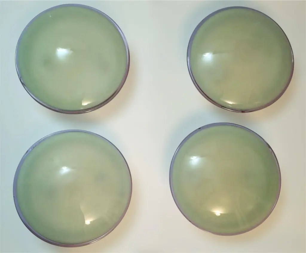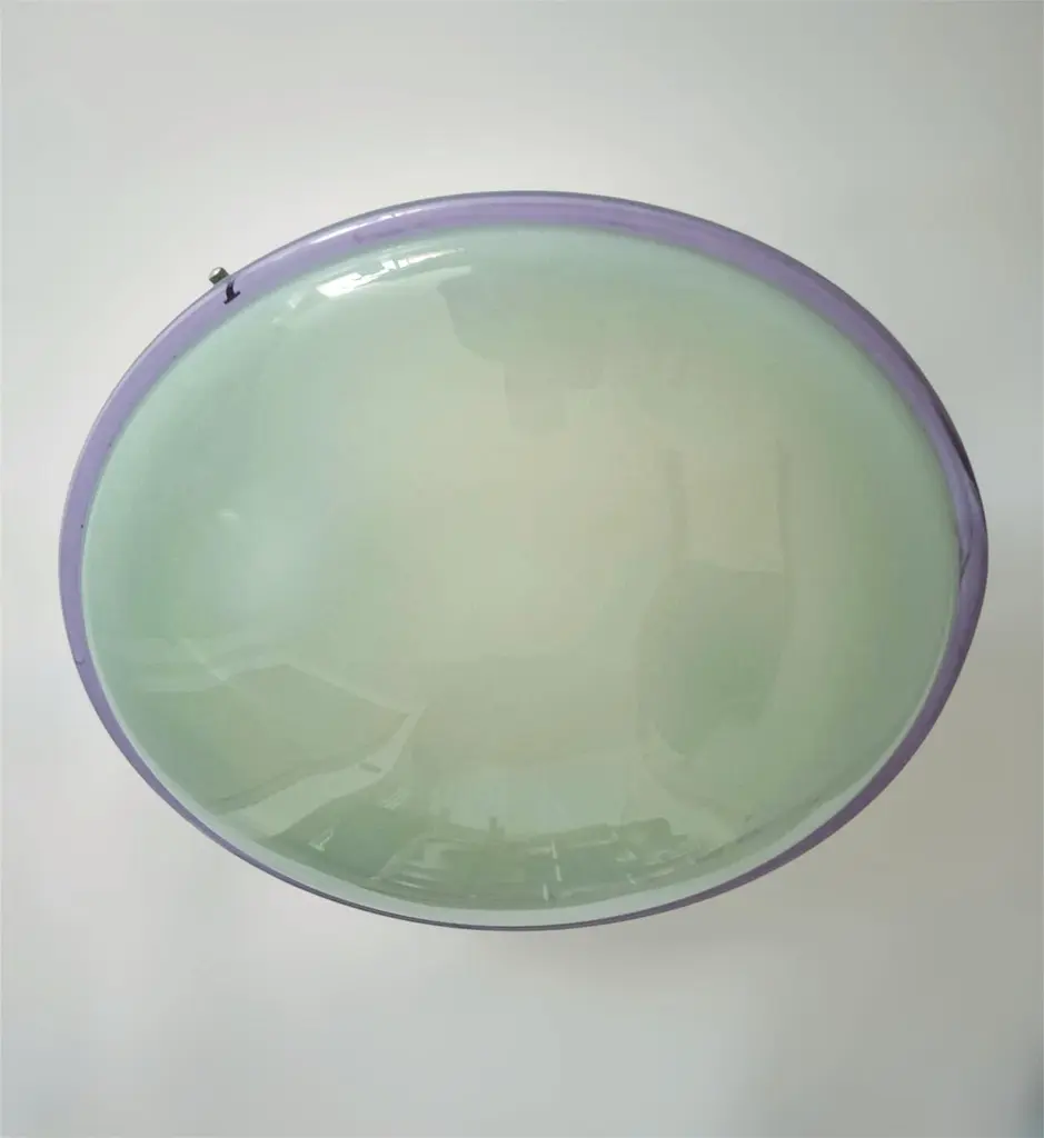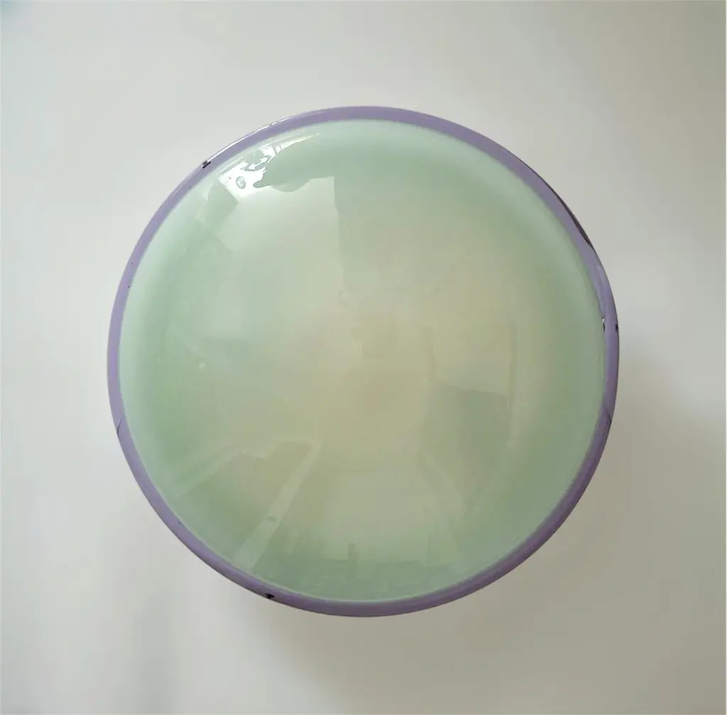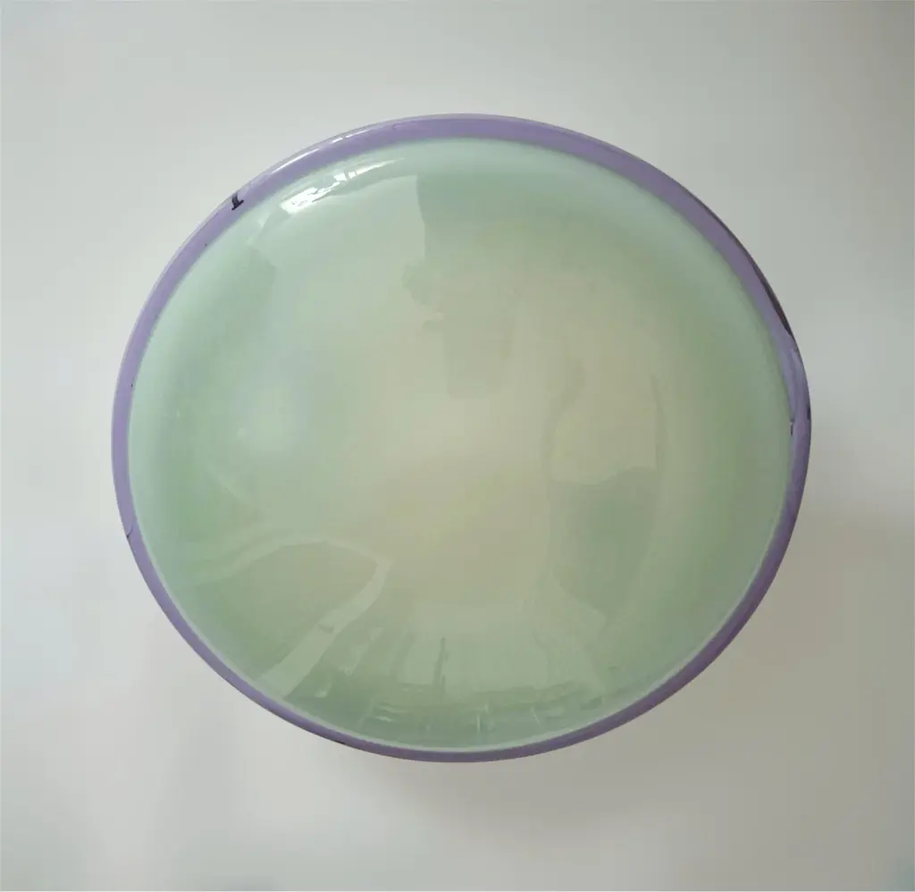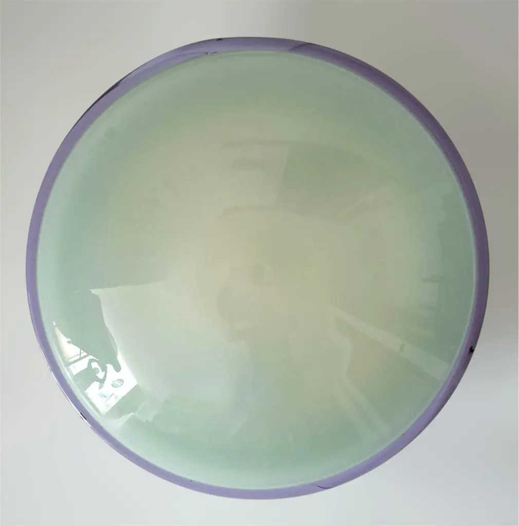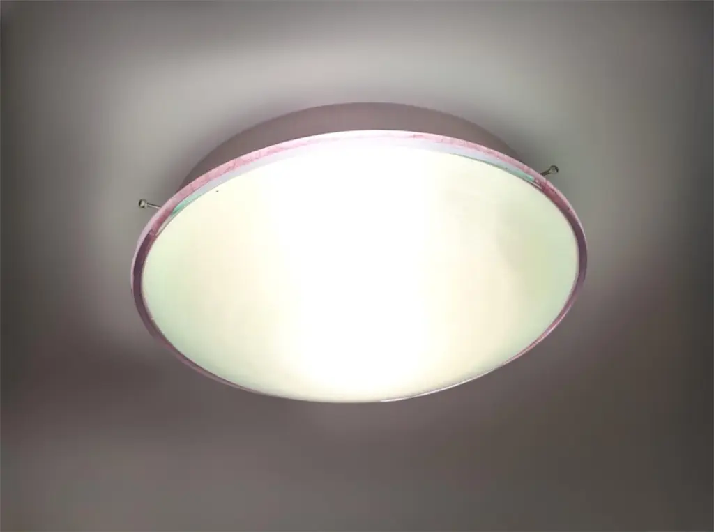 Vintage Italian flush mount or wall light with a frosted light gray green Murano glass shade enclosed in purple border / Made in Italy in the style of Venini, circa 1960sMeasures: diameter 16 inches, height 5.5 inches2 lights / E26 or E27 type / max 60W each4 available in stock in Italy, price listed is for each itemOrder reference #: FABIOLTD L3