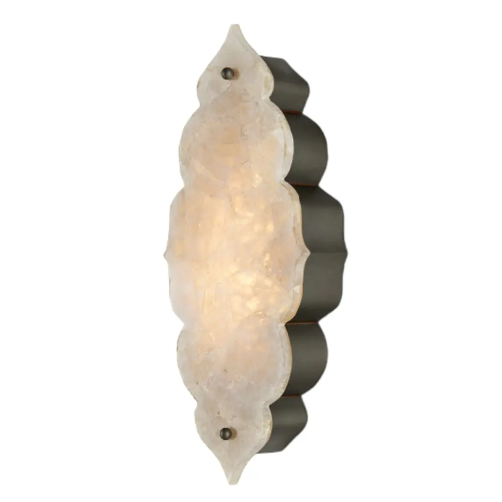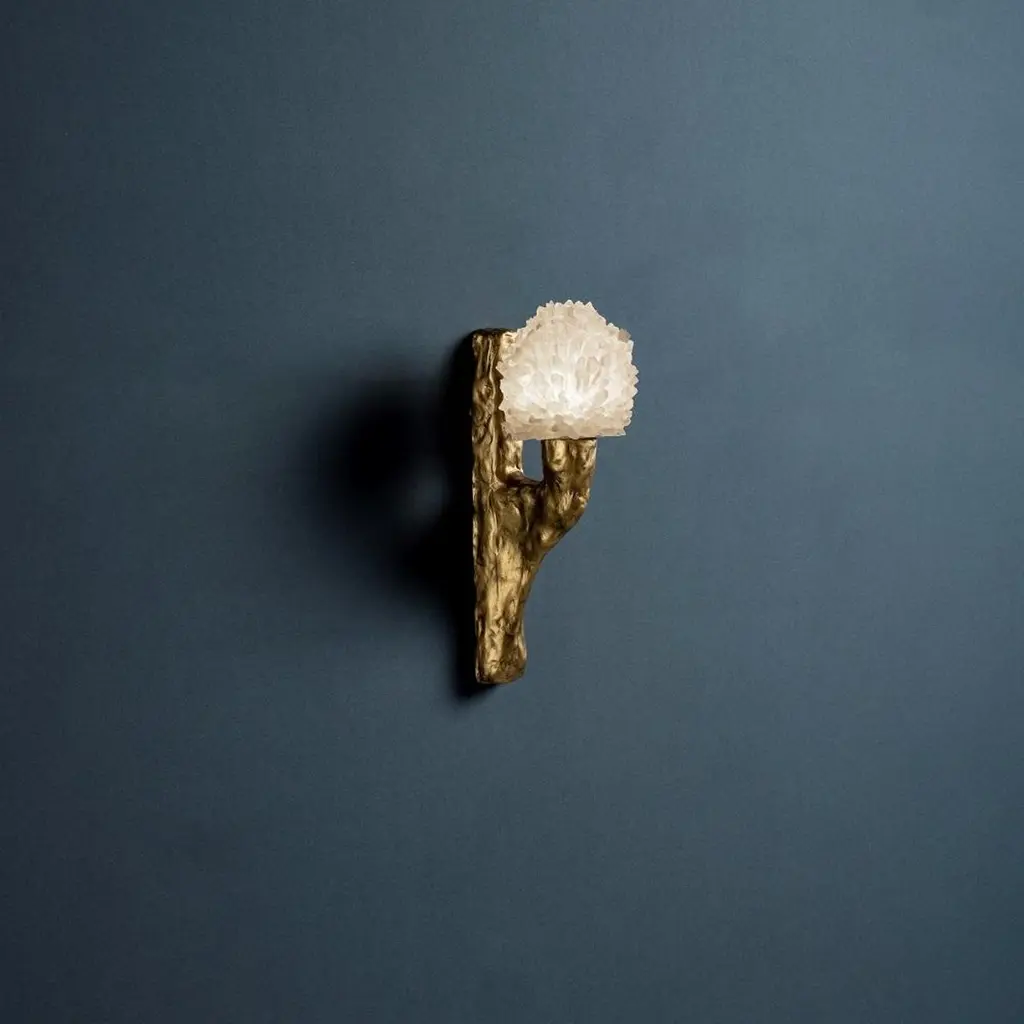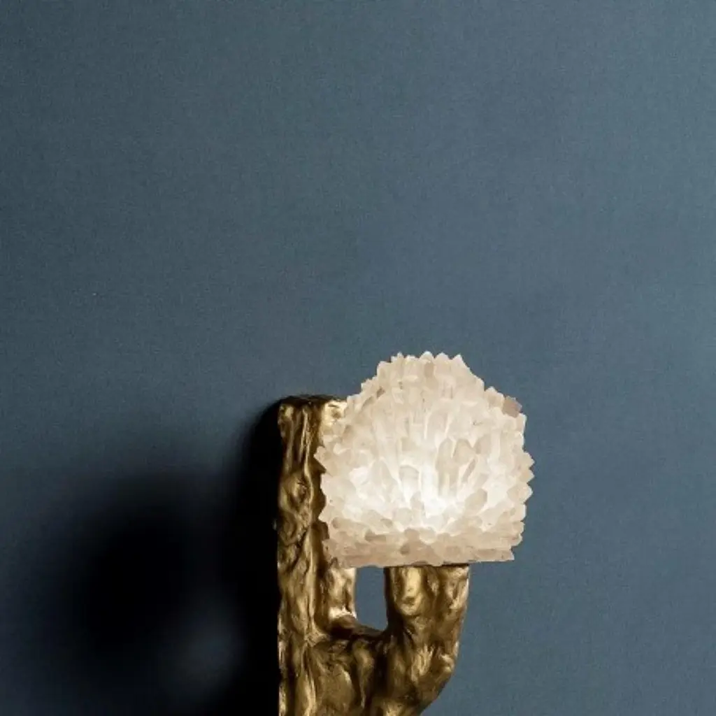 Quartz wall sconce I by AverDimensions: W 4 x D 17 x H 35 cmMaterials: Natural rocks, high-quality cut crystals, jewelry chains, hand-blown glass, other.Also Available: Matte Black, Rustic Silver, Oxidized Graphite, and Rustic Bronze.A series of lamps molded in a lively, imperfect, and organic ceramic texture, in contrast to the slender and objective silhouette of its structure. Its light source consists of a sculptural formation of translucent quartz tips that emit a warm and cozy glow to the viewer. Its name is a tribute to the Etruscan civilization that lived in the Italian peninsula and is known for its exquisite works of art in ceramics, bronze, and precious stones.All our lamps can be wired according to each country. If sold to the USA it will be wired for the USA for instance.