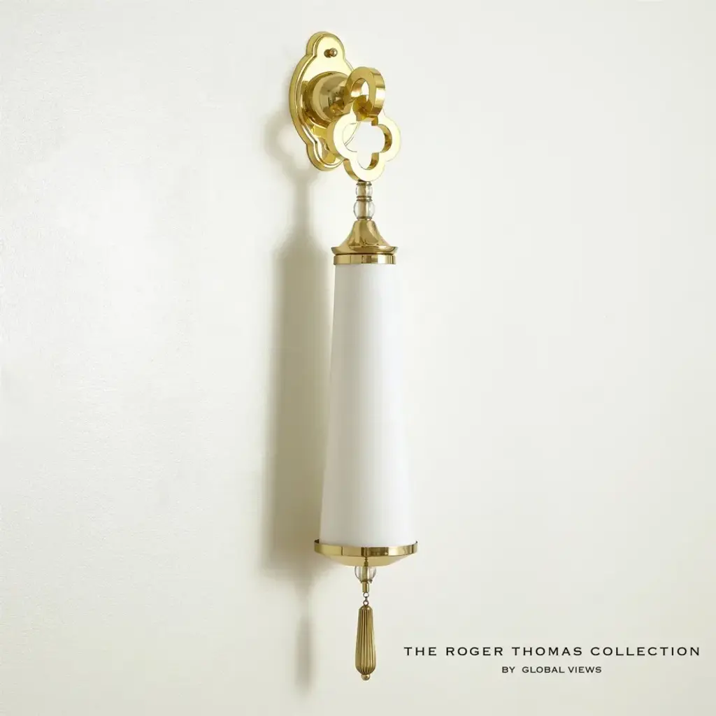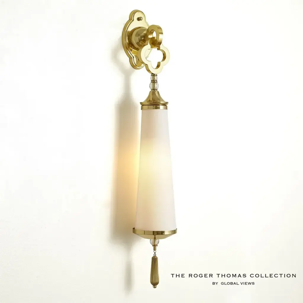 Roger Thomas was inspired by chinoiserie, the most exotic influence of the 18th century decorative arts. Reinvent it's romance for the 21st century with our pendant sconce. Made of solid brass with a quatrefoil design on the back plate. Crisp, pleated bottom finial. Hardback fabric shade. From a fashion forward perspective, Global Views offers accessories, furniture, statement lighting, and an assortment of rugs and mirrors to add beauty and joy to your home.